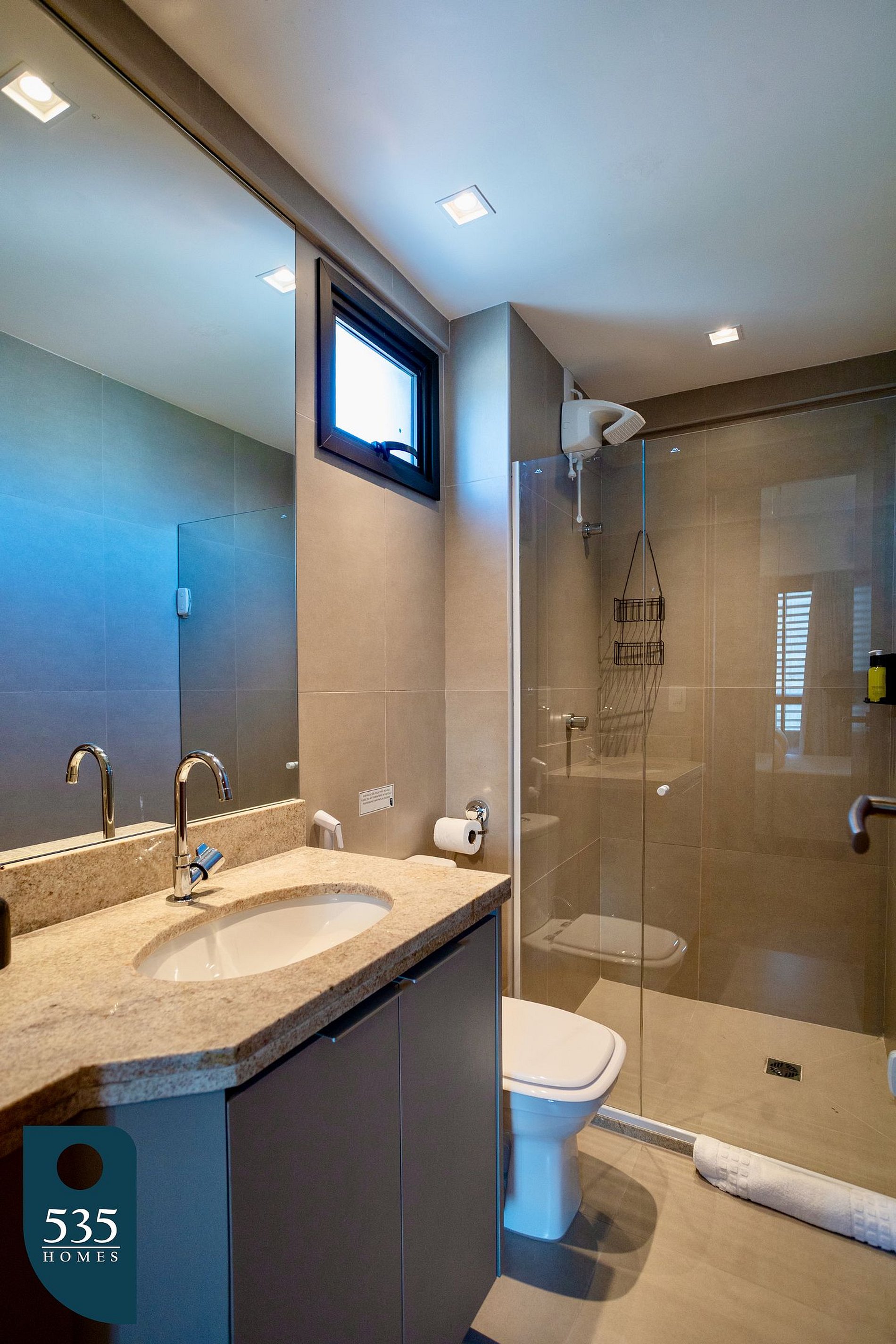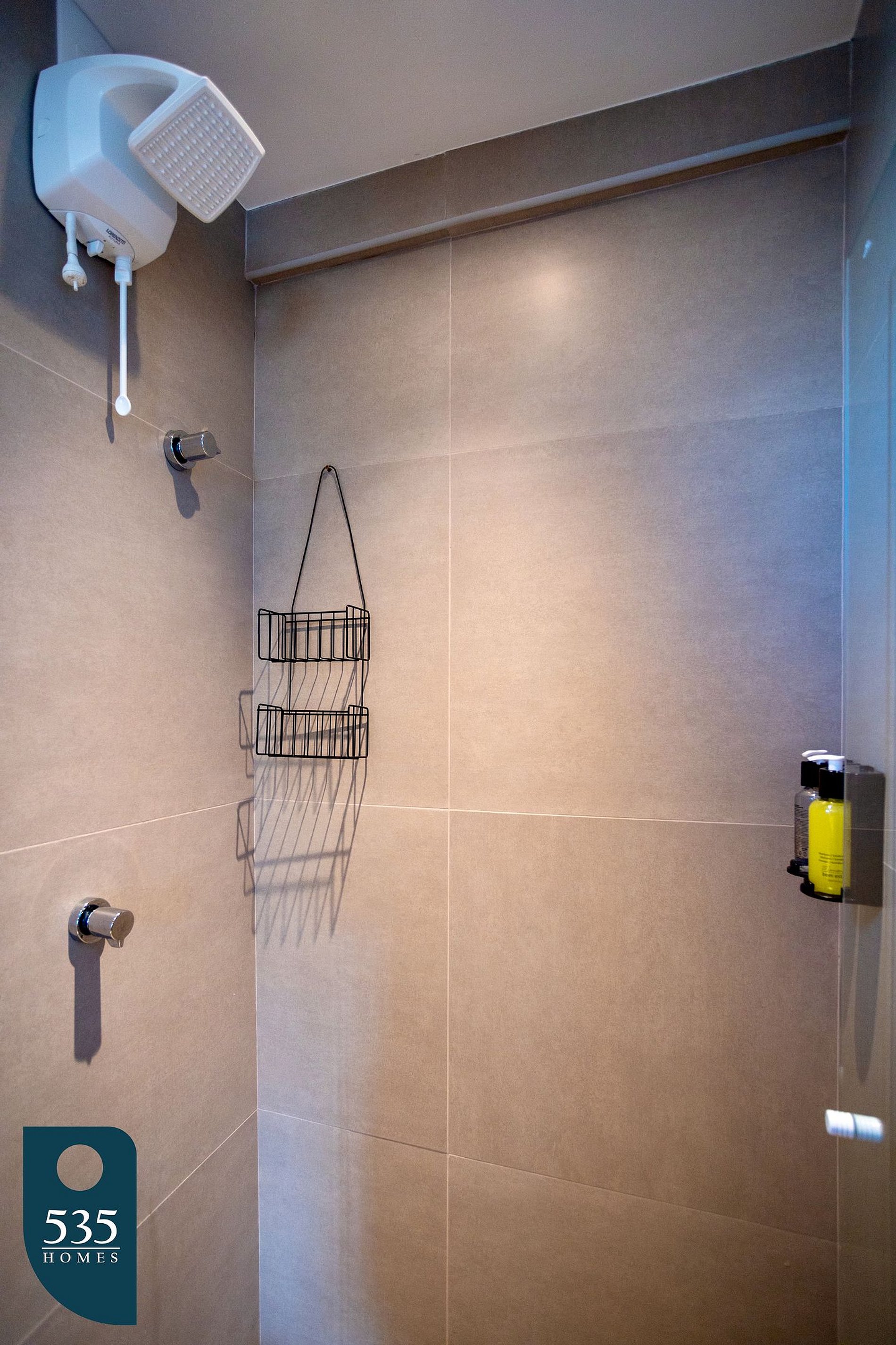 O banheiro é moderno e bem equipado, com chuveiro elétrico, ducha higiênica, secador de cabelo e lixeira, oferecendo praticidade no dia a dia. Também estão disponíveis balde e pregadores de roupa para quem precisar.