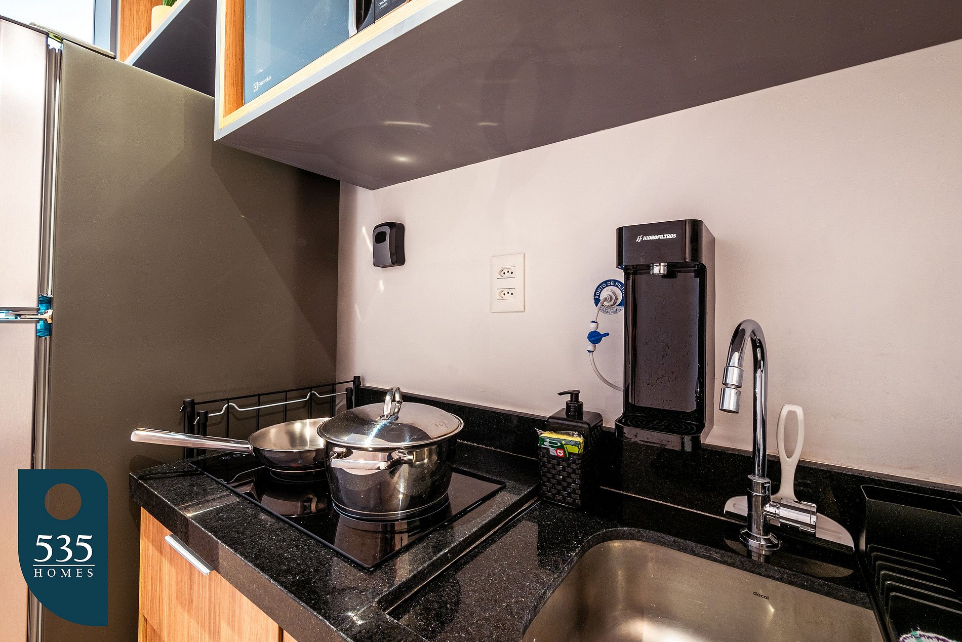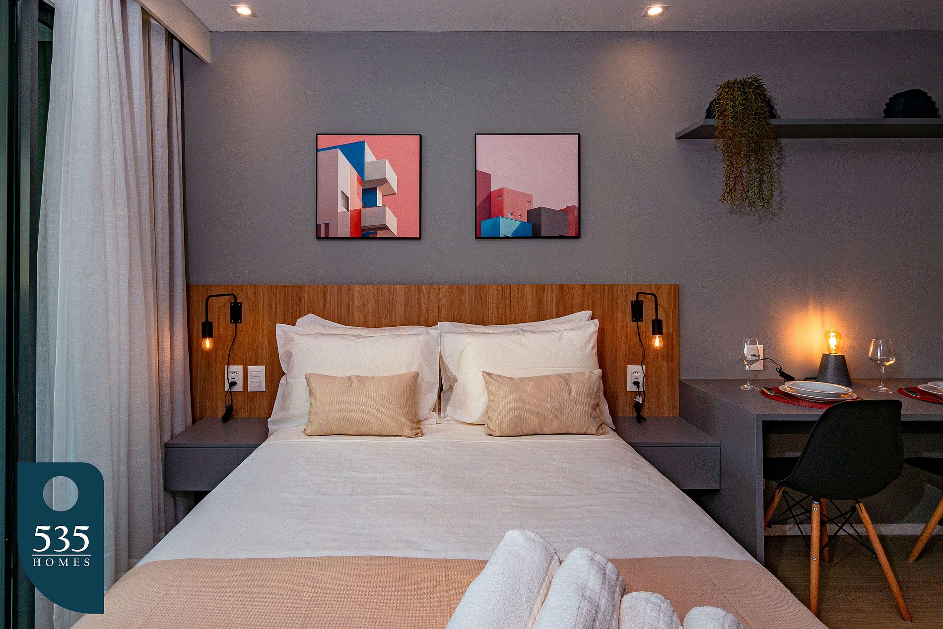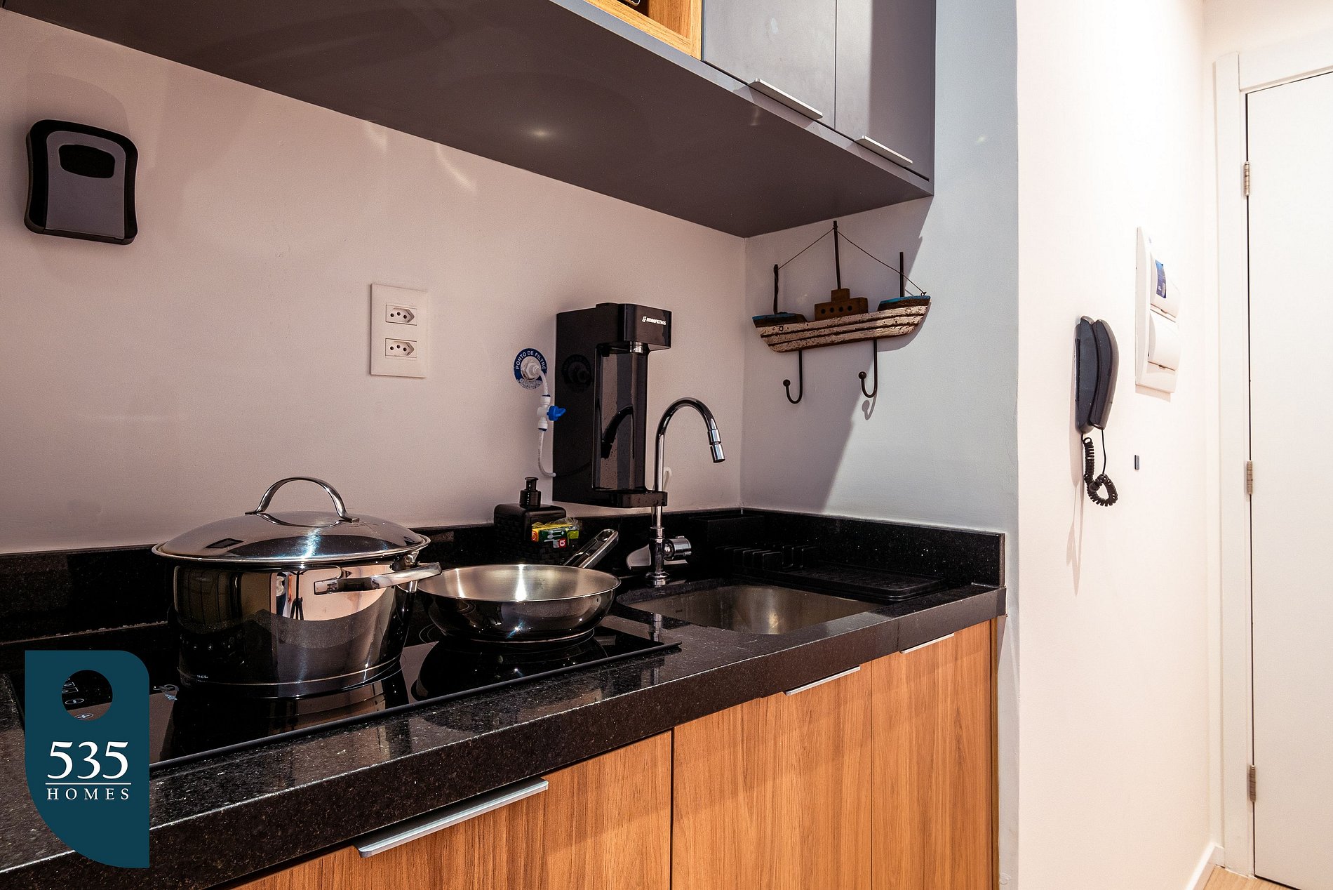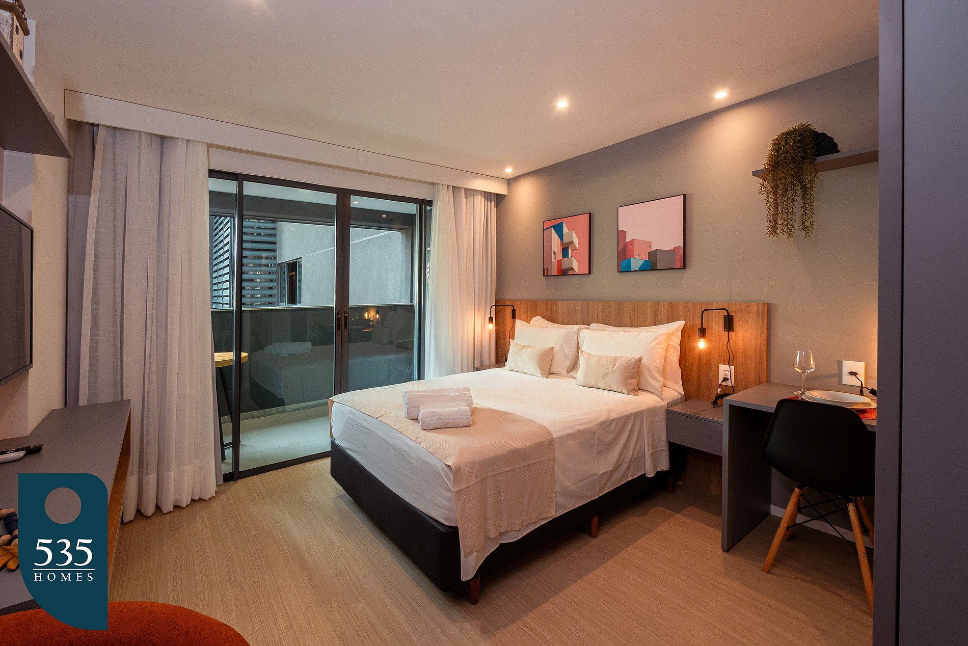 Na cozinha, você conta com um espaço completo e funcional, ideal para preparar desde refeições rápidas até pratos mais elaborados. O ambiente dispõe de cooktop de indução com duas bocas, micro-ondas, geladeira, purificador de água, cafeteira elétrica, liquidificador, mini liquidificador, sanduicheira e uma ampla variedade de utensílios. Tudo foi pensado para garantir praticidade e comodidade durante sua estadia. O quarto é confortável e bem equipado, com Smart TV de 43”, ar-condicionado, cortina blackout, espelho de corpo inteiro, poltrona, cabides, cabideiro de parede e luminárias laterais. Conta ainda com cadeiras que podem ser usadas em uma estação de trabalho, atendendo também quem precisa de praticidade para estudar ou trabalhar. O banheiro oferece praticidade e bem-estar, com ducha higiênica, secador de cabelo, dispenser de sabonete, porta-escova, toalheiros, lixeira com pedal e espelho amplo. Na varanda, a mesa com cadeiras proporciona um espaço agradável para refeições ou momentos de relaxamento ao ar livre. Para facilitar a rotina até mesmo em estadias mais longas, o apartamento conta ainda com ferro e mesa de passar roupa, varal de chão, pregadores, além de itens de limpeza como vassoura, rodo e pá de lixo.