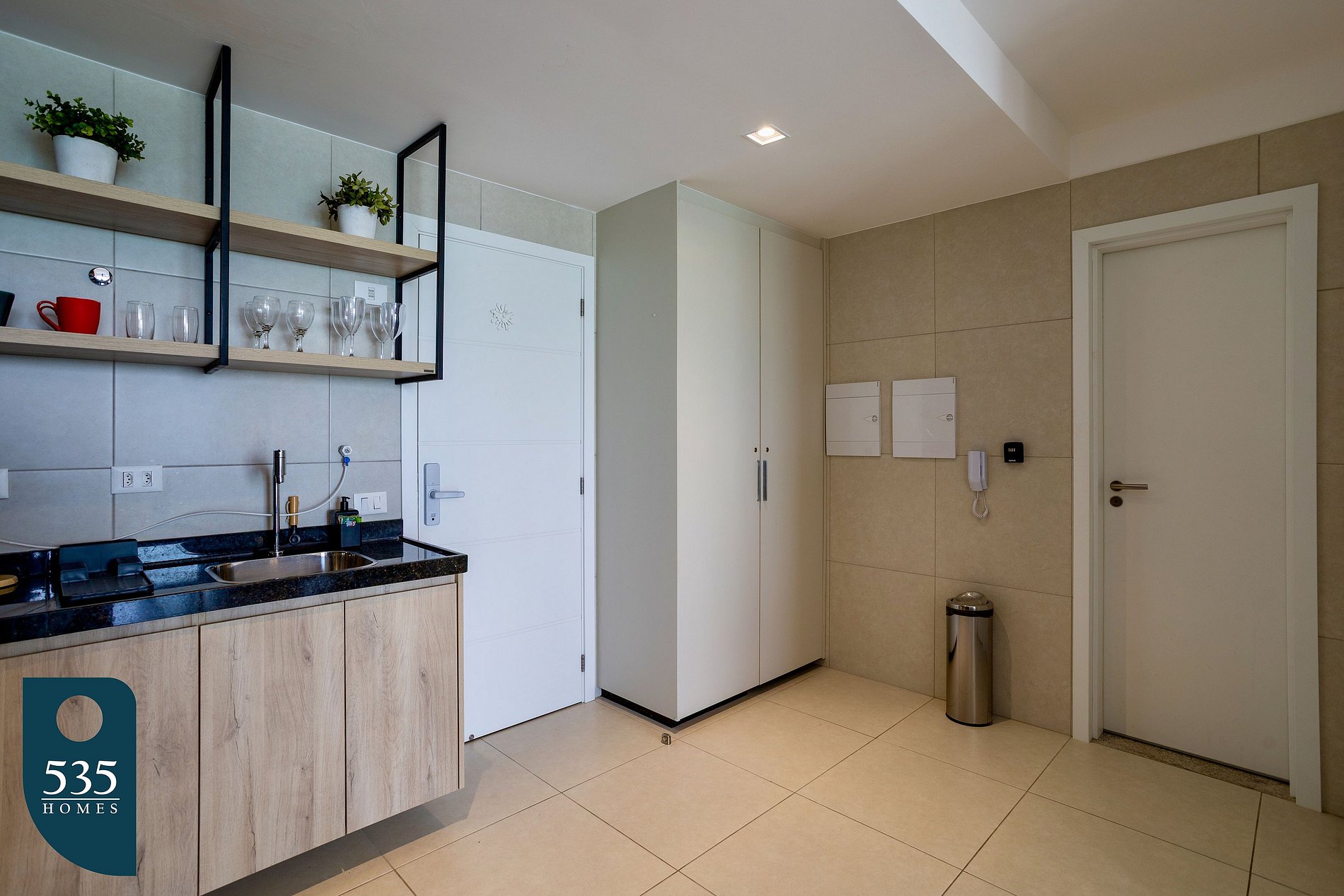 O apartamento por temporada é totalmente mobiliado e equipado para oferecer conforto e praticidade durante a estadia. A cozinha dispõe de cooktop de indução com quatro bocas, geladeira, frigobar, bebedouro elétrico, micro-ondas, cafeteira italiana, máquina de café, liquidificador, sanduicheira, jogo de panelas com tampas, frigideira, talheres, utensílios de cozinha, abridor de vinho e de latas, jogo de facas, jogo americano, descascador de verdura, espremedor de limão e de alho. A lavanderia conta com vassoura, pá de lixo, rodo de chão, balde, varal de chão e pregadores de roupa. A sala está equipada com ar-condicionado, Smart TV de 44 polegadas, ventilador de teto com controle remoto, mesas de apoio laterais e cortina. O banheiro dispõe de exaustor, secador de cabelo, ducha higiênica, chuveiro elétrico, toalheiro e espelho. O quarto oferece ar-condicionado, cabides, cortina com blackout, tábua e ferro de passar roupa, além de ventilador de teto com controle remoto. A varanda conta com mesa e cadeira, ideal para relaxar e aproveitar o ambiente externo.