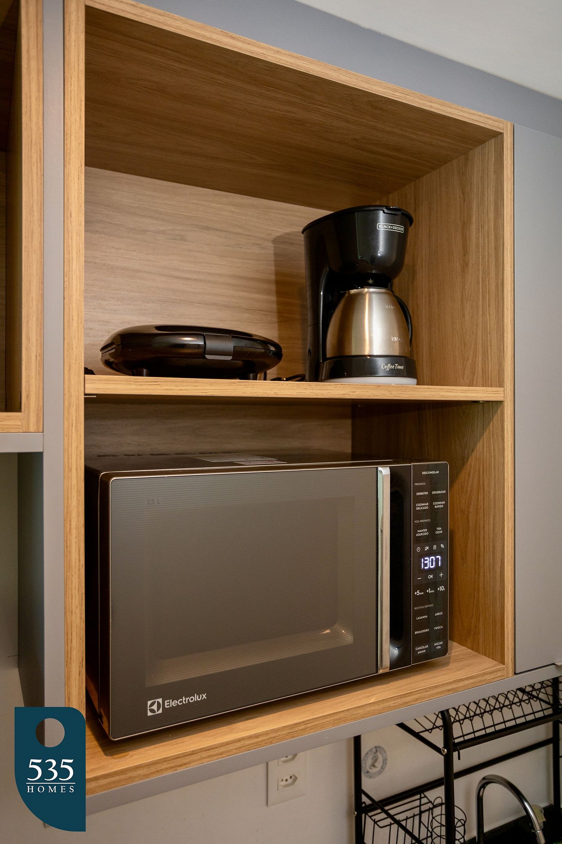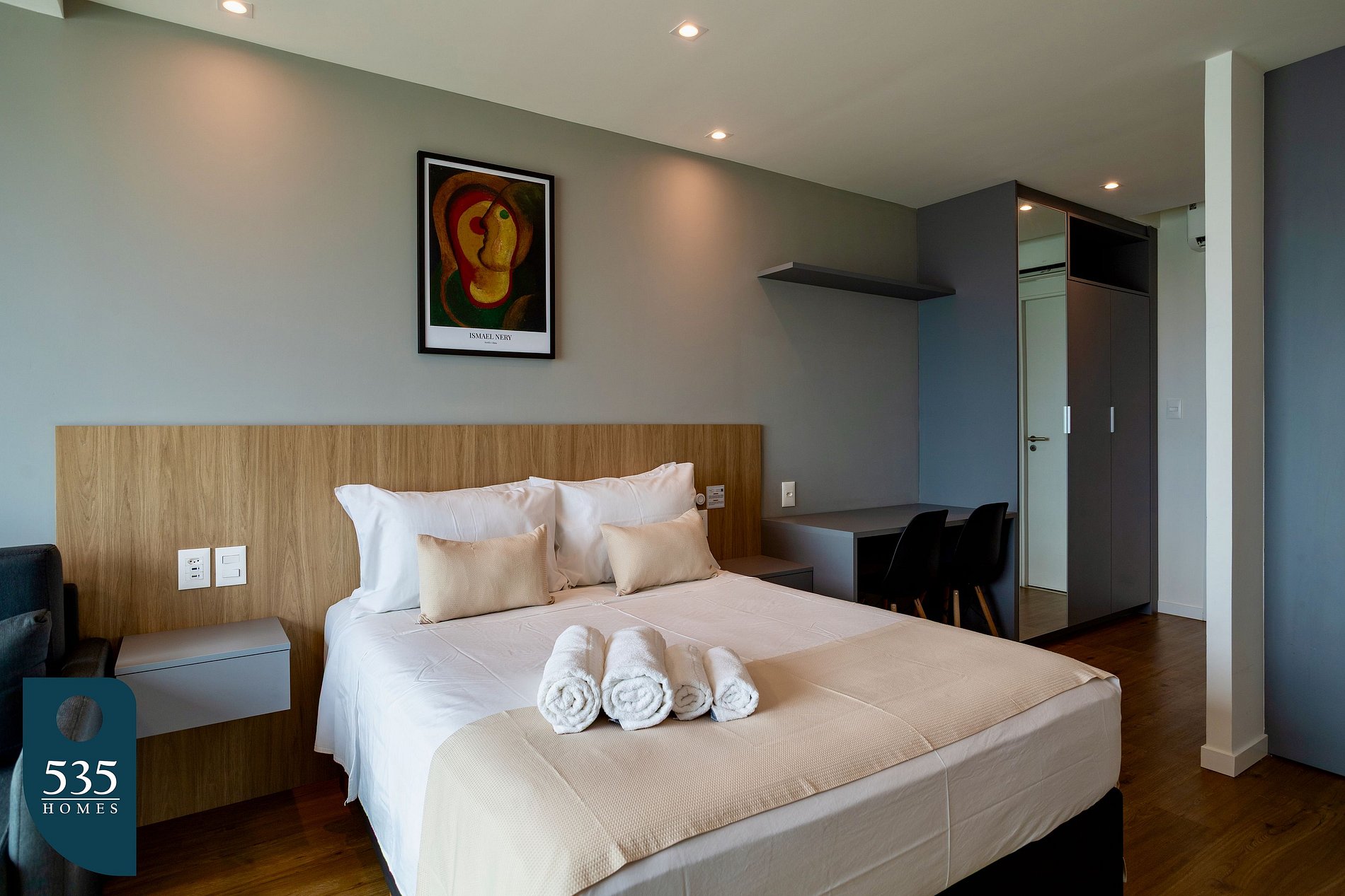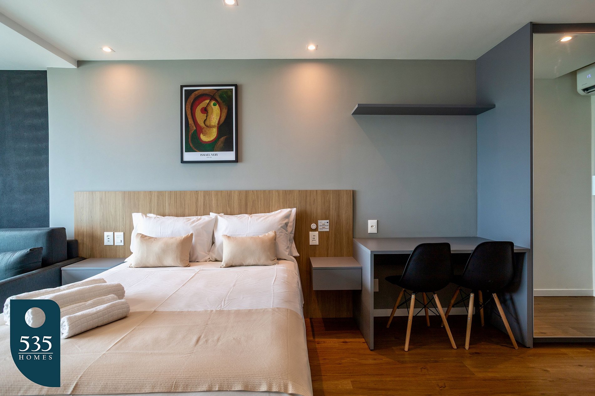 Este apartamento por temporada oferece praticidade e conforto para sua estadia. A cozinha é equipada com geladeira, micro-ondas, cafeteira elétrica, cafeteira italiana, sanduicheira, liquidificador, cooktop vitrocerâmico com duas bocas e jogo de panelas, além de ferro elétrico e tábua de passar roupa para maior conveniência. No quarto integrado à varanda, você encontra cortina blackout, Smart TV de 44" e espelho de corpo, garantindo bem-estar e funcionalidade. O banheiro conta com chuveiro elétrico, exaustor e secador de cabelo, completando a estrutura essencial para uma estadia confortável.