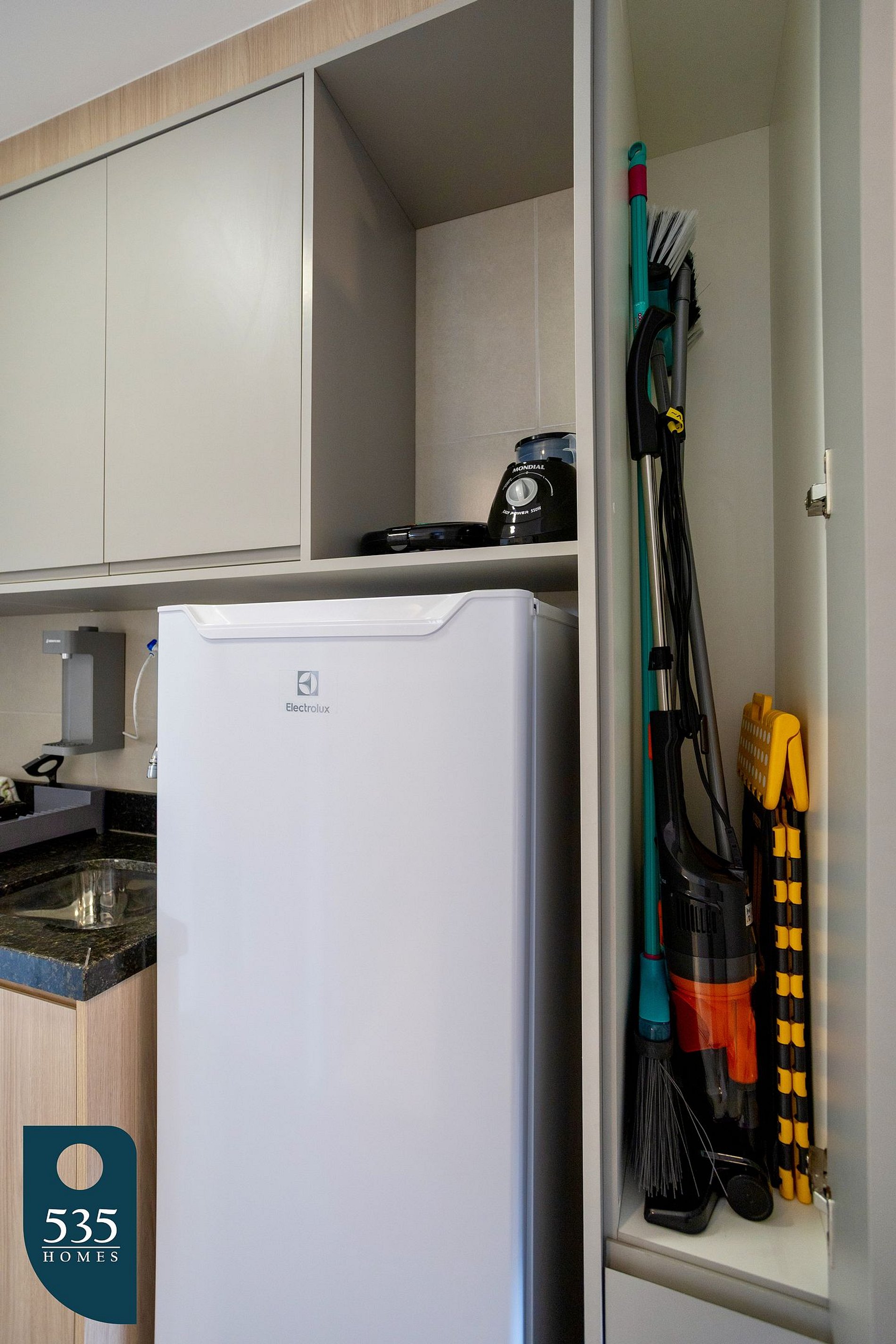 A cozinha dispõe de geladeira, micro-ondas, liquidificador, sanduicheira, purificador de água, cafeteira elétrica, cafeteira italiana, cooktop elétrico com duas bocas e jogo de panelas com tampa, proporcionando praticidade no preparo das refeições.