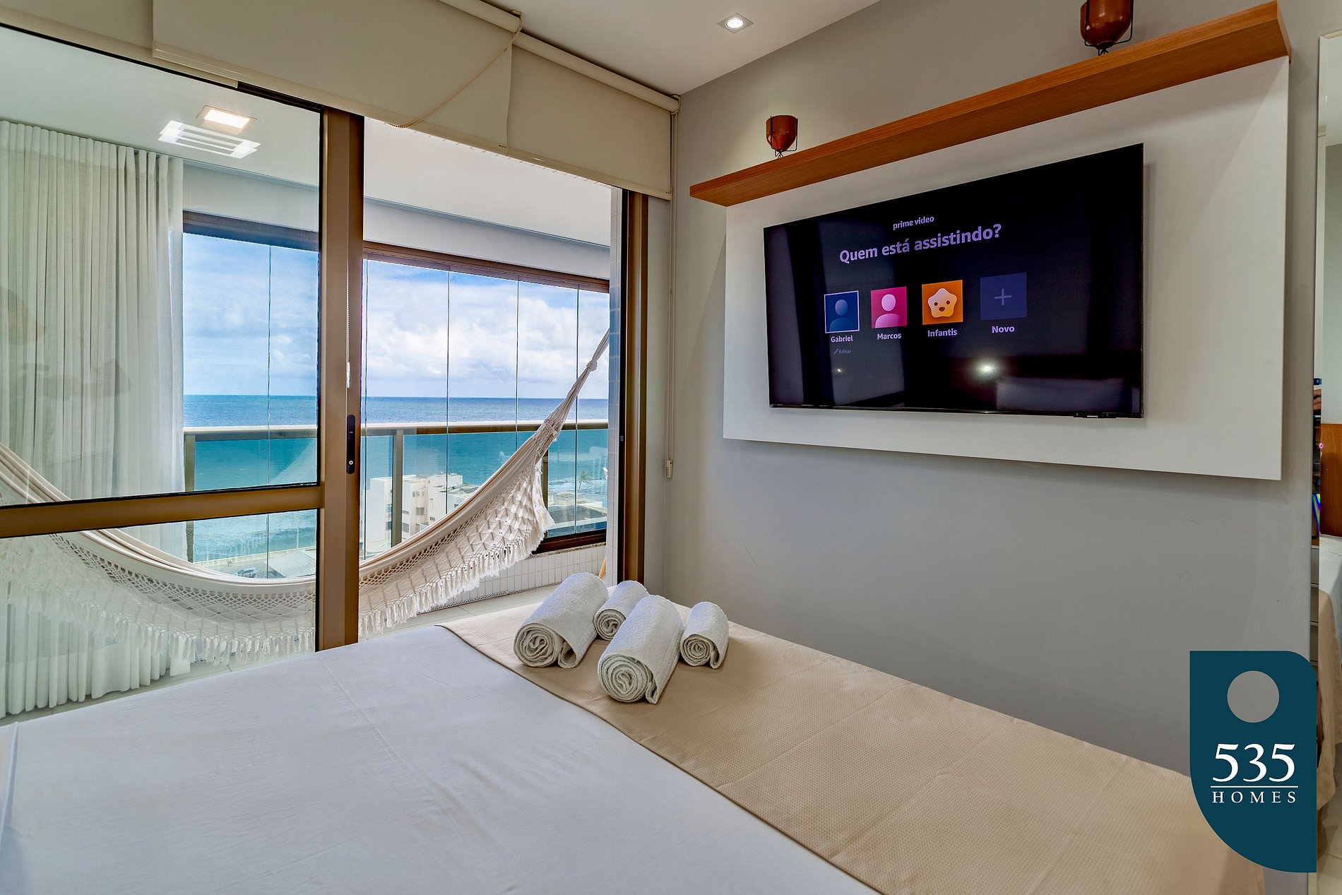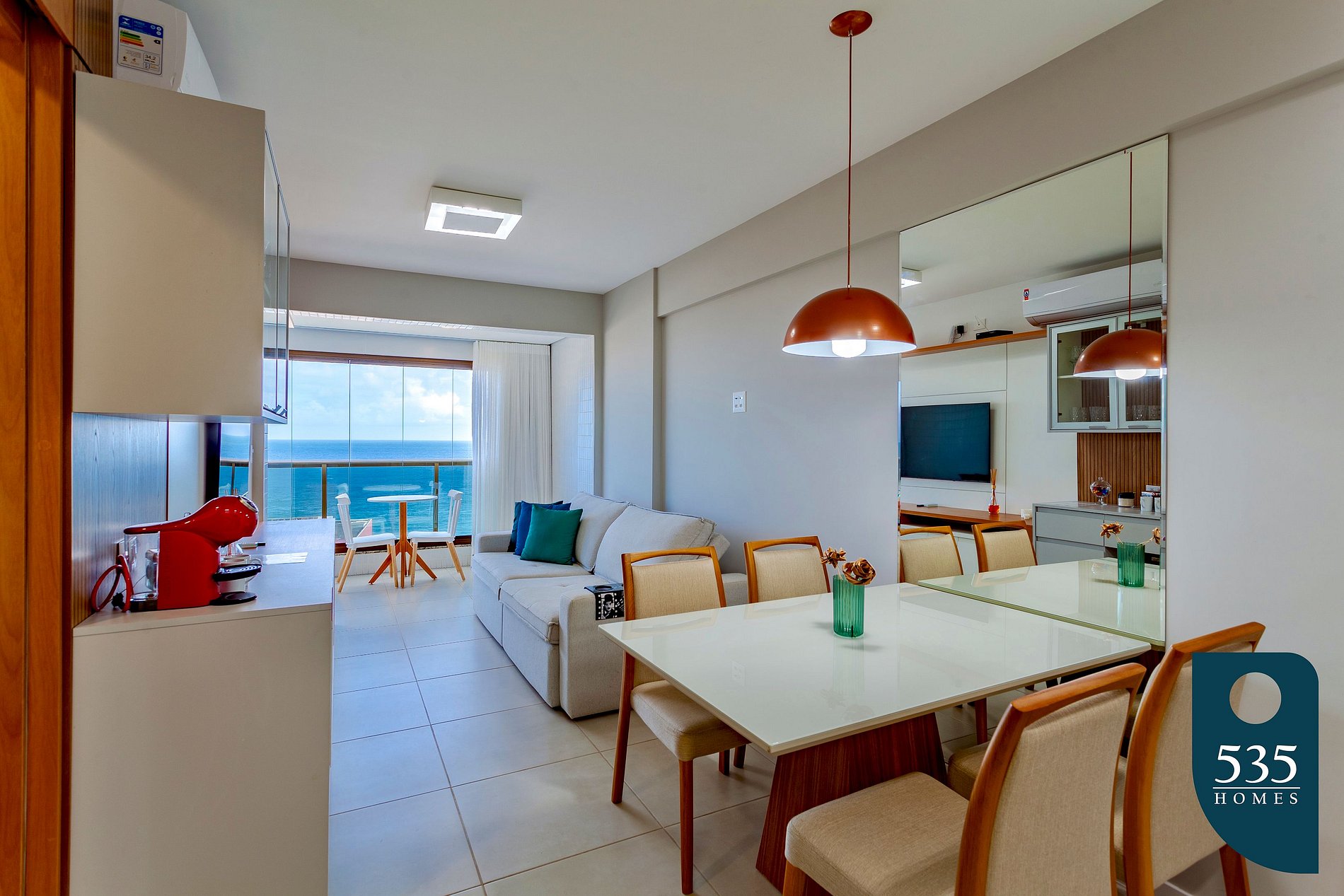 Apartamento incrível, novo com vista para o mar de 48 m² super decorado com sofá cama muito confortável para assistir televisão ou dormir 1 pessoa, quarto com cama Queen, rico em armários e com ar condicionado Split. Varanda integrada para descansar na rede e apreciar a vista para o mar do 6° andar do prédio. Nossa cozinha é espaçosa e equipada com todos os utensílios necessários.