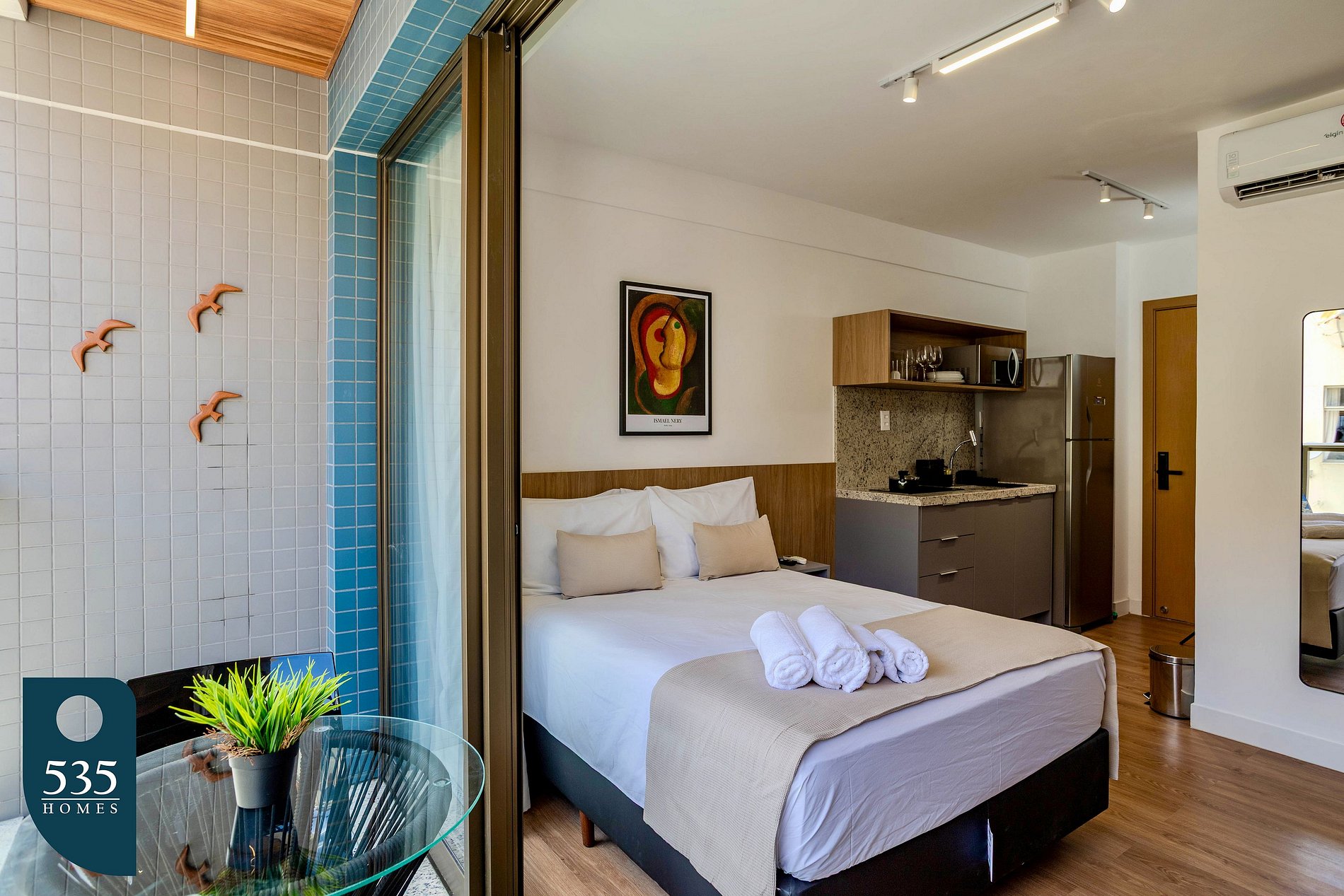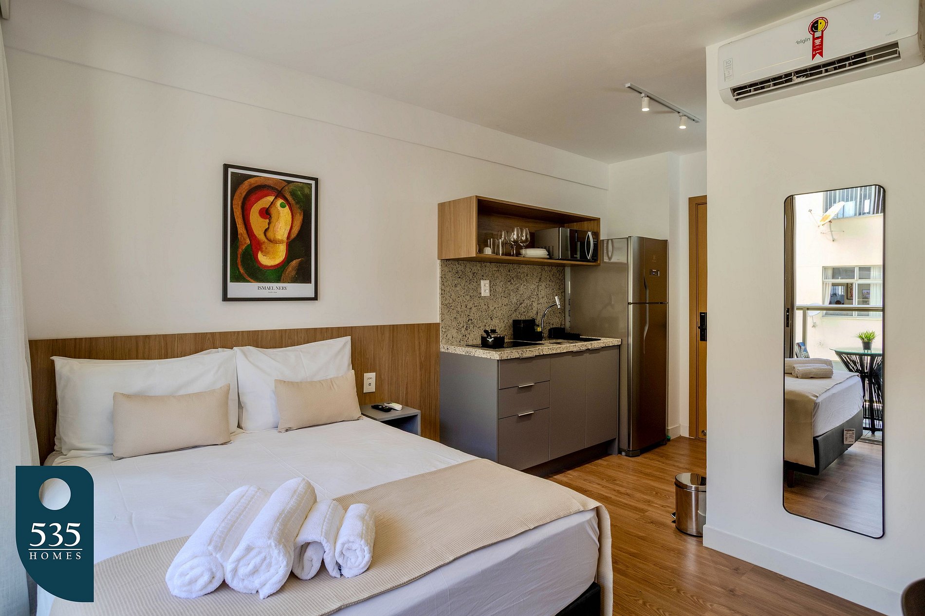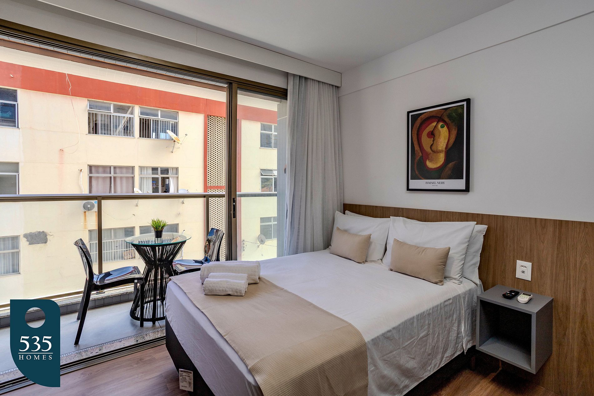 O banheiro oferece exaustor, chuveiro elétrico, ducha higiênica e secador de cabelo. No quarto, os hóspedes encontram ar-condicionado, smart TV de 44", cortina com blackout e espelho de corpo inteiro, garantindo conforto e praticidade. A varanda é mobiliada com mesa e cadeiras, ideal para momentos de descanso.
