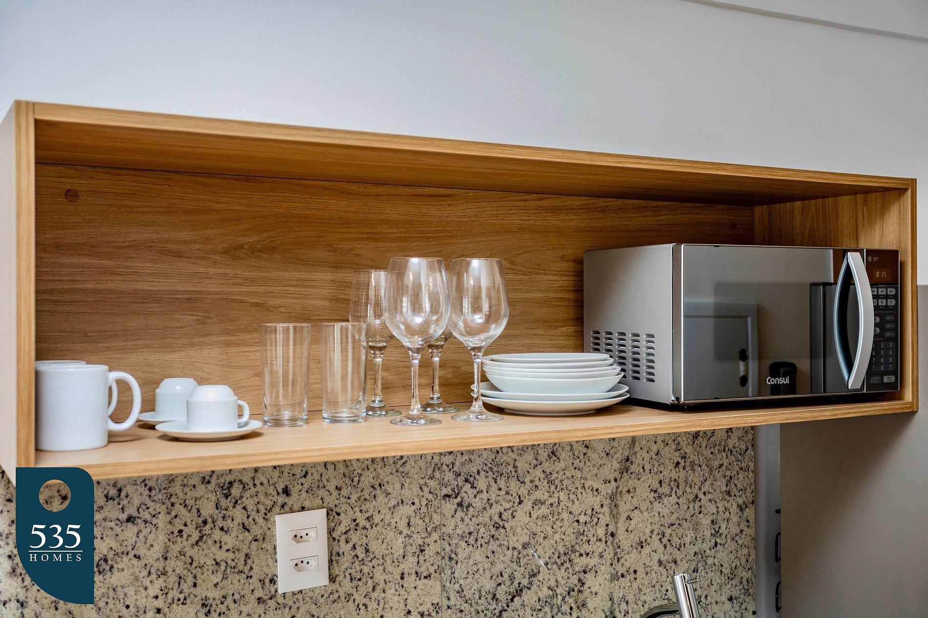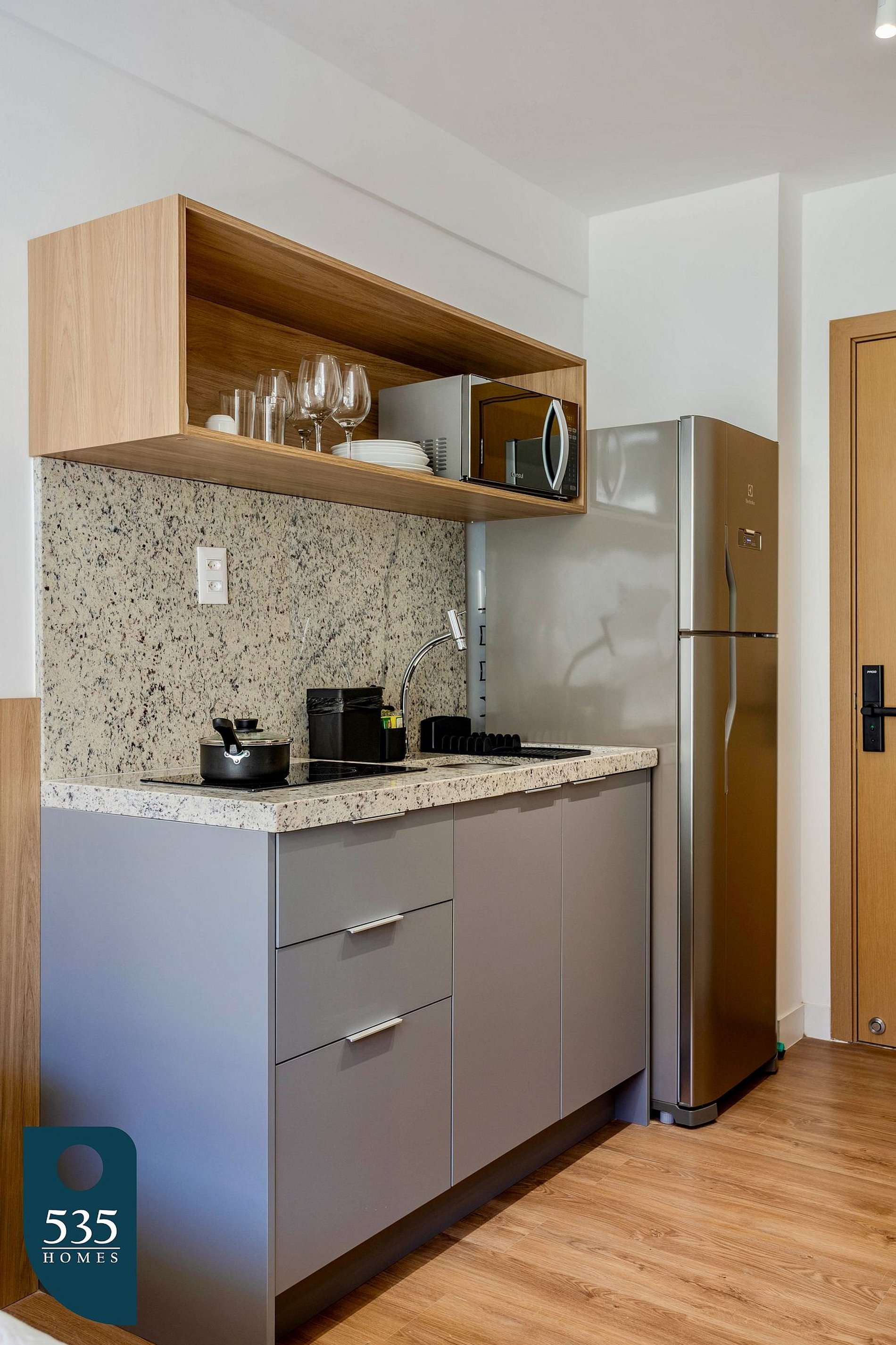 O apartamento dispõe de uma cozinha funcional equipada com geladeira, micro-ondas, sanduicheira, liquidificador, cafeteira elétrica, cafeteira italiana e cooktop vitrocerâmico de duas bocas, além de jogo de panelas para o preparo das refeições. Para maior comodidade durante a estadia, o espaço conta ainda com varal de chão para roupas, ferro elétrico e mesa de passar.