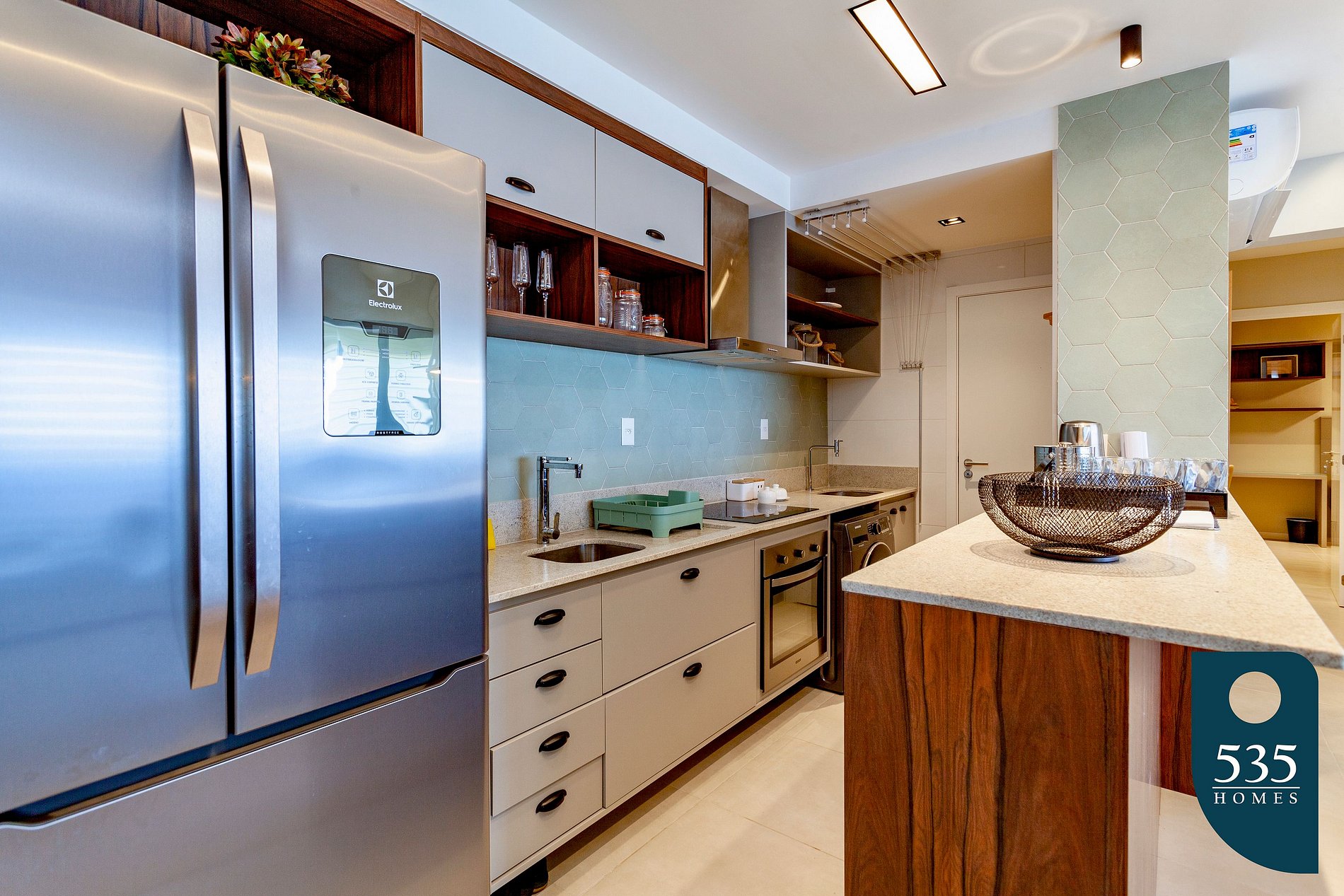 Cozinha completa com Geladeira inverse 3 portas, forno, cooktop 4 bocas, máquina de lavar, microondas e liquidificador.