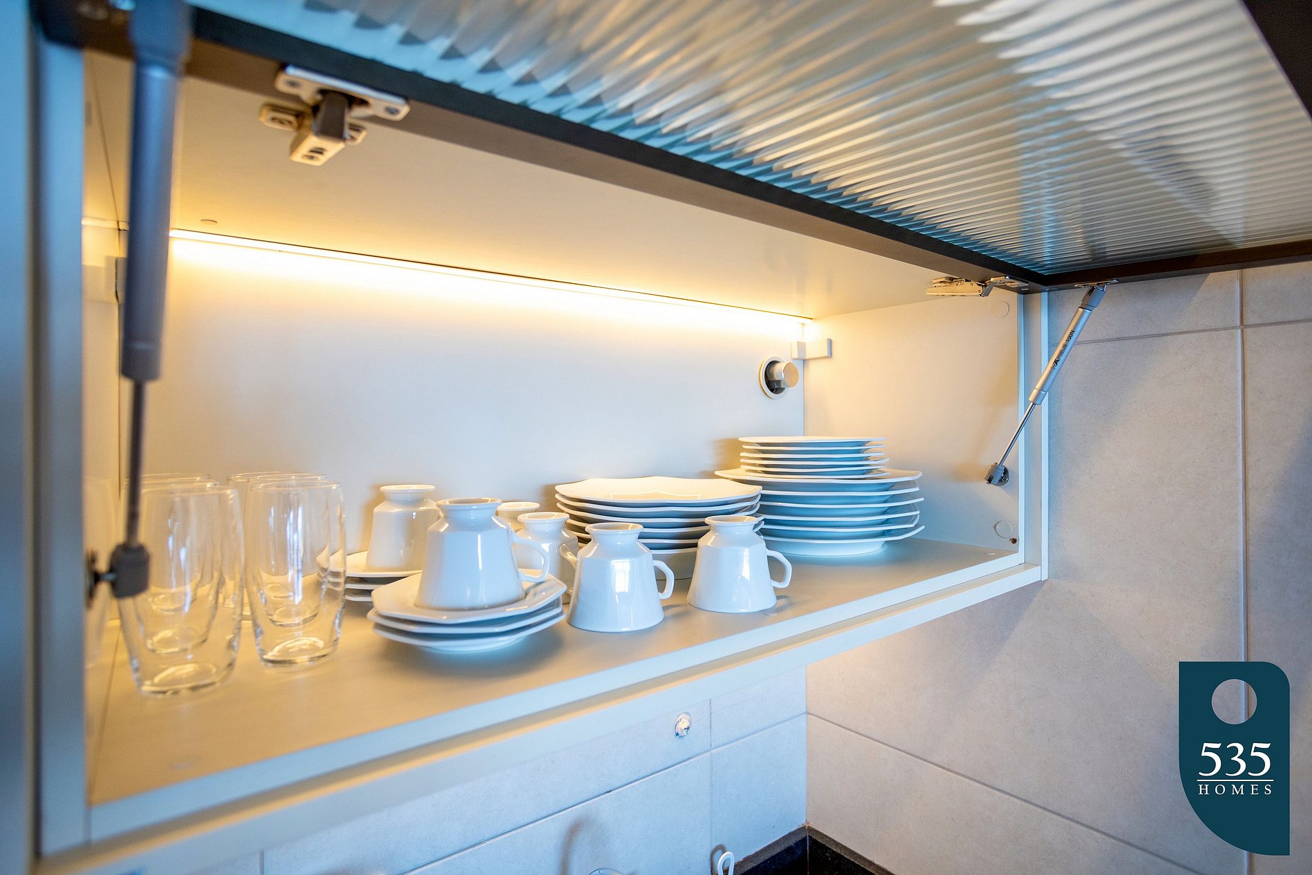 La cocina está completamente equipada e incluye todos los electrodomésticos esenciales: nevera, cocina de inducción, microondas y una mesa para tus comidas. Además, tendrás a tu disposición una máquina lavadora-secadora, ideal para cuidar tu ropa durante la estadía, así como una tabla de planchar y una plancha.