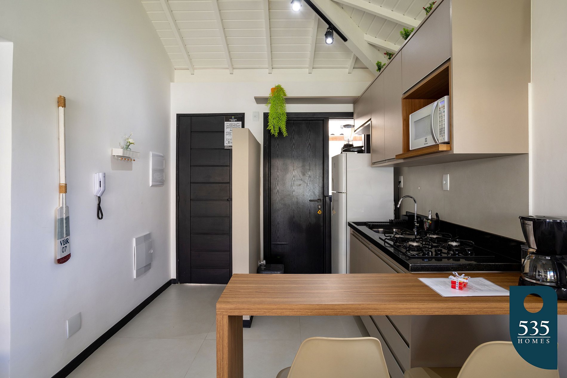 La cocina está completamente equipada con una nevera, microondas, sandwichera, licuadora y una cocina de 4 quemadores, lo que le permite preparar fácilmente sus comidas favoritas. Además, hay una barra con dos sillas, ideal para comidas rápidas o momentos de relajación.