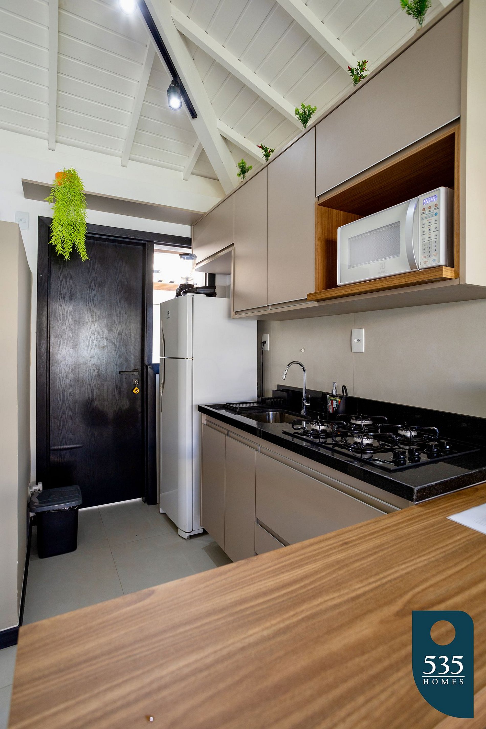 La cocina está completamente equipada con una nevera, microondas, sandwichera, licuadora y una cocina de 4 quemadores, lo que le permite preparar fácilmente sus comidas favoritas. Además, hay una barra con dos sillas, ideal para comidas rápidas o momentos de relajación.
