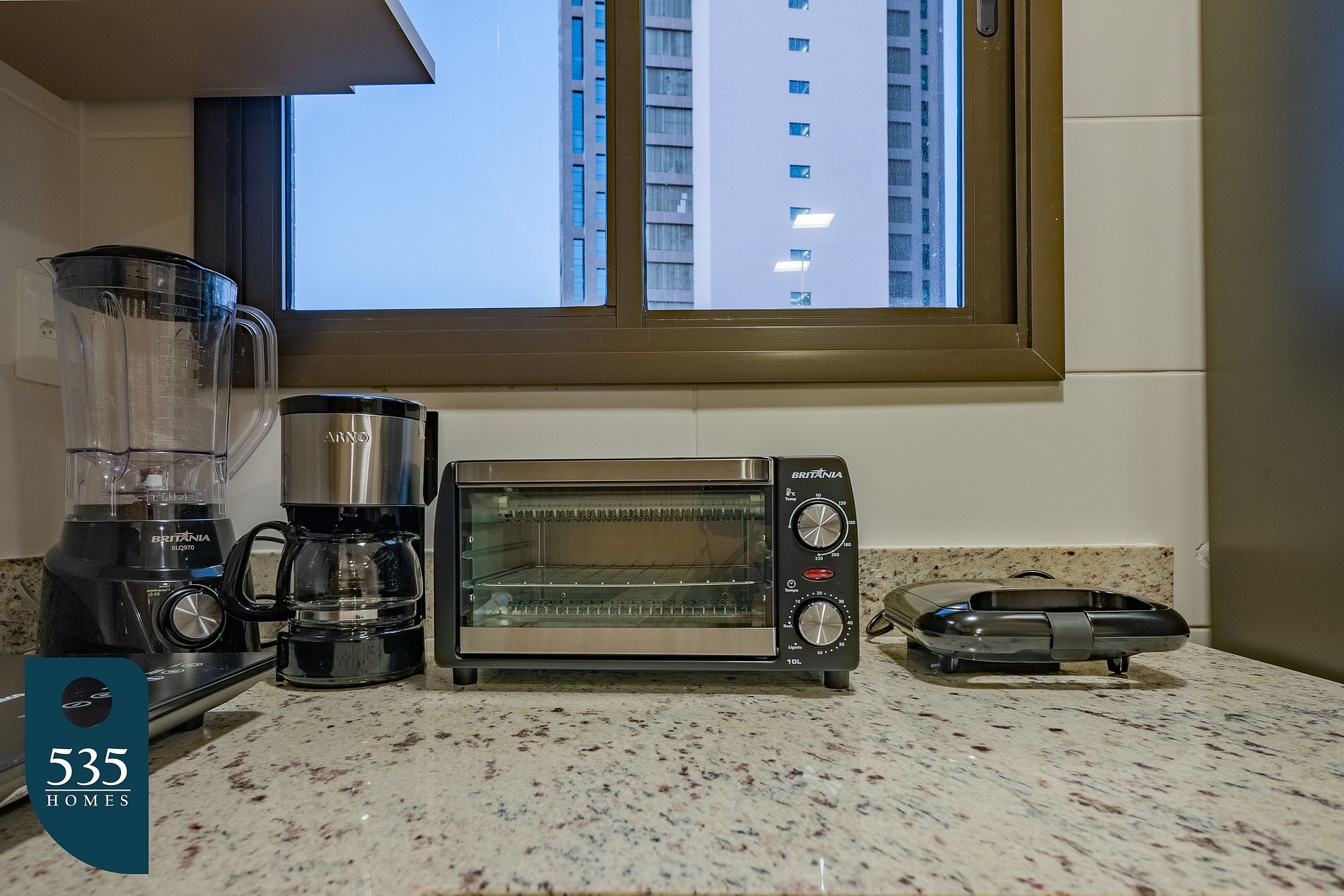 O apartamento por temporada está equipado para oferecer praticidade e conforto aos hóspedes. Para momentos de lazer, conta com uma Smart TV de 40” e Wi-Fi. Na cozinha, você encontrará uma geladeira, cooktop de 1 boca, micro-ondas, liquidificador, sanduicheira e filtro de água, ideais para preparar refeições e bebidas com facilidade.