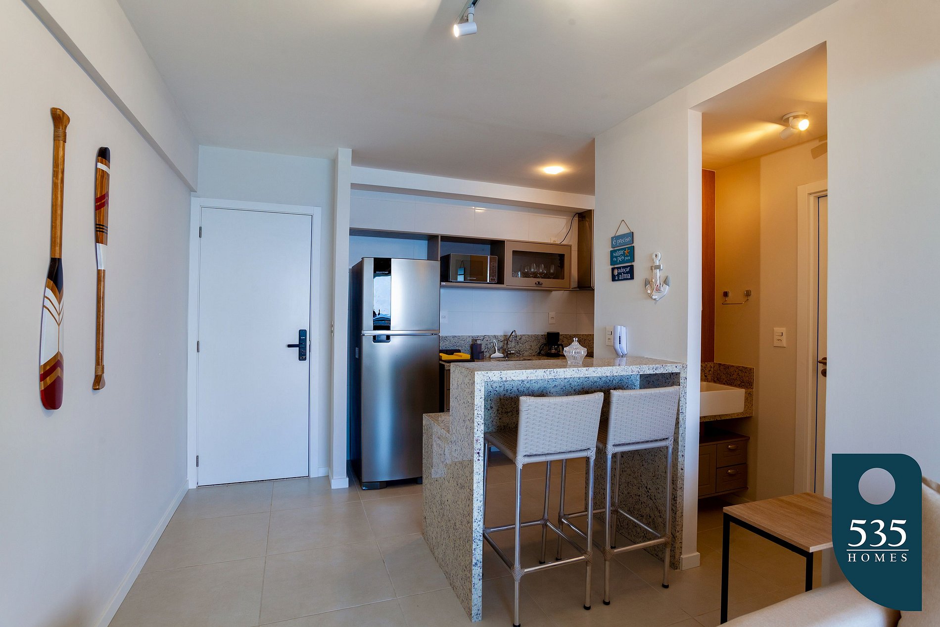 Está ubicado en una zona que tienes todo cerca , pescadería súper, farmacia, shopping, restaurantes, una tienda que se llama BuyBye que tiene todo, la gente de la zona muy amable y lo más importante una zona bien segura para salir de noche. La playa de barra es hermosa y el color increíble. Tienen que pasar unos días en este lugar se los recomiendo 100%