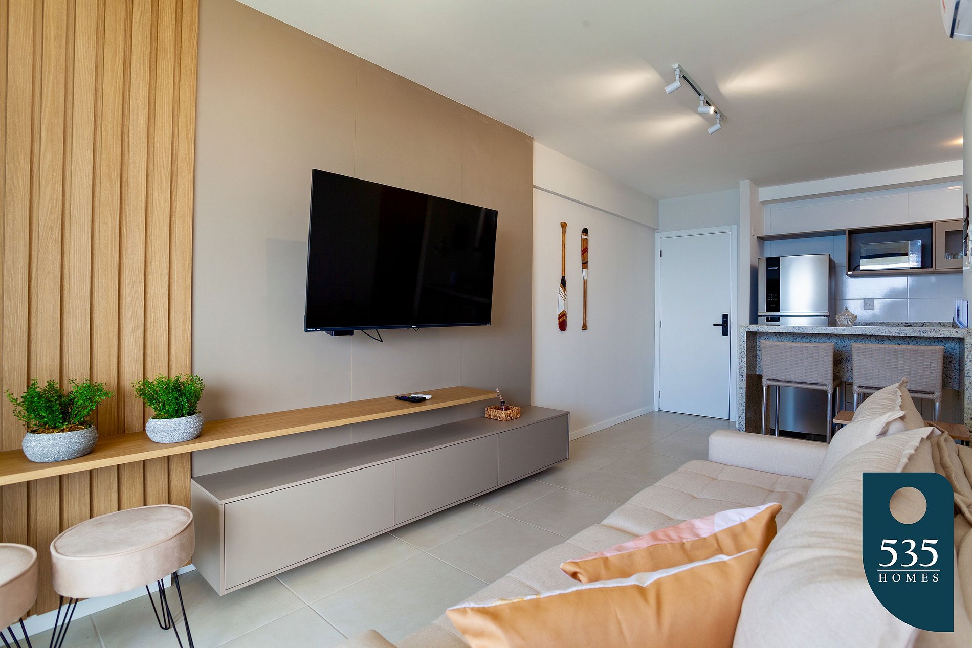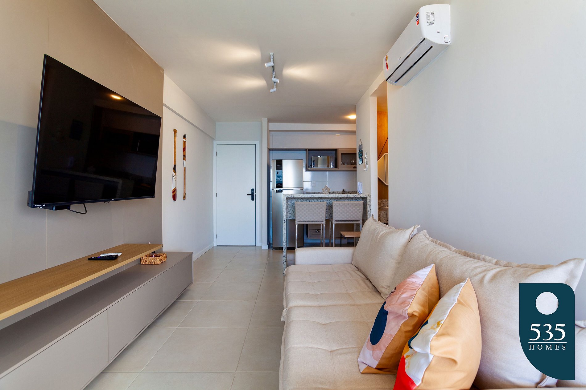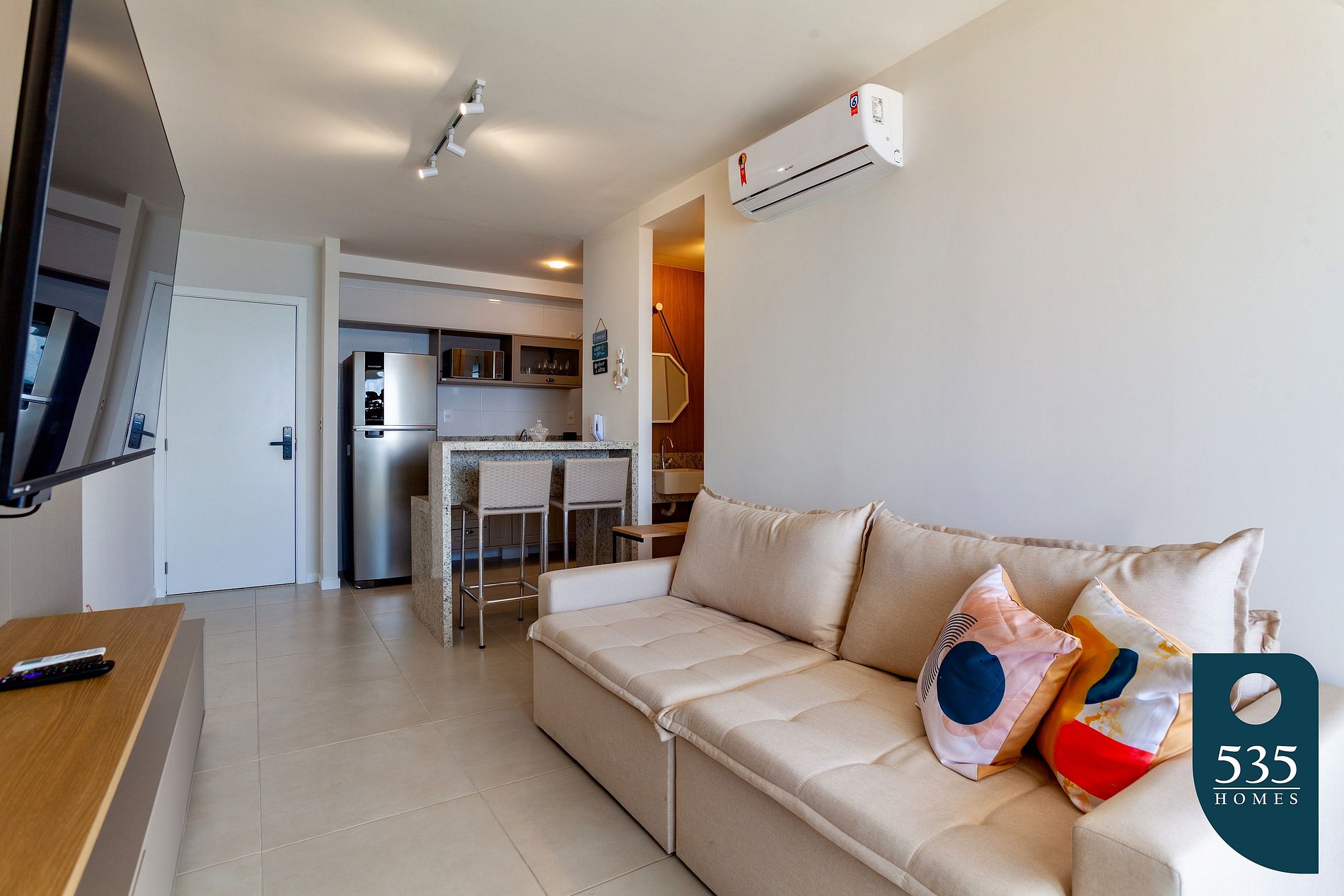 O apartamento possui uma confortável cama queen-size e um sofá-cama que pode acomodar dois hóspedes adicionais. O quarto está equipado com uma Smart TV com acesso a serviços populares de streaming como YouTube e Netflix. A sala também possui uma Smart TV, para que você possa curtir seus programas favoritos no conforto do sofá.