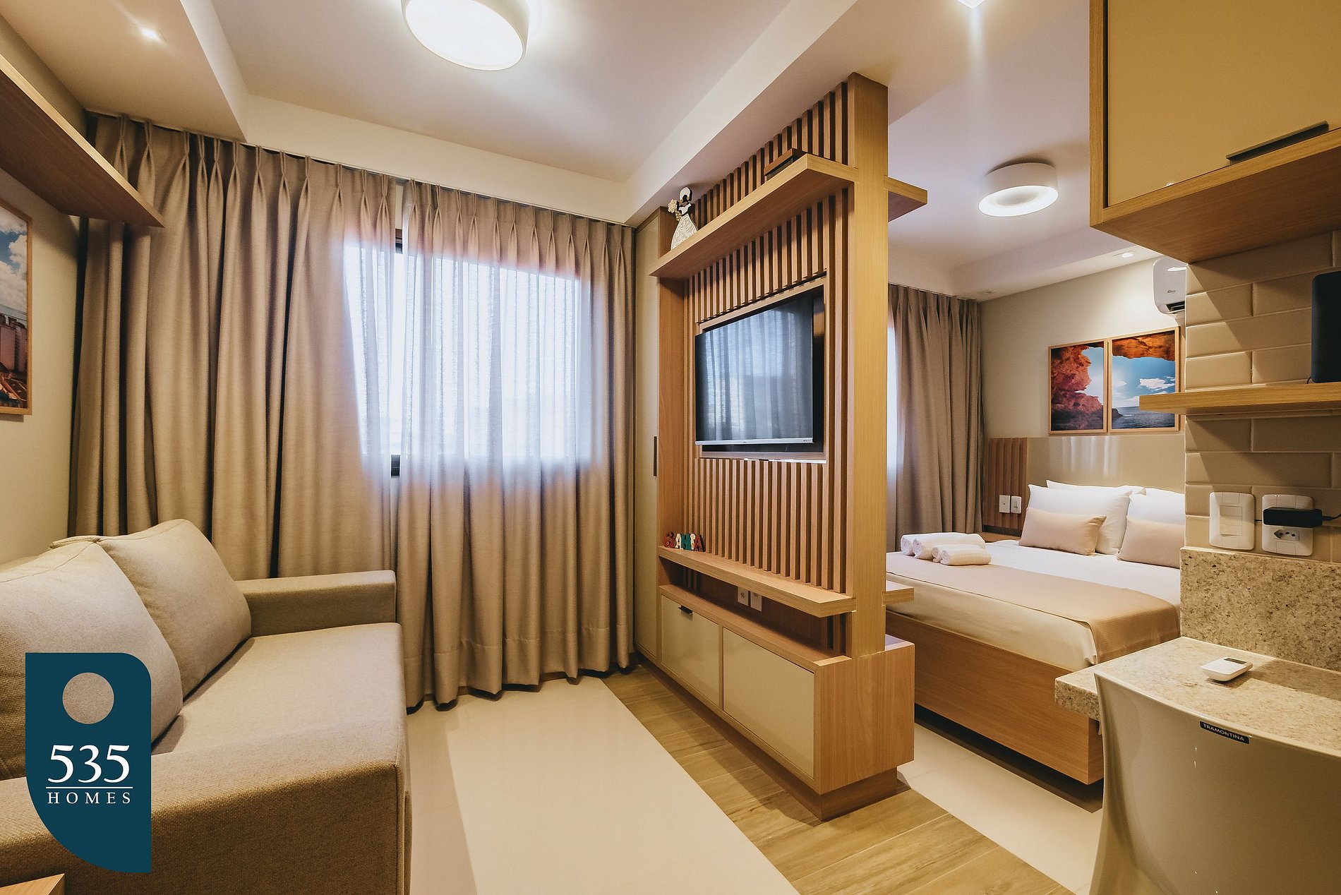 O ambiente é climatizado com ar-condicionado no quarto para garantir seu conforto em qualquer estação do ano. Para momentos de lazer, a Smart TV de 40" é ideal para assistir aos seus programas e filmes favoritos. O sofá-cama proporciona mais opções de acomodação para os seus convidados. O imóvel é equipado também com uma cafeteira italiana e uma cafeteira convencional, além de internet de 350megas. A cozinha conta com eletrodomésticos modernos e versáteis, incluindo geladeira, micro-ondas, cooktop de indução com 02 bocas, liquidificador, sanduicheira e airfryer, oferecendo tudo que você precisa para preparar suas refeições de forma prática e saborosa. Para o seu conforto diário, o apartamento ainda conta com mesa e ferro de passar roupa, varal de roupas, além de um chuveiro com água quente e ducha higiênica para uma experiência completa de bem-estar. E, para um toque final, um secador de cabelo está à disposição para os seus cuidados pessoais. Além de tudo isso, o ambiente conta com cortinas blackout, garantindo um sono tranquilo e sem interrupções.