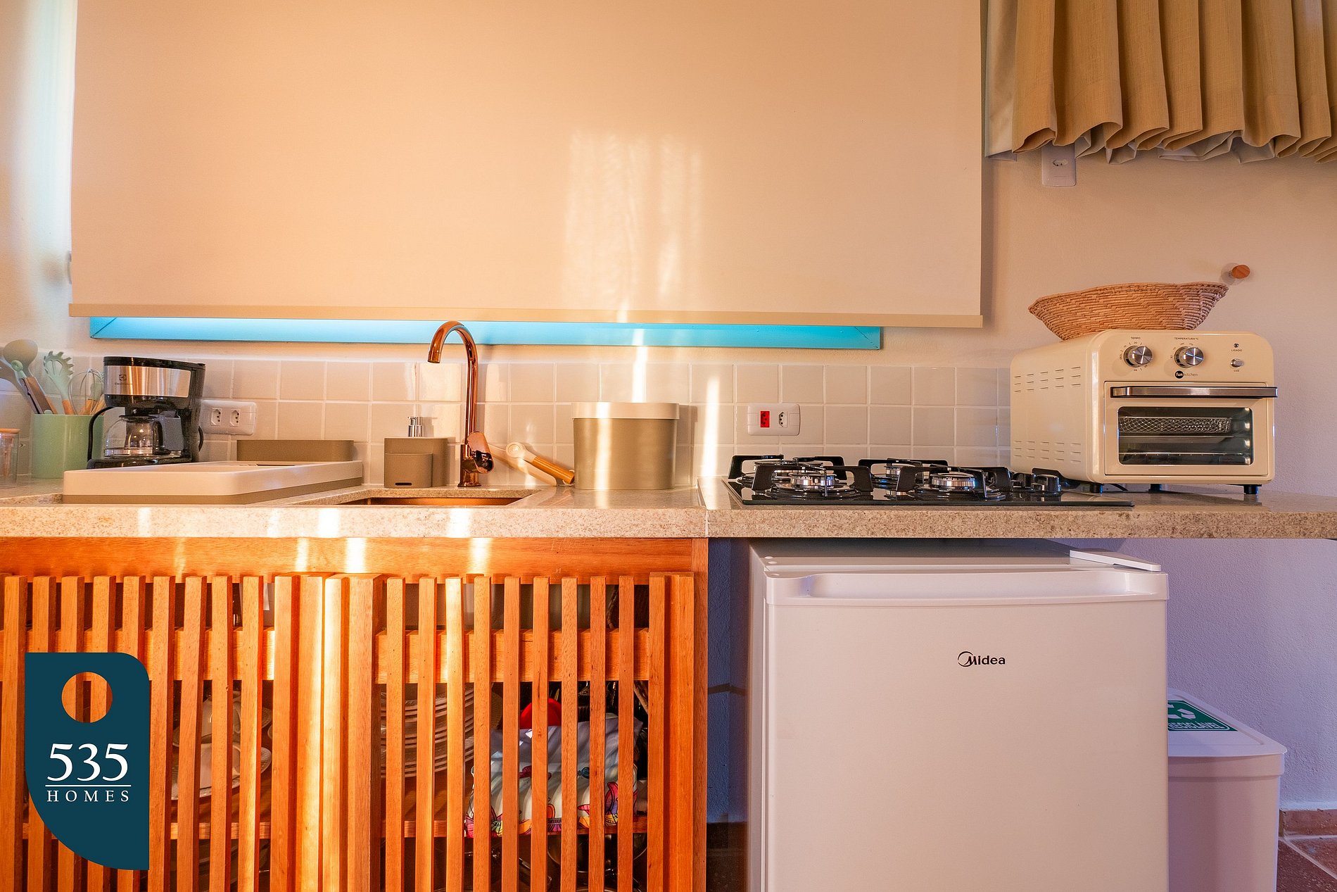 A cozinha é funcional e moderna, equipada com frigobar, forno elétrico, sanduicheira, liquidificador, cafeteira e um cooktop de quatro bocas. Para refeições rápidas ou um café especial, a mesa com dois lugares traz aconchego. Além disso, o purificador de água e a lixeira seletiva reforçam a preocupação com o seu bem-estar e o meio ambiente.