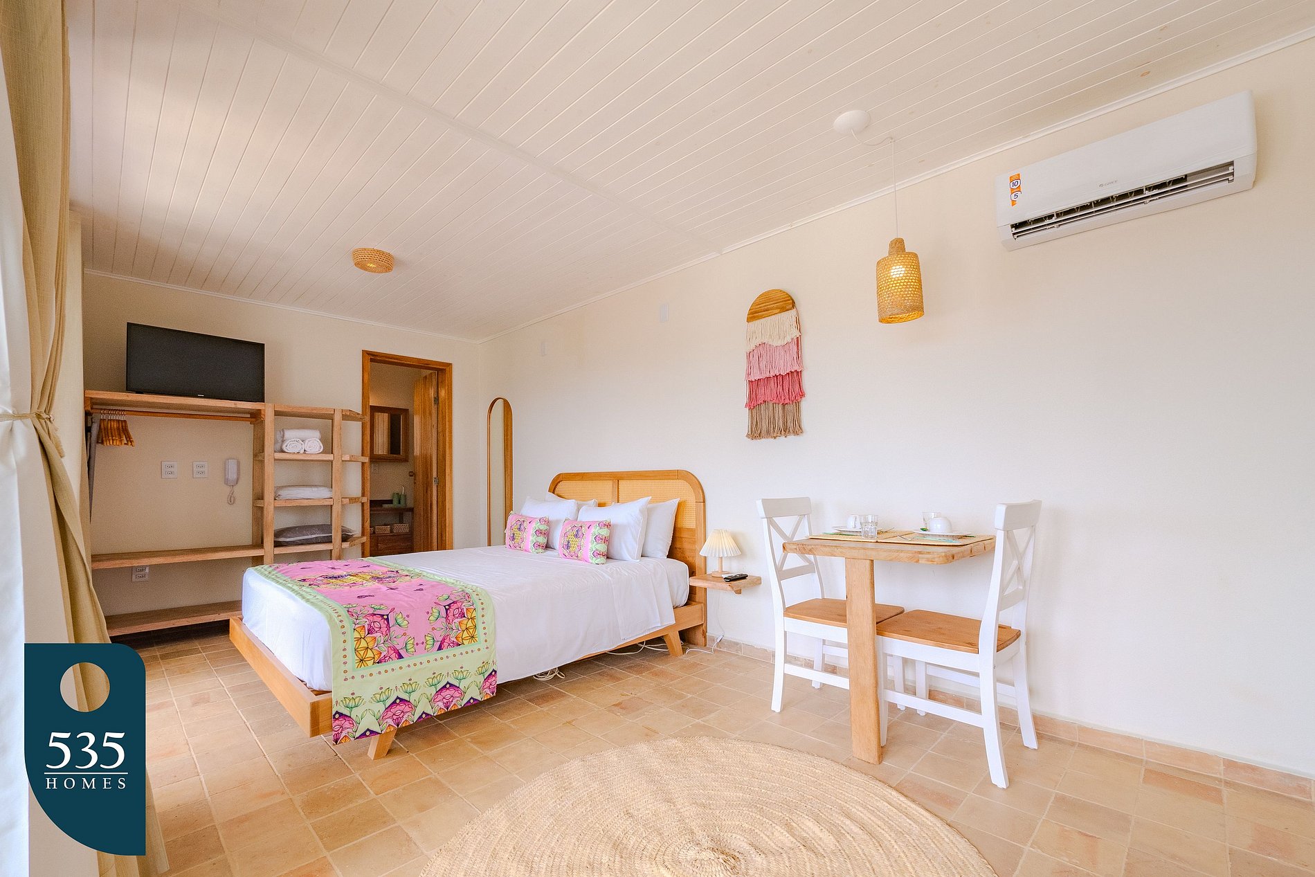 Você encontra uma Smart TV 32”, ar-condicionado e cortina blackout, garantindo conforto e privacidade. O espaço ainda conta com interfone, varal de roupa, mesa compacta para passar roupa, ferro de passar e cabides – tudo pensado para sua comodidade.