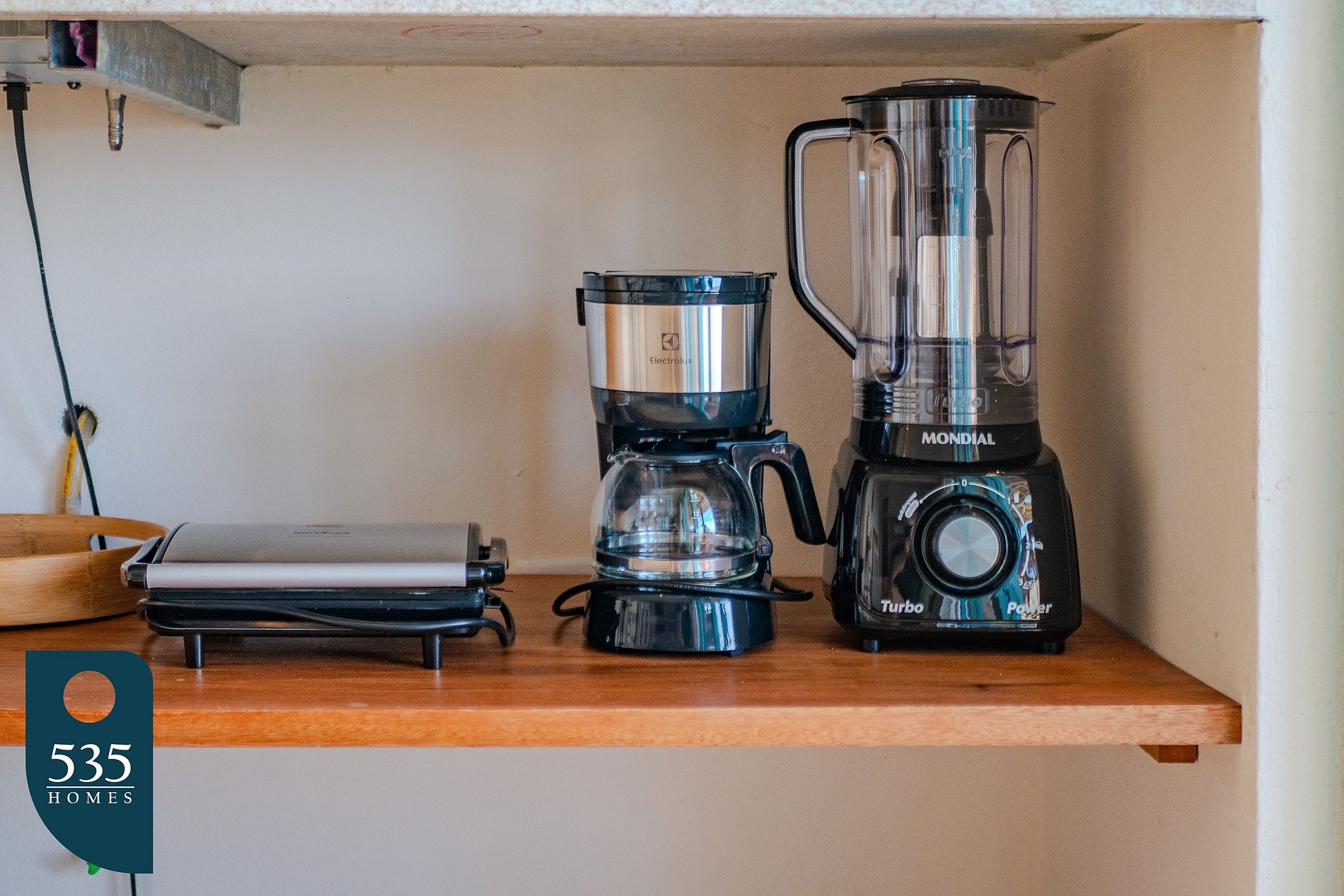 A cozinha é equipada com tudo o que você precisa para preparar refeições: frigobar, forno elétrico, cooktop 4 bocas a gás, liquidificador, cafeteira, sanduicheira e uma mesa para 2 pessoas. Também incluímos uma lixeira seletiva (orgânicos e recicláveis) e um purificador de água, para mais sustentabilidade e praticidade.