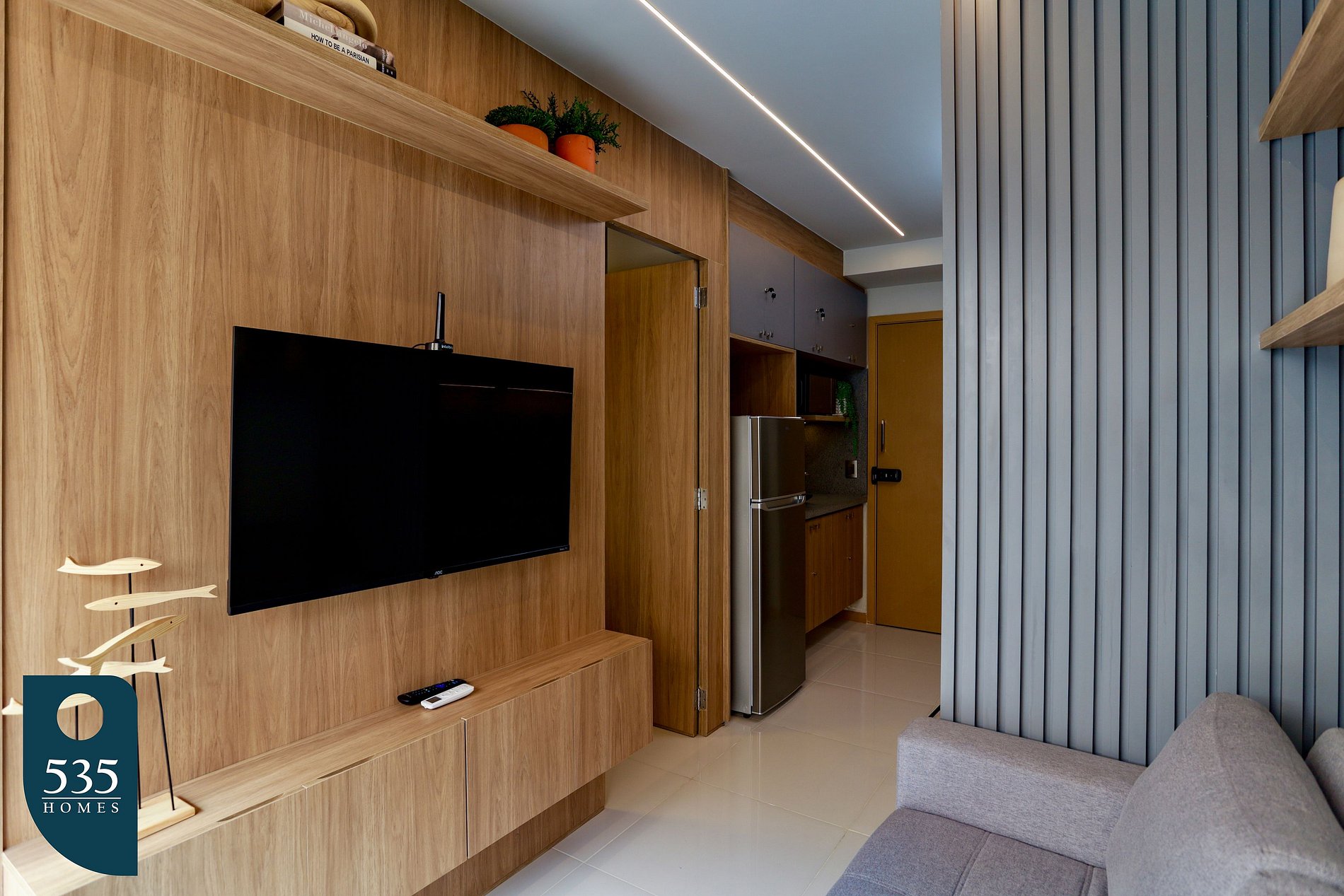 Na sala, o ambiente é confortável e acolhedor, com Smart TV de 50”, ar-condicionado e um sofá perfeito para relaxar após um dia de passeio ou trabalho.