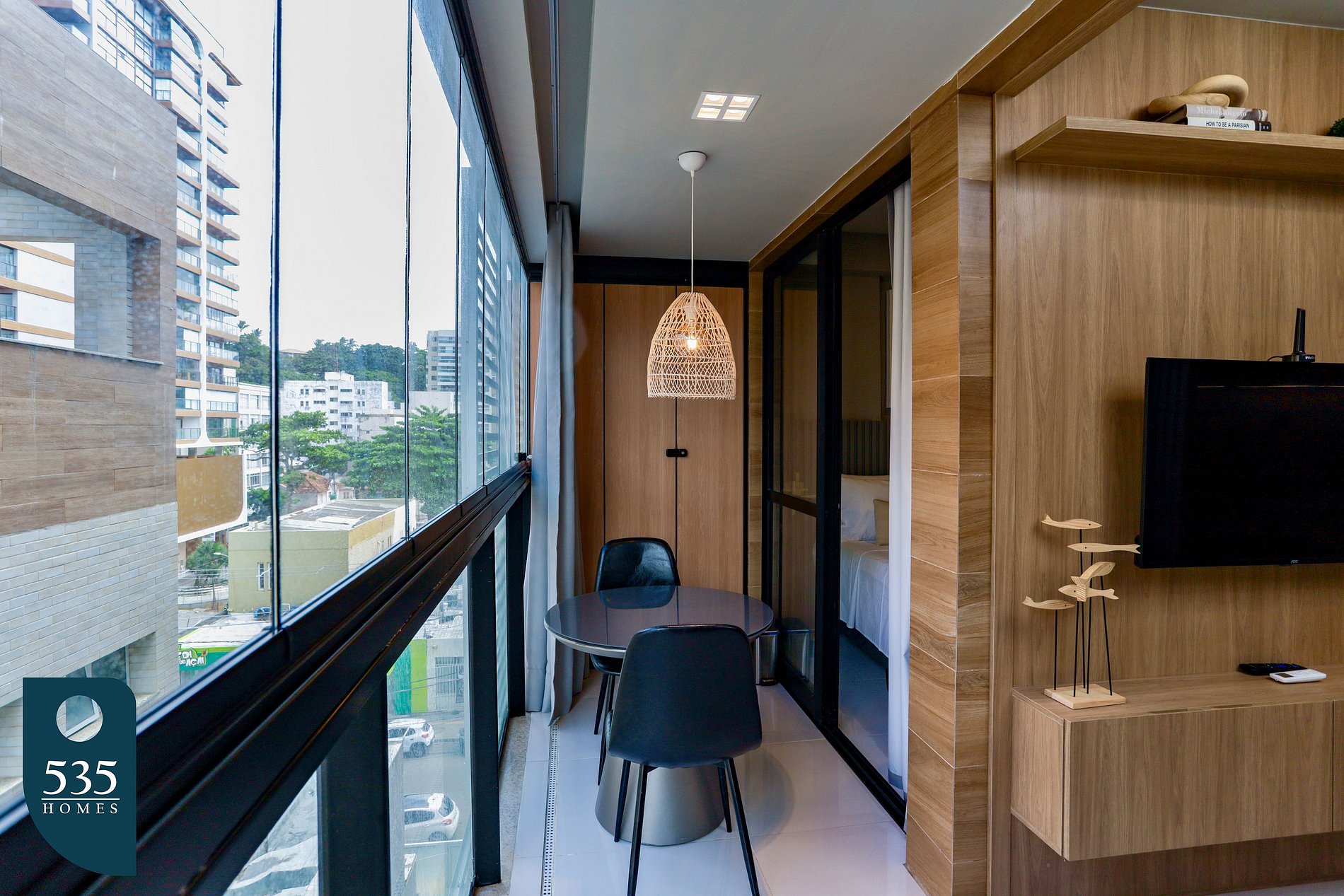 A varanda é um charme à parte, com uma mesa de jantar com cadeiras — um espaço perfeito para refeições ao ar livre ou para curtir o clima da cidade com tranquilidade.