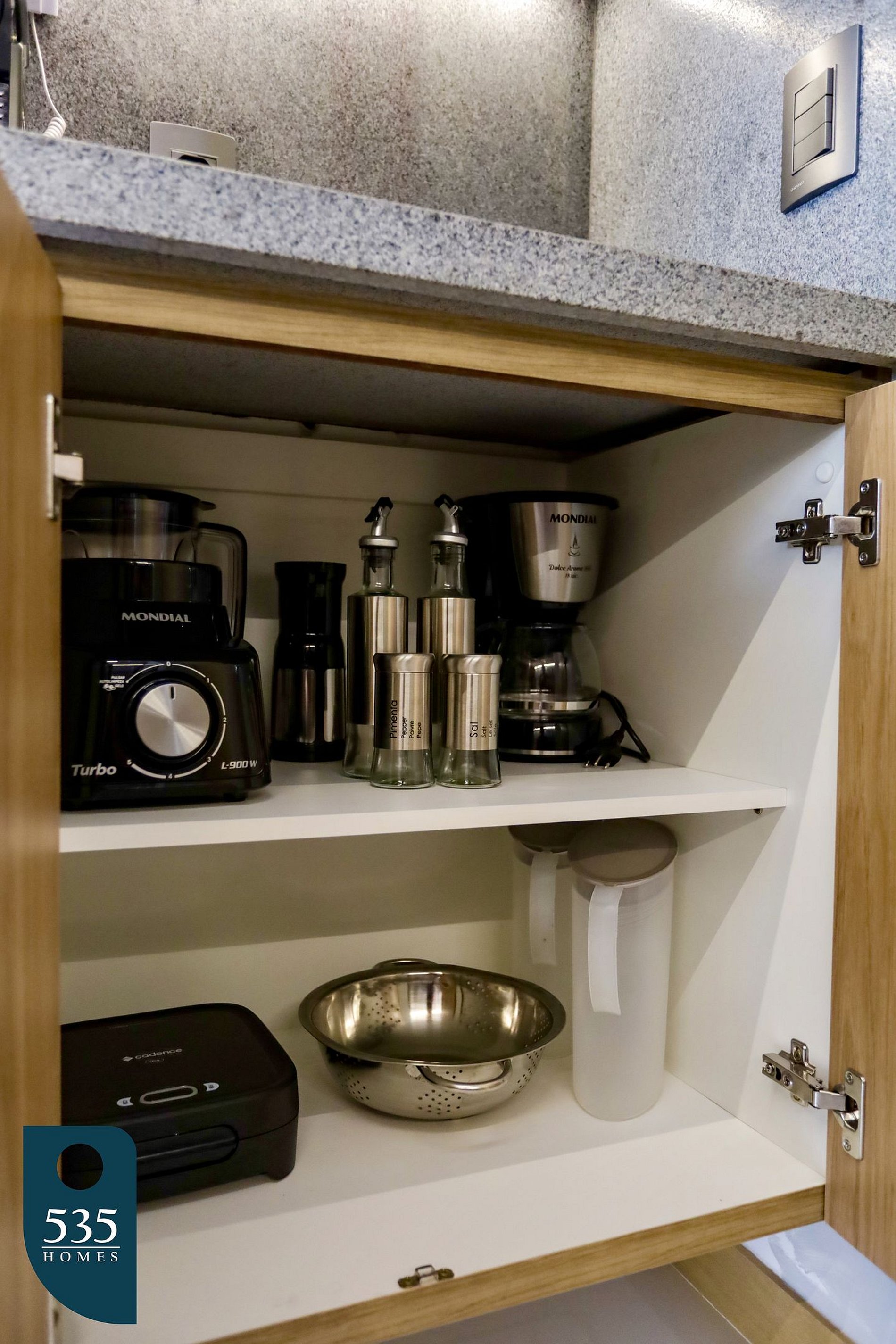 A cozinha é super equipada, perfeita para preparar desde um café da manhã até refeições completas. Conta com máquina de lavar e secar roupa, cafeteira elétrica, máquina de café em cápsulas, cooktop de indução com 2 bocas, geladeira, forno elétrico, micro-ondas, sanduicheira e purificador de água acoplado à torneira da pia.