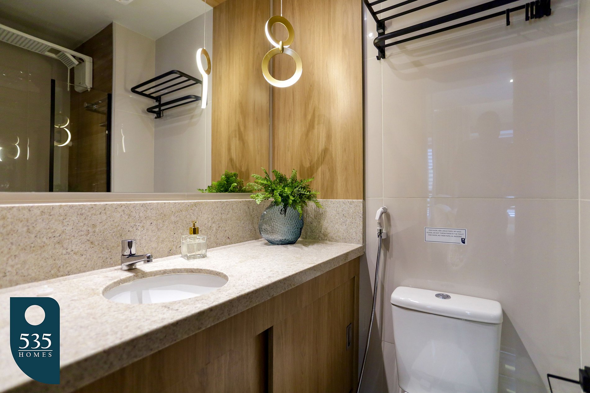 O banheiro é funcional e bem ventilado, equipado com ducha higiênica, secador de cabelo e exaustor, proporcionando conforto e praticidade no dia a dia.