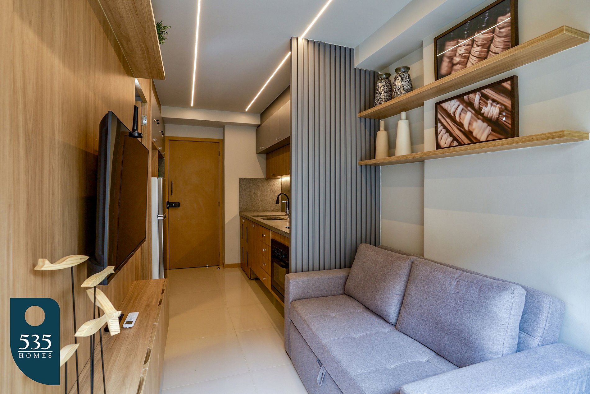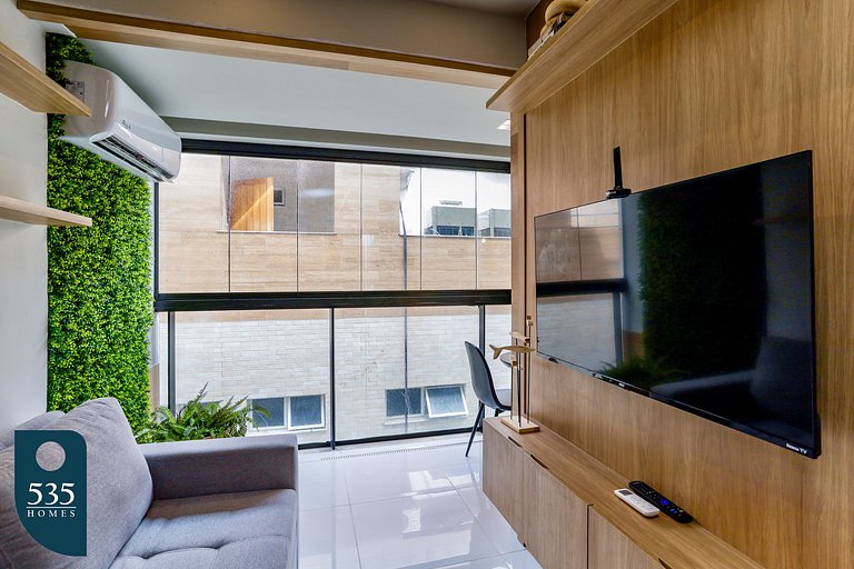Na sala, o ambiente é confortável e acolhedor, com Smart TV de 50”, ar-condicionado e um sofá perfeito para relaxar após um dia de passeio ou trabalho.