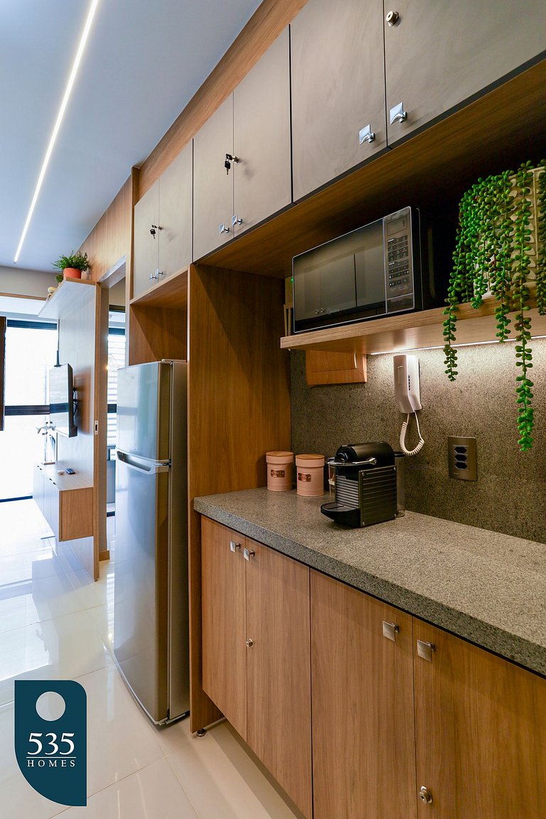 A cozinha é super equipada, perfeita para preparar desde um café da manhã até refeições completas. Conta com máquina de lavar e secar roupa, cafeteira elétrica, máquina de café em cápsulas, cooktop de indução com 2 bocas, geladeira, forno elétrico, micro-ondas, sanduicheira e purificador de água acoplado à torneira da pia.