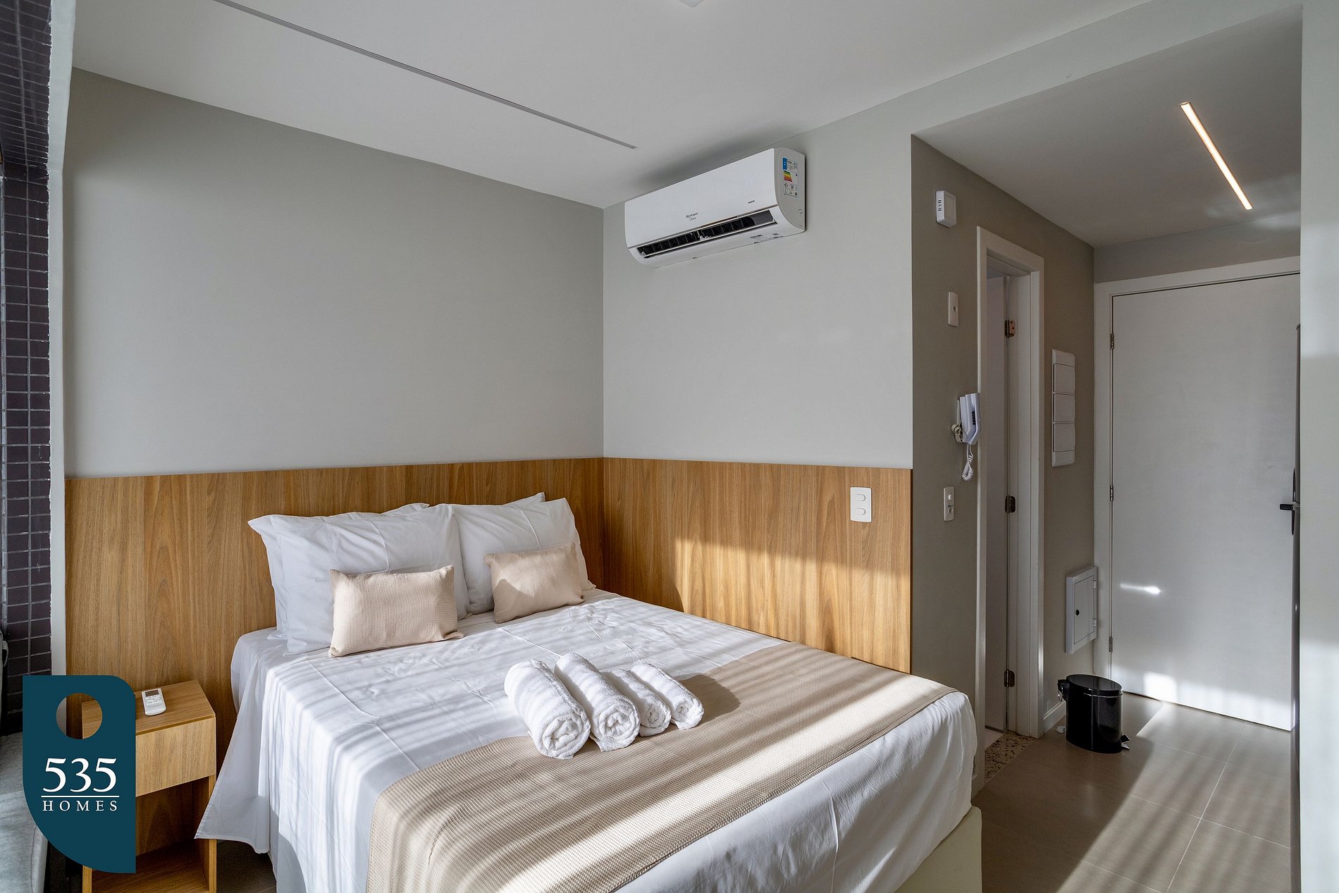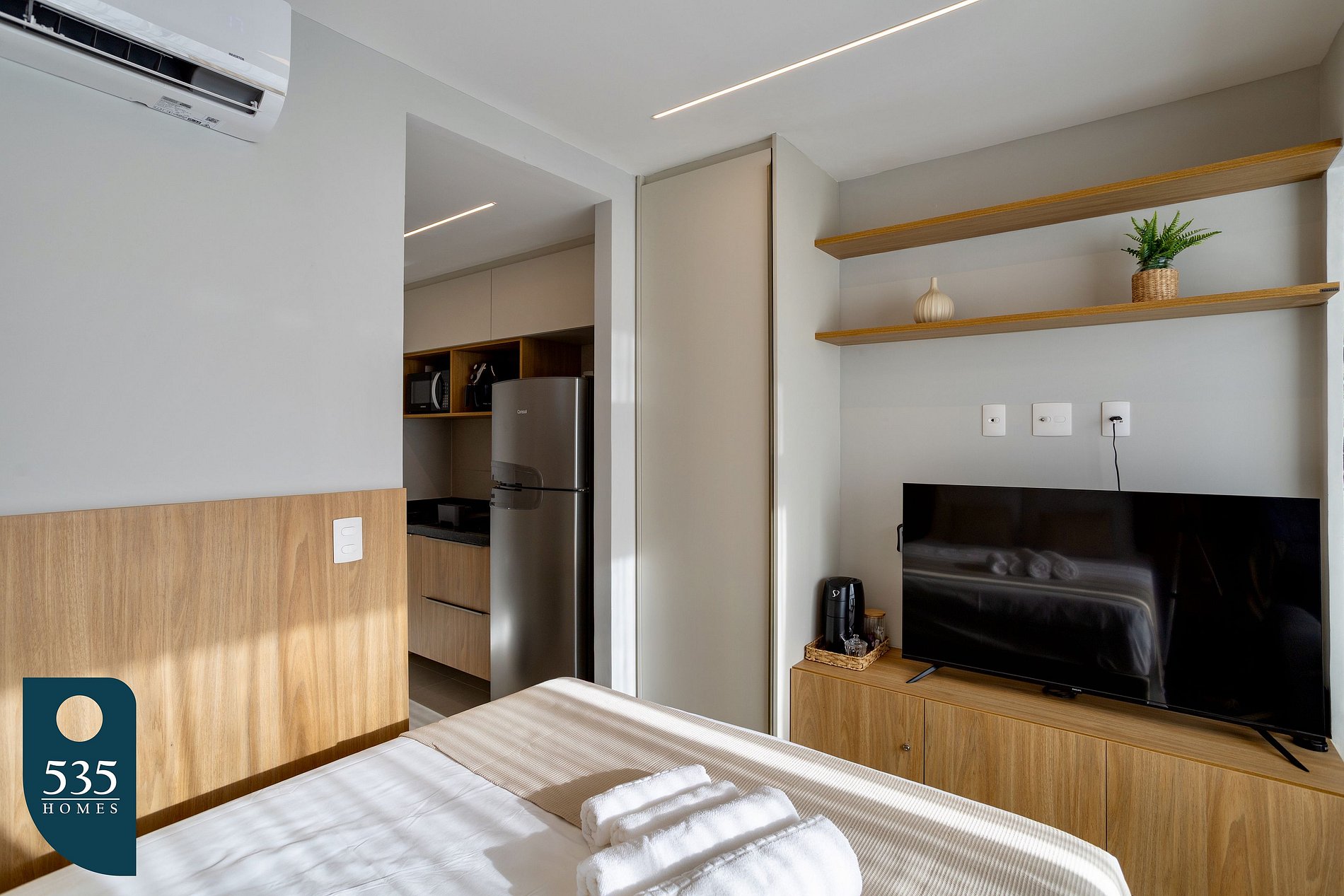 O apartamento é equipado com uma cozinha prática e funcional, que conta com cooktop de indução de duas bocas, geladeira, purificador de água, micro-ondas, sanduicheira, airfryer, liquidificador e máquina de café em cápsulas, oferecendo toda a conveniência para preparar suas refeições com conforto. No banheiro, há ducha higiênica, secador de cabelo, balde retrátil e varal de roupas fixo, garantindo praticidade para o dia a dia. No quarto, o ambiente é bem planejado e confortável, com Smart TV de 50 polegadas, cortina blackout que proporciona um ótimo escurecimento, mesa de refeições com duas cadeiras, ferro de passar roupa e mesa compacta para passar, unindo funcionalidade e bem-estar em um só lugar.
