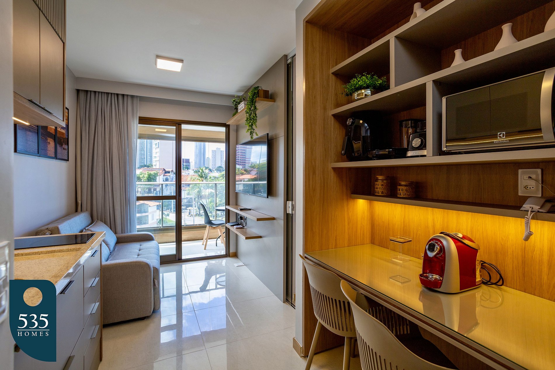 O apartamento foi projetado para oferecer praticidade e bem-estar em todos os ambientes. A cozinha dispõe de bancada para refeições, micro-ondas, airfryer, liquidificador, sanduicheira, máquina de café, purificador de água e cooktop de indução com duas bocas, além de garrafa térmica, escorredor de macarrão e arroz e tábua de corte, proporcionando praticidade para o preparo das refeições. Na cozinha também estão disponíveis vassoura, pá de lixo, varal de chão, pregadores de roupa, rodo de chão e balde, garantindo comodidade nas tarefas do dia a dia. A sala é equipada com Smart TV de 55” e cortina blackout com voal, perfeita para momentos de lazer e descanso. A varanda envidraçada com Reiki conta com mesa de refeição e cadeiras, criando um espaço agradável para relaxar. No quarto, o conforto é garantido com ar-condicionado, tomada USB, espelho de corpo inteiro e suporte para mala, além de ferro e mesa compacta de passar roupa, com cabides disponíveis para maior praticidade durante a estadia. O banheiro possui exaustor, chuveiro elétrico, ducha higiênica, secador de cabelo e espelho.