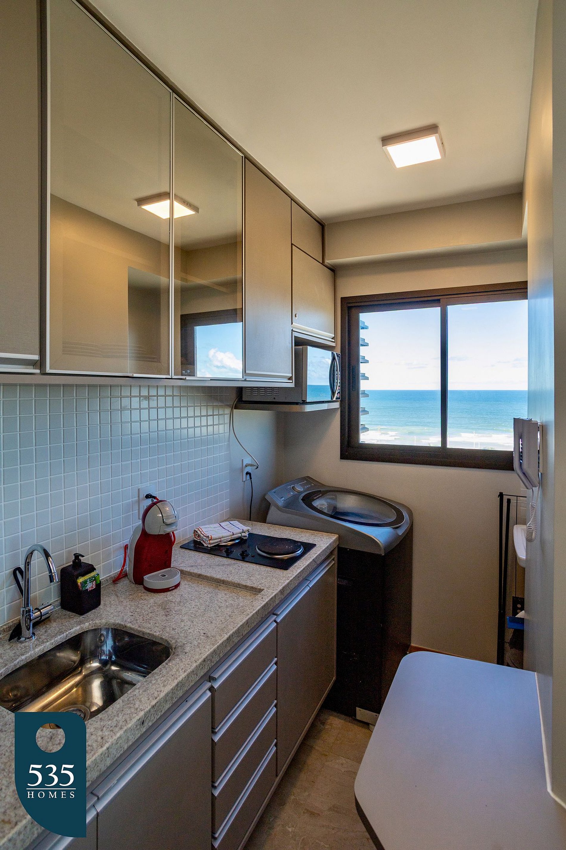 A cozinha conta com geladeira, micro-ondas, liquidificador, sanduicheira, cooktop elétrico de duas bocas, cafeteira elétrica e máquina de café em cápsulas. Está totalmente equipada com pratos fundos, rasos e de sobremesa, xícaras com pires, taças de água e vinho, talheres, utensílios diversos, kit facas: carne, pão e legumes, panelas com tampa de vidro, frigideira, leiteira, peneira, bowls, escorredor de macarrão, jarra de suco, galheteiro, jogo americano, tábua de corte, descanso de panela, tesoura multiuso, abridor de vinho, abridor de lata, escorredor de pratos, rodinho de pia e dispenser para detergente. A bancada conta com quatro cadeiras, ideal para refeições rápidas.