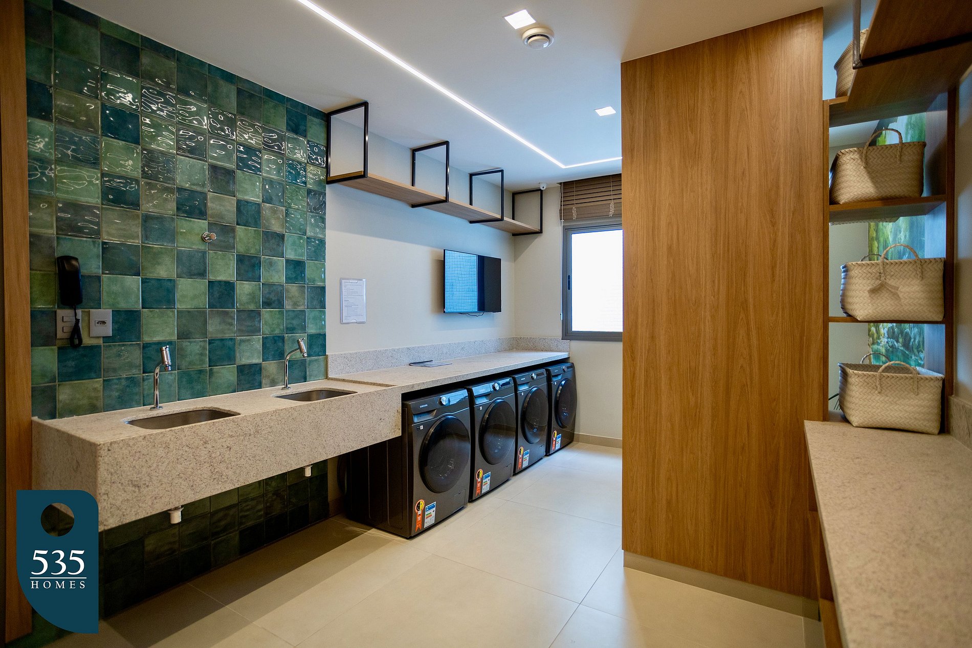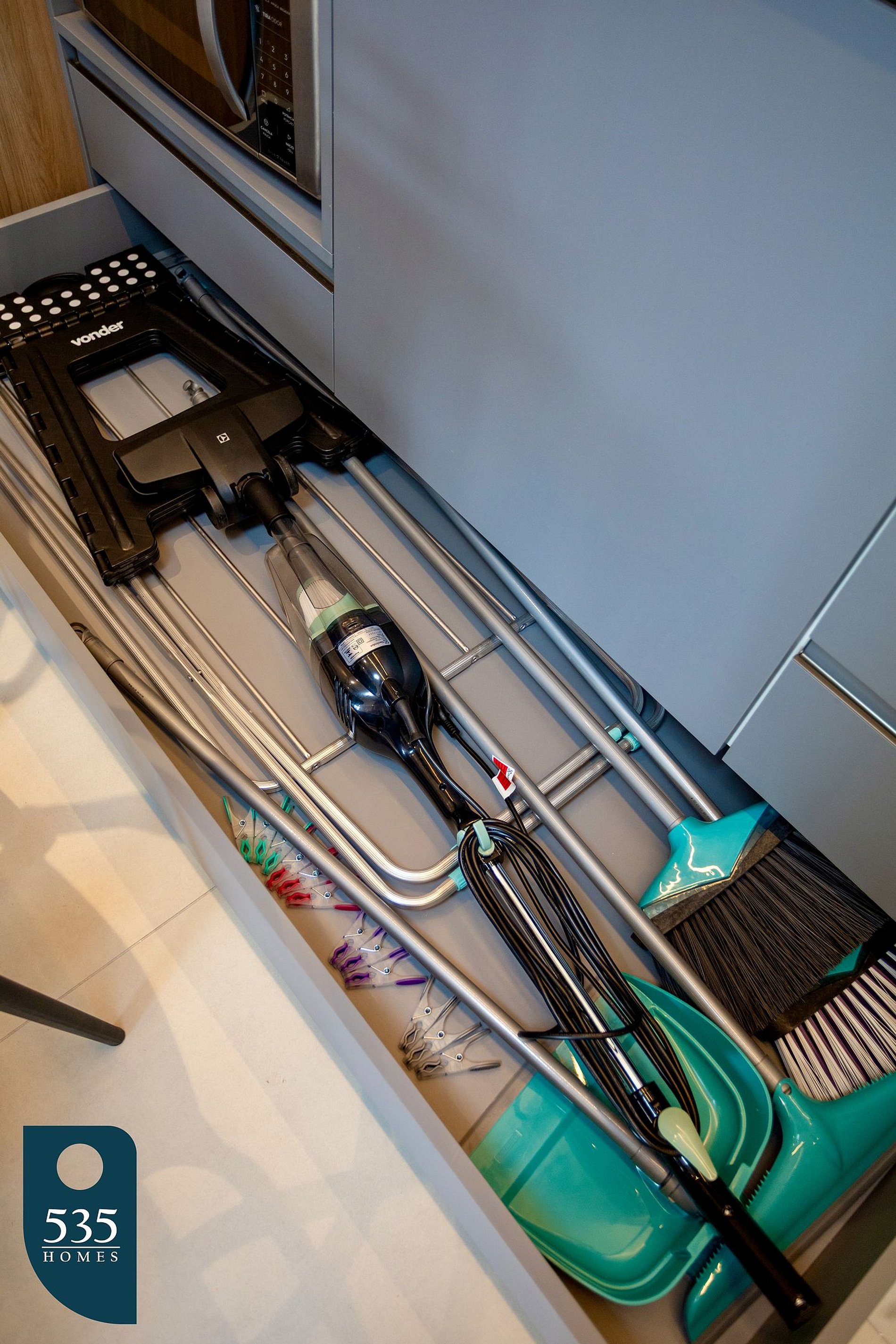 Para o dia a dia, estão disponíveis varal, balde retrátil, vassouras, rodo, pá de lixo e aspirador de pó. A sala é climatizada com ar-condicionado central e oferece conforto com uma smart TV de 40” e luminária de piso.