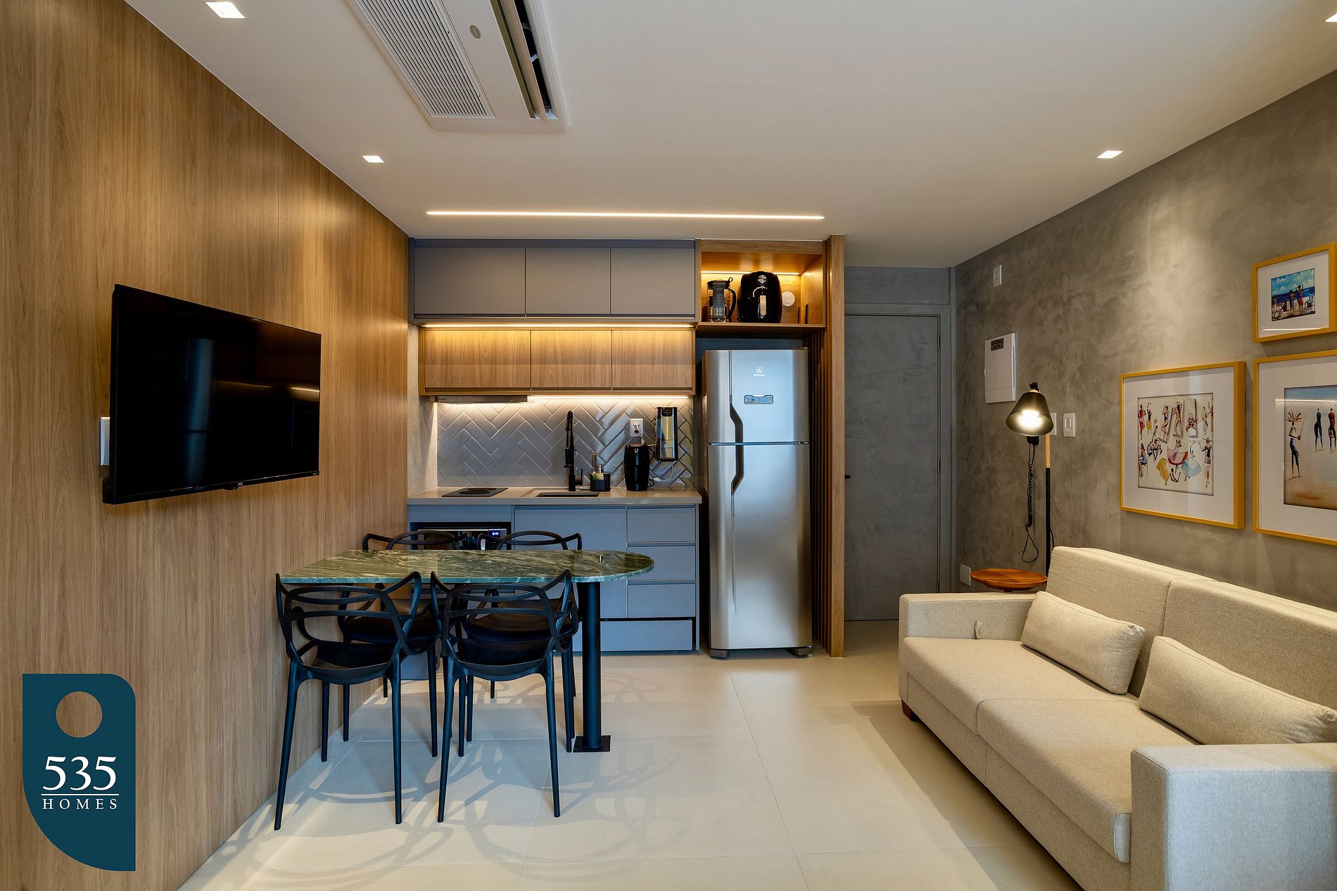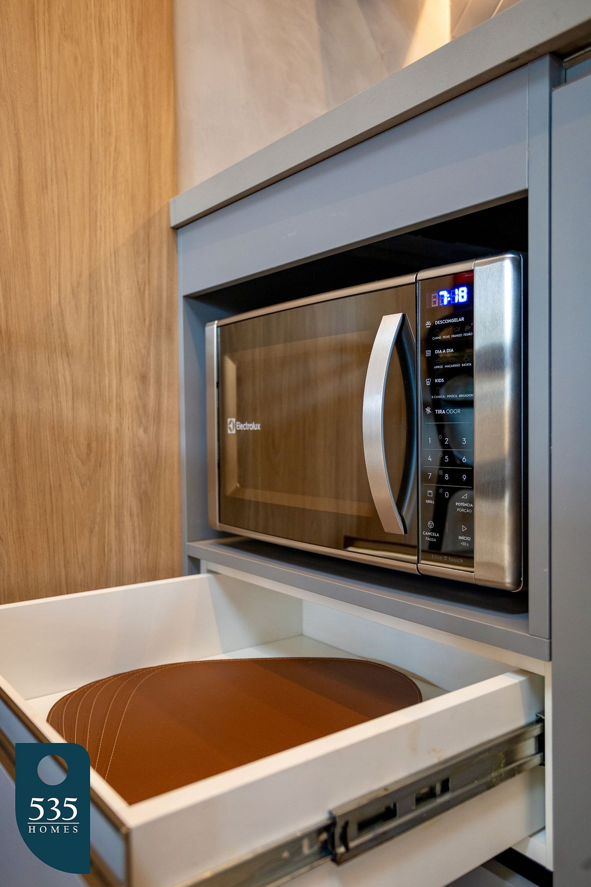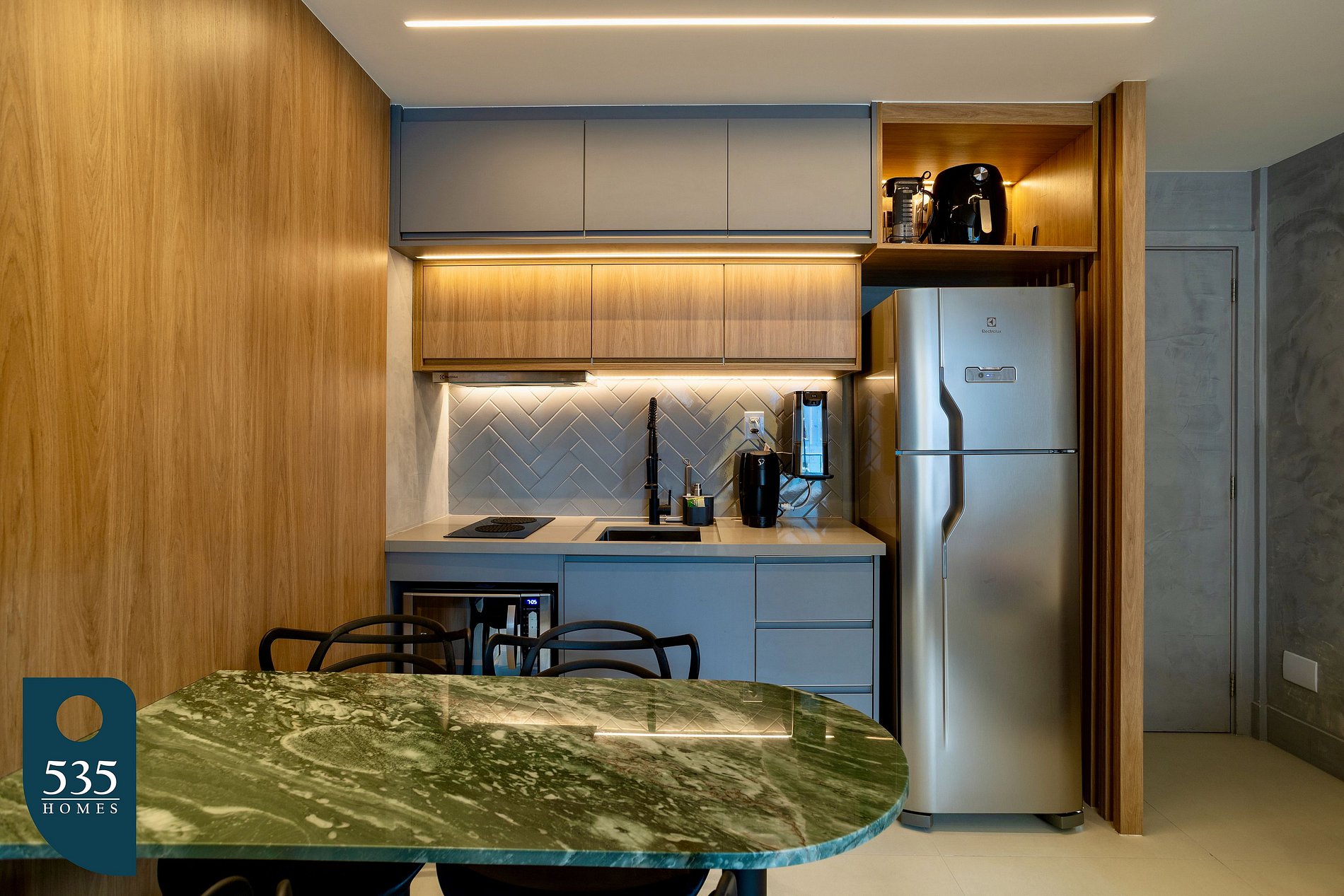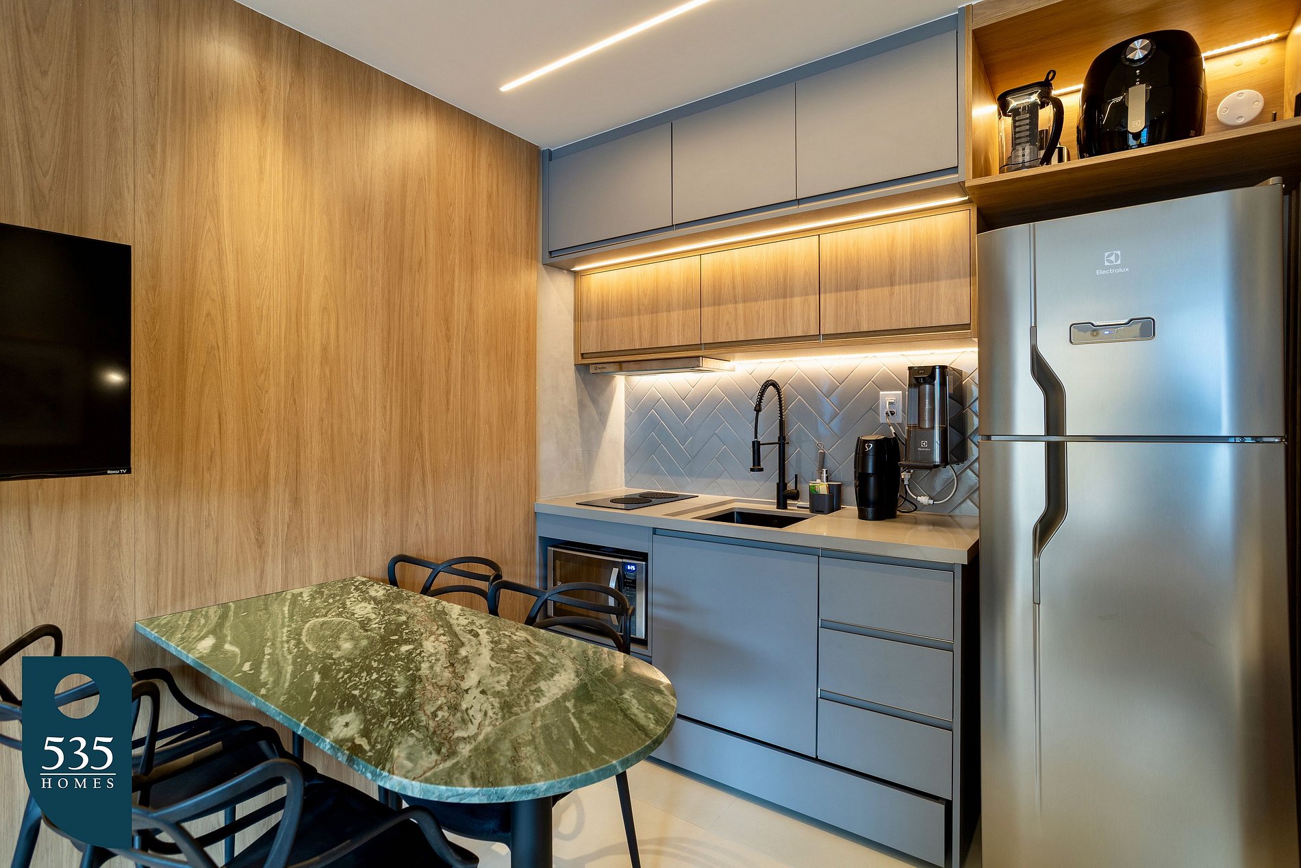 O apartamento oferece uma estrutura completa e funcional, ideal para quem busca praticidade sem abrir mão do conforto. A cozinha é equipada com cooktop de indução com duas bocas, depurador de ar retrátil, purificador de água, geladeira, micro-ondas com grill, torre de tomadas, torneira gourmet, liquidificador, sanduicheira, airfryer, máquina de café.