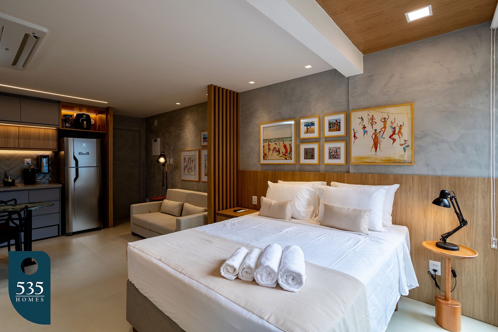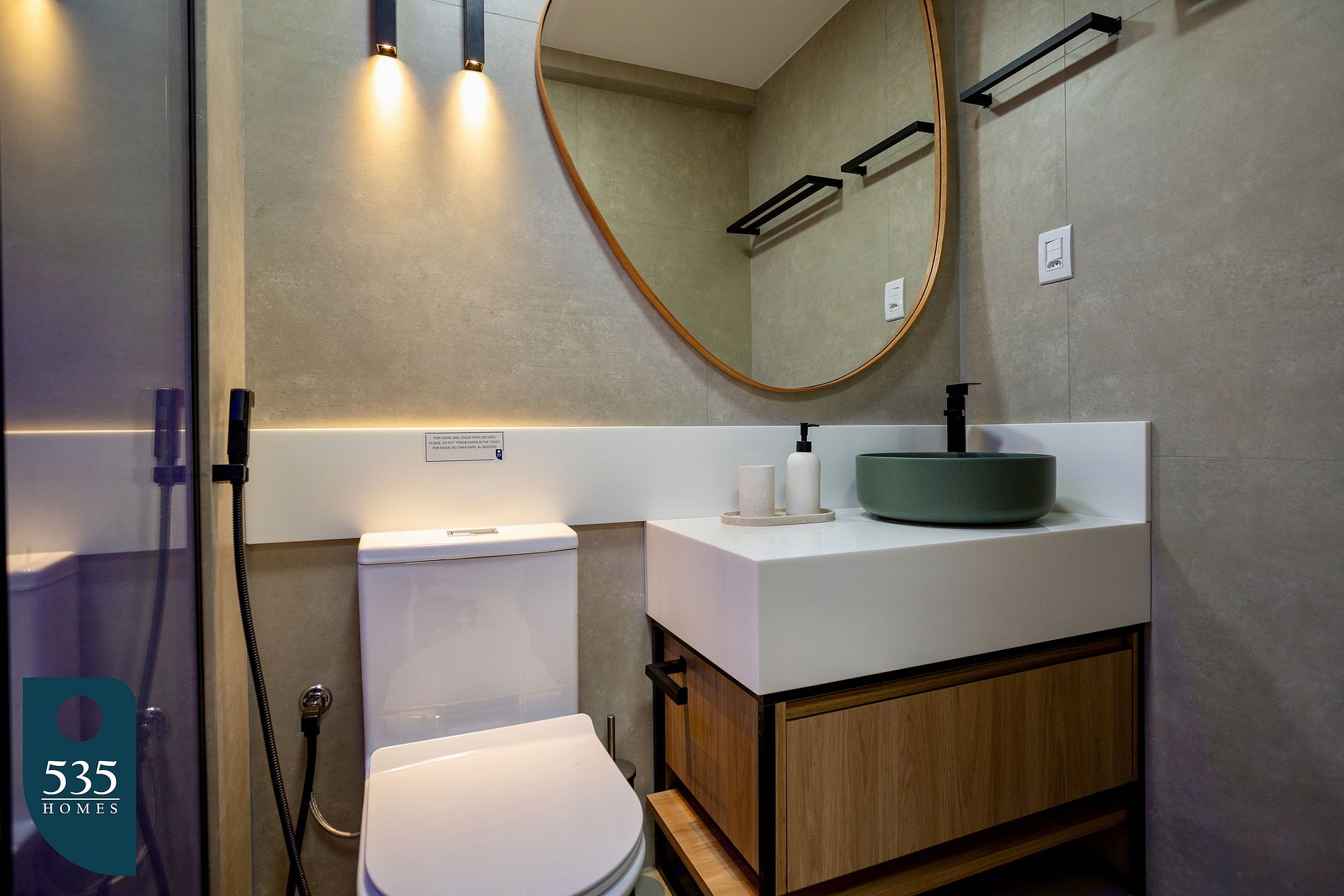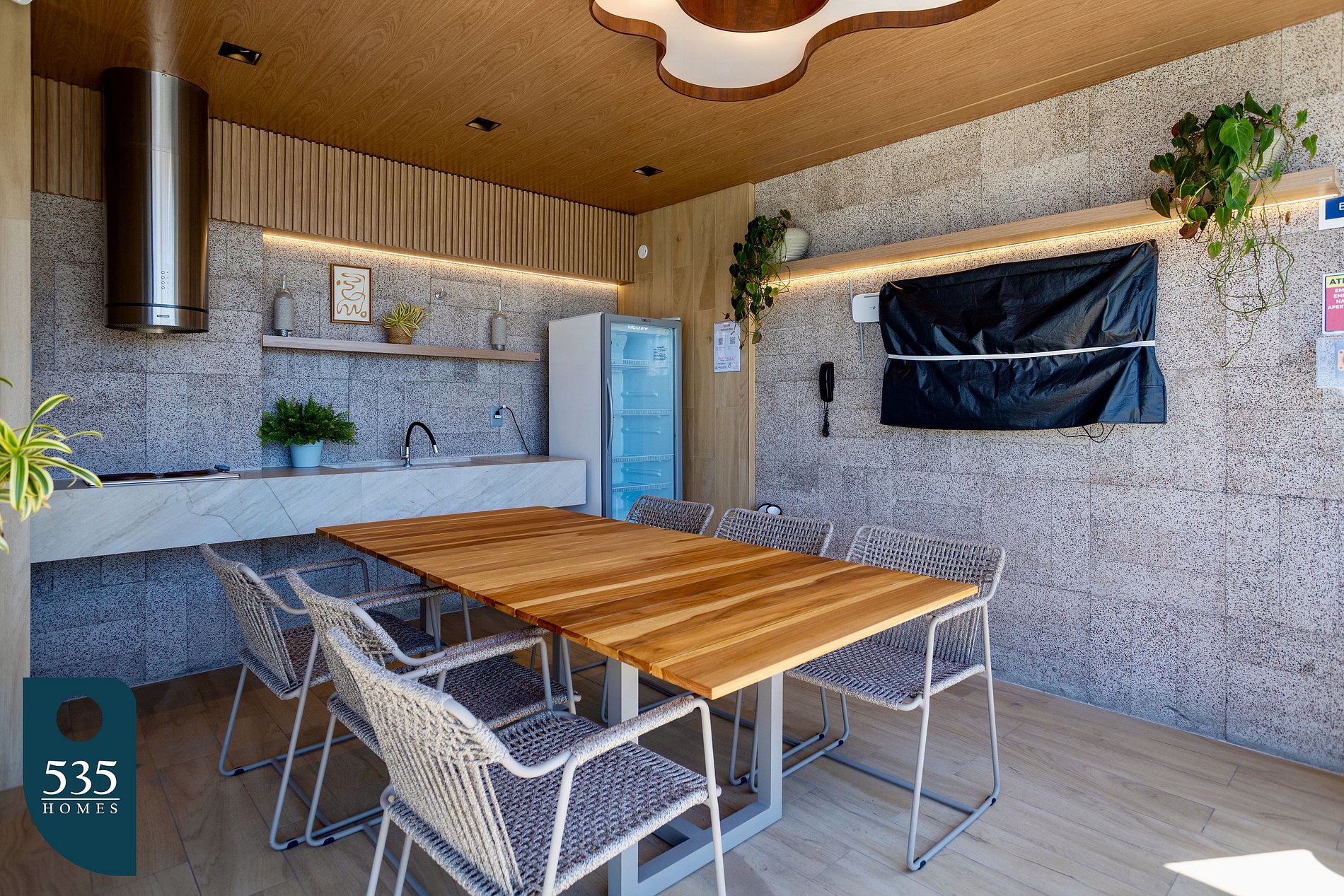 O apartamento oferece uma estrutura completa e funcional, ideal para quem busca praticidade sem abrir mão do conforto. A cozinha é equipada com cooktop de indução com duas bocas, depurador de ar retrátil, purificador de água, geladeira, micro-ondas com grill, torre de tomadas, torneira gourmet, liquidificador, sanduicheira, airfryer, máquina de café.
