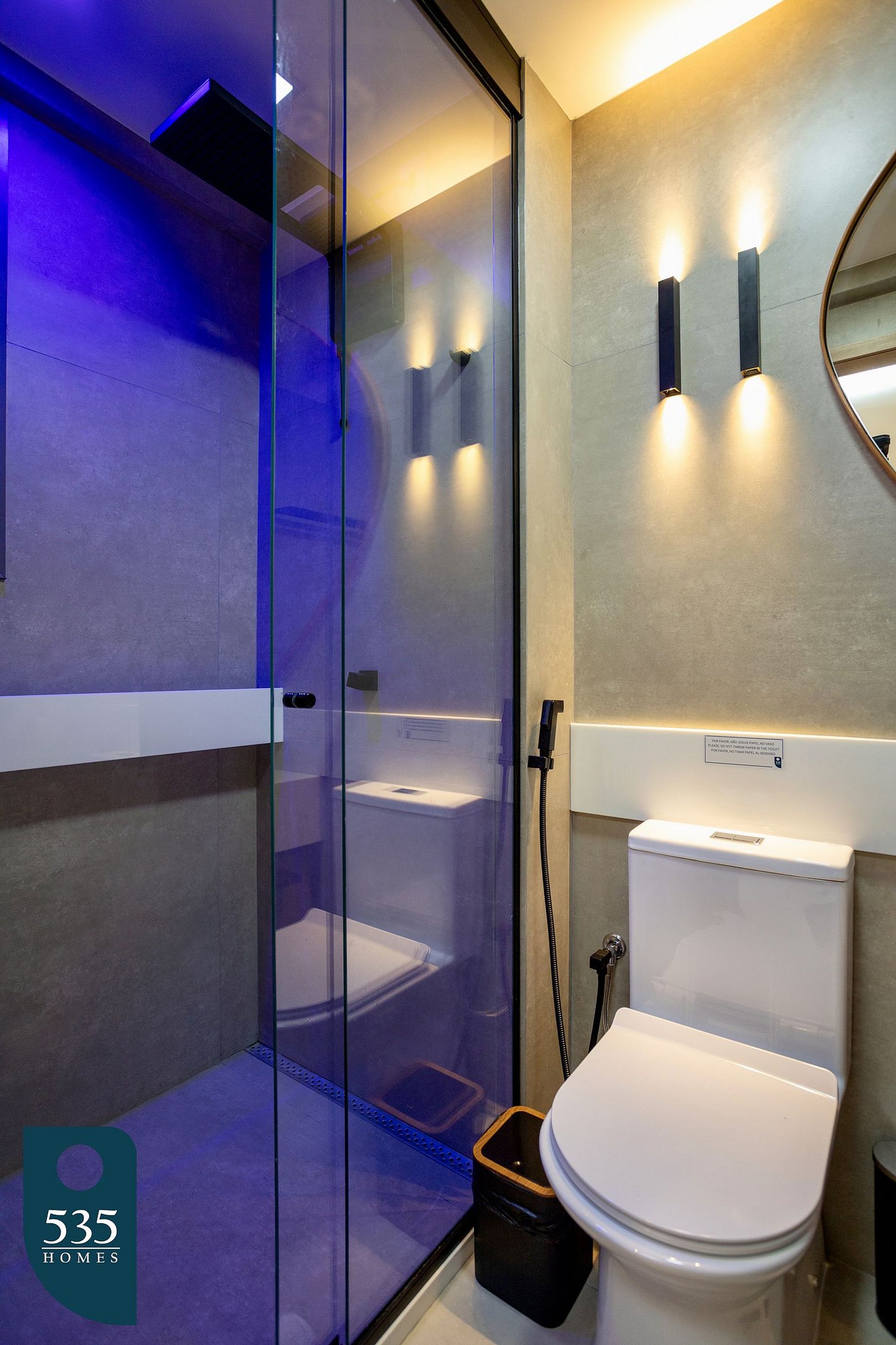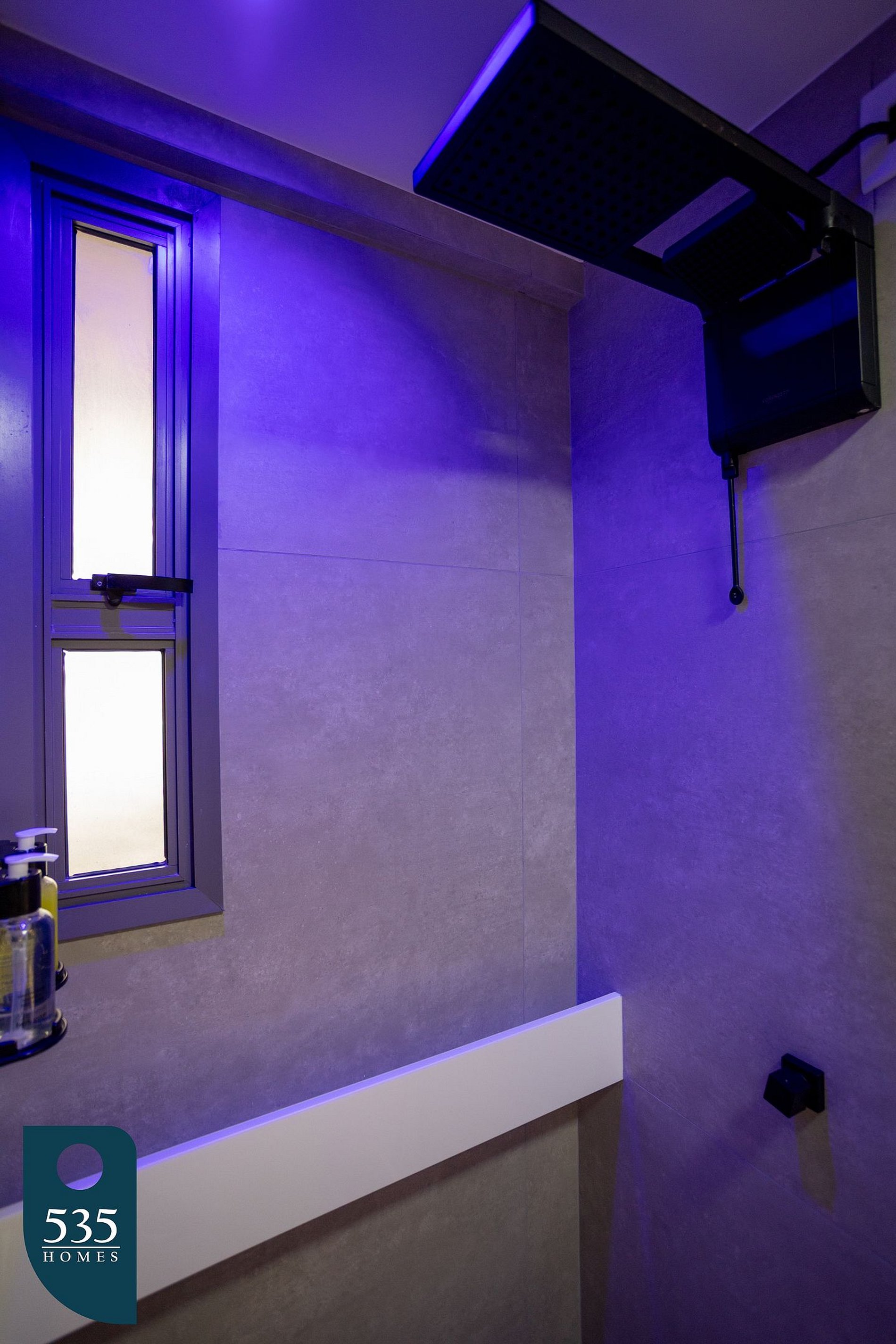 O banheiro dispõe de chuveiro elétrico, secador de cabelo e uma luminária com cromoterapia na cor azul, que proporciona um toque de relaxamento ao ambiente.