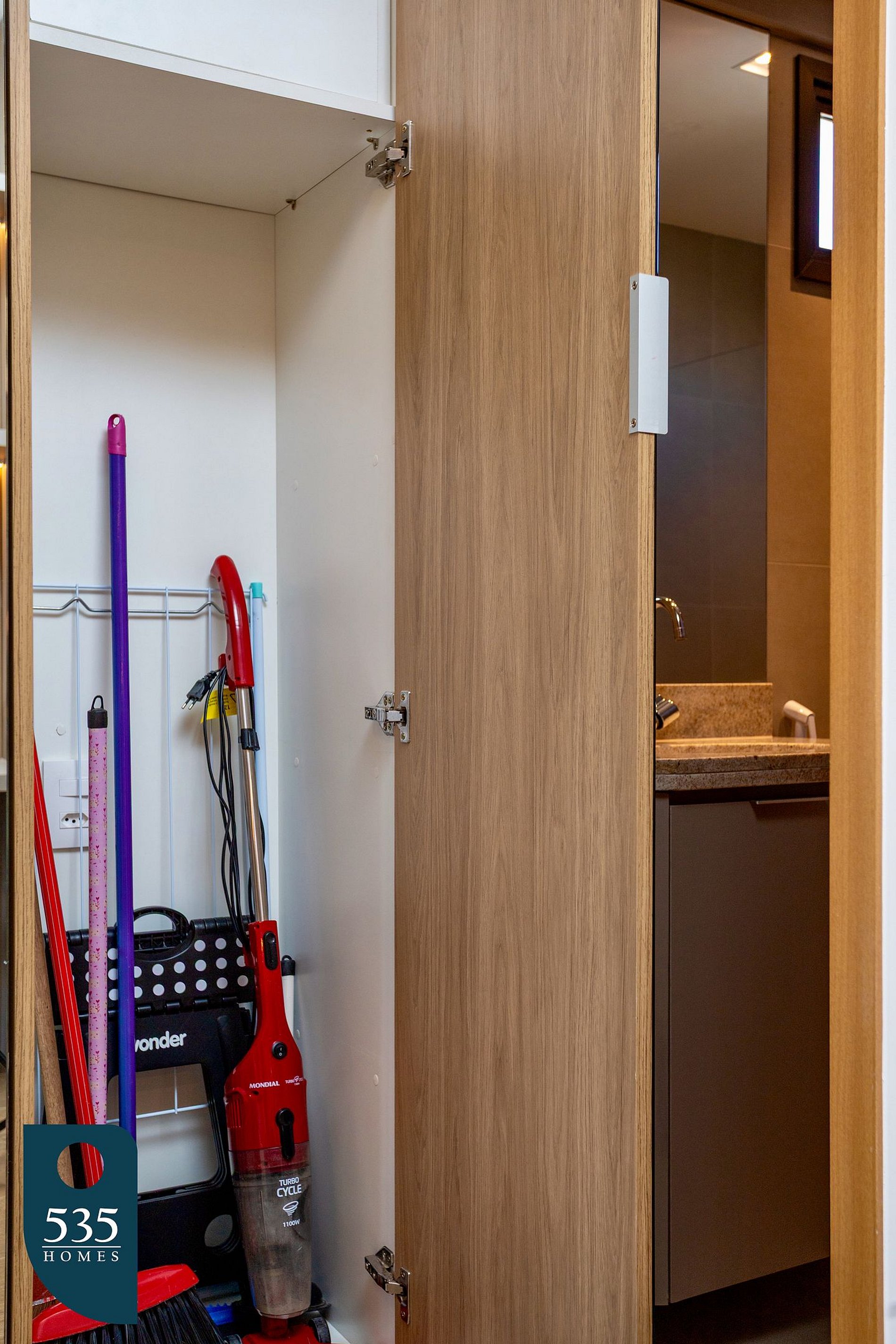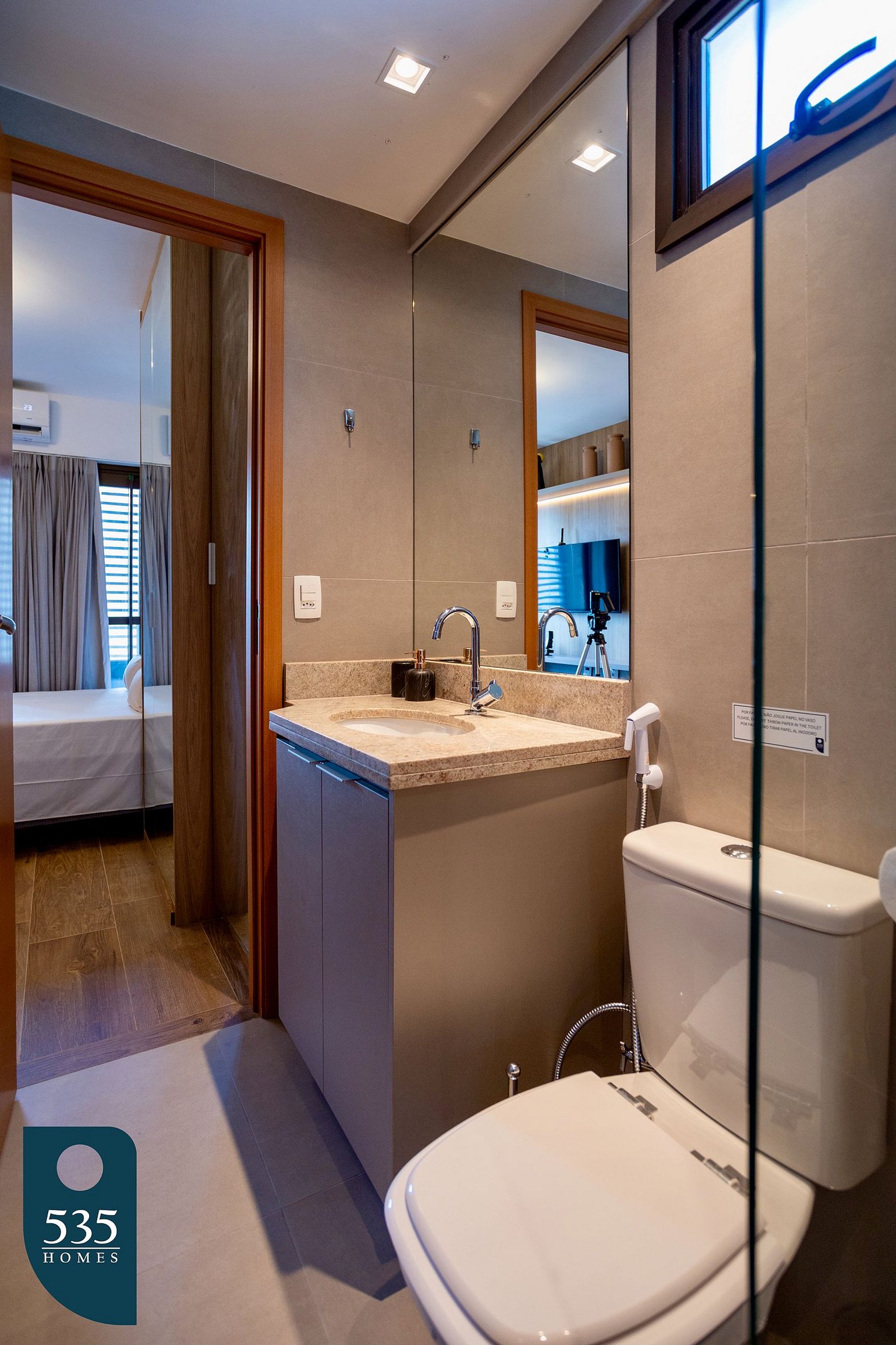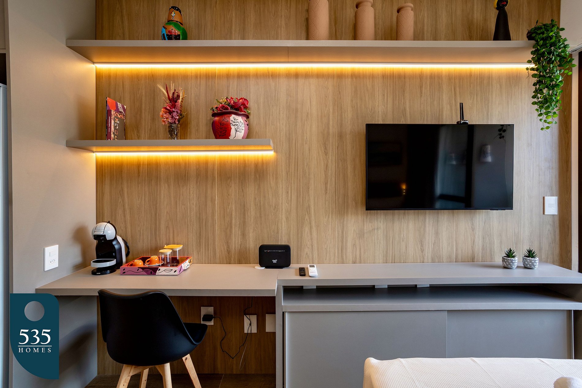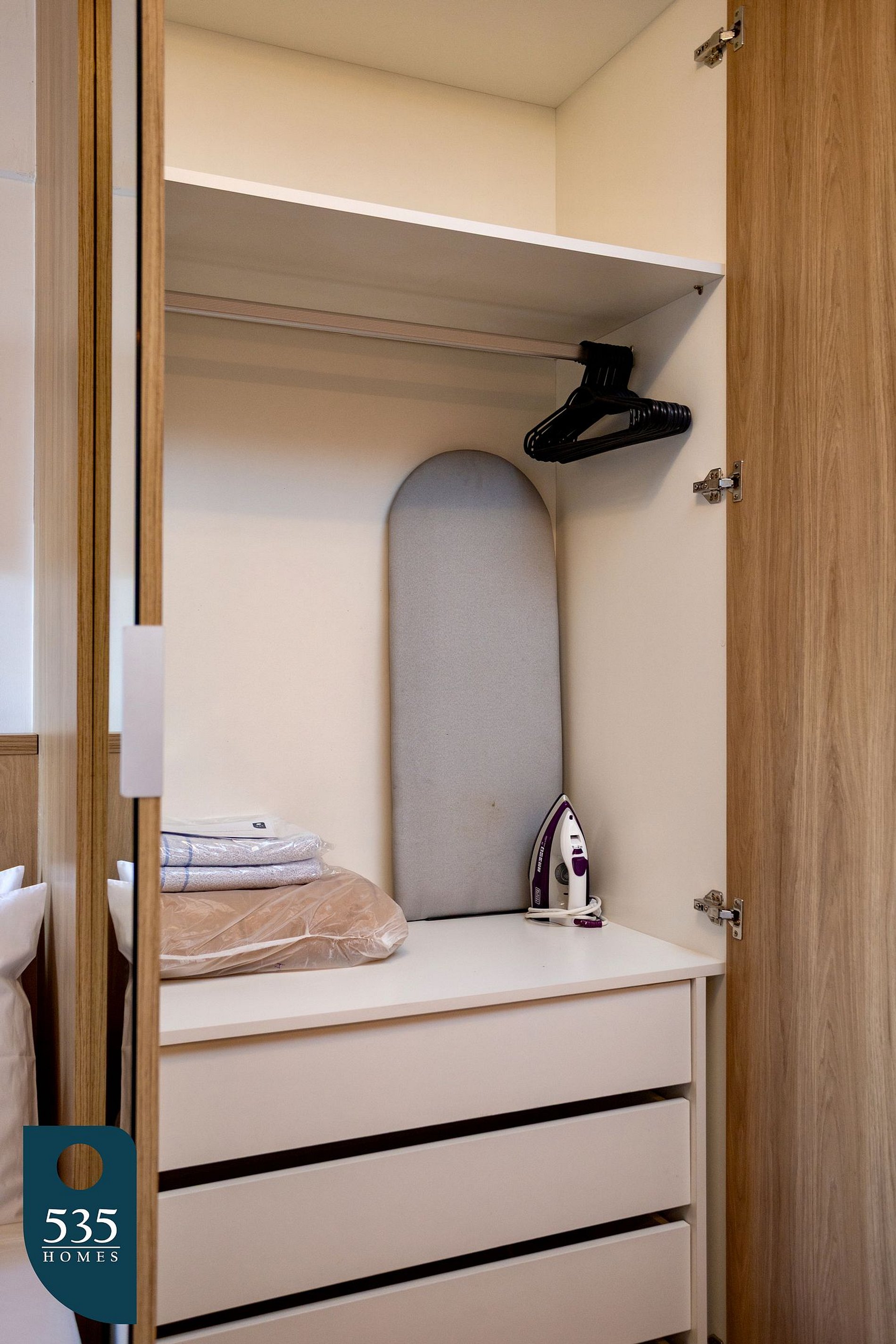O quarto oferece conforto e funcionalidade, com ar-condicionado, Smart TV de 43”, estação de trabalho com cadeira, cortinas blackout e luminária com opções de luz fria e quente. Para mais comodidade, há ferro e mesa de passar roupa, cabides, varal de chão e itens de limpeza como rodo, vassoura e pá de lixo.