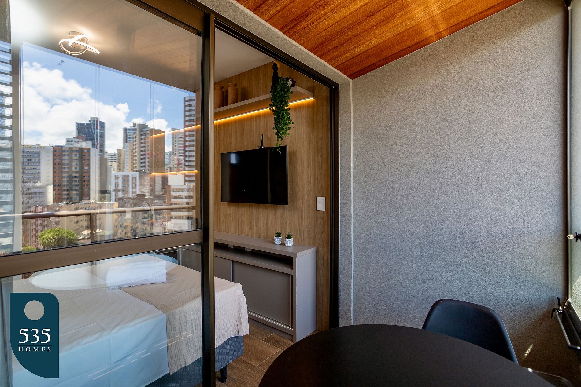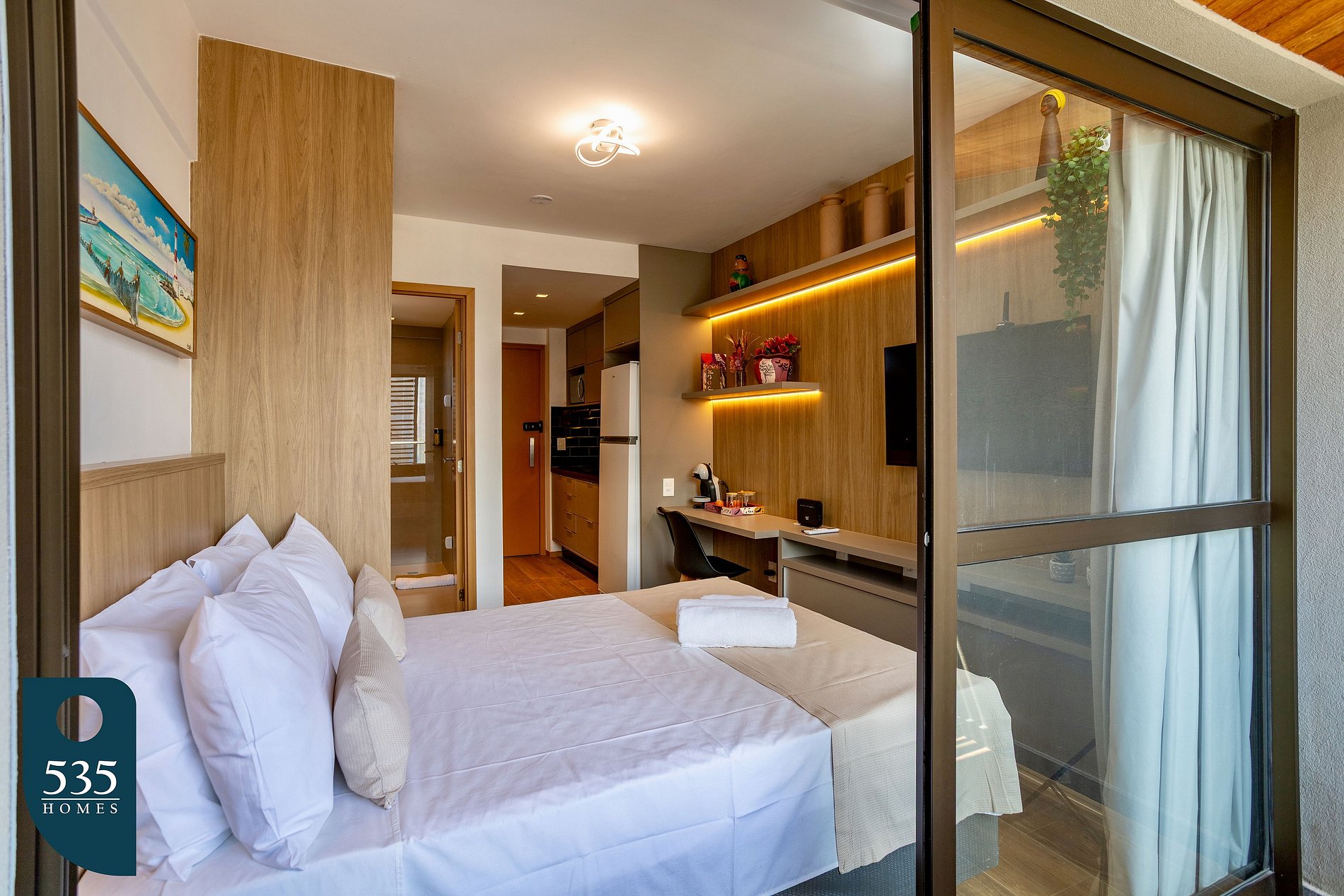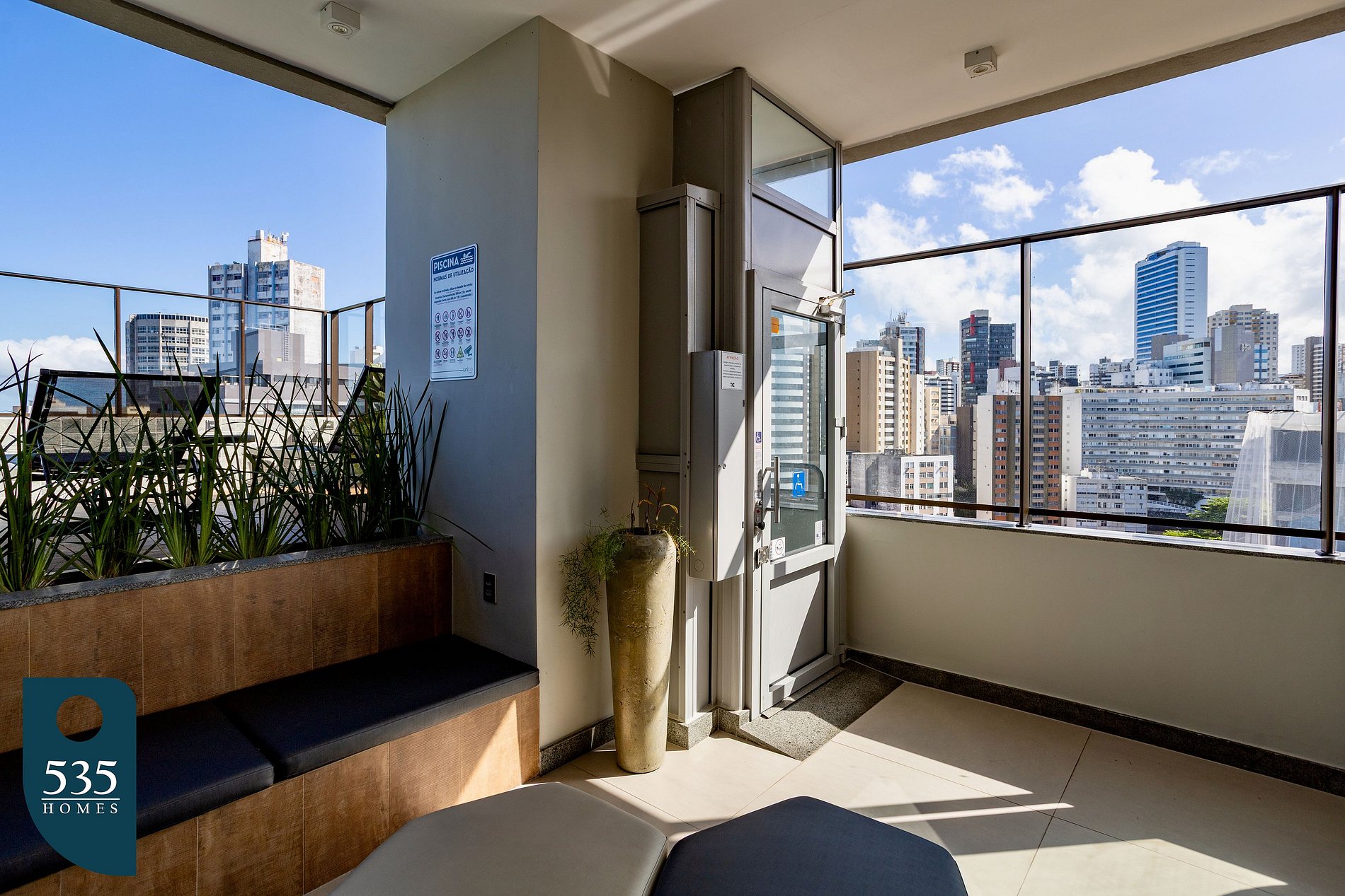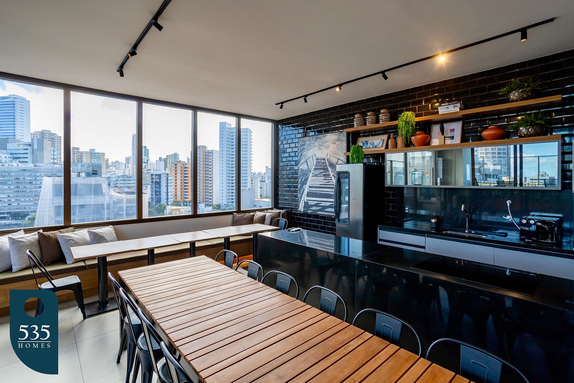 Na cobertura, os hóspedes encontram um lounge aconchegante e área gourmet equipada, também com acesso por reconhecimento facial, além de banheiro acessível para maior comodidade.