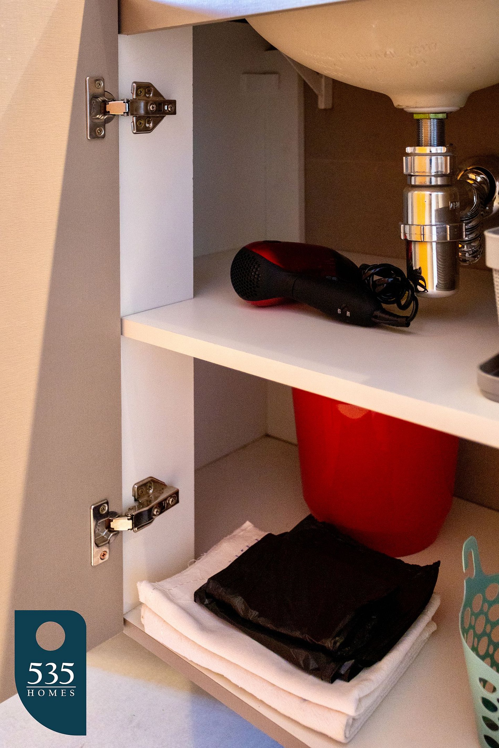 O banheiro é moderno e bem equipado, com chuveiro elétrico, ducha higiênica, secador de cabelo e lixeira, oferecendo praticidade no dia a dia. Também estão disponíveis balde e pregadores de roupa para quem precisar.