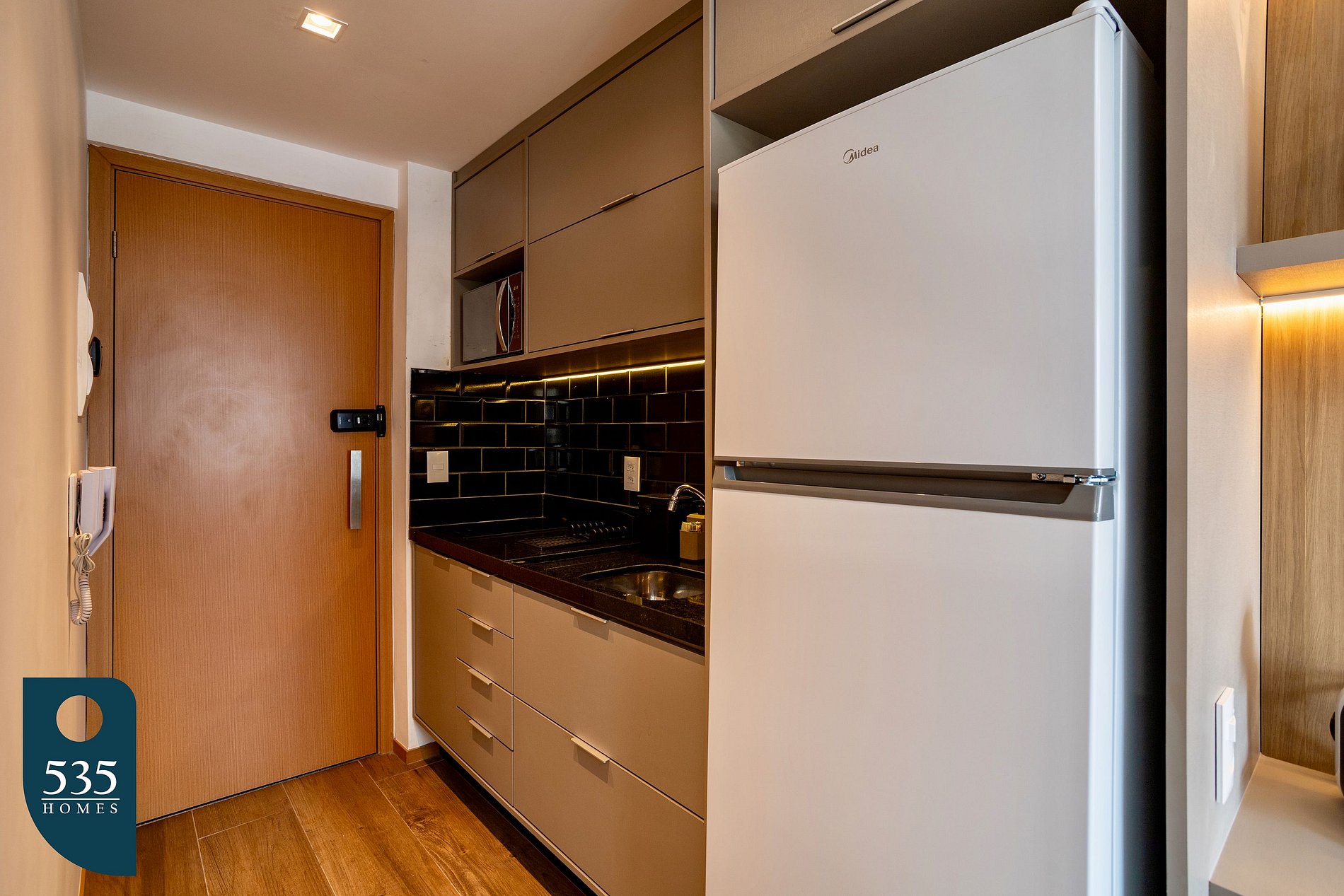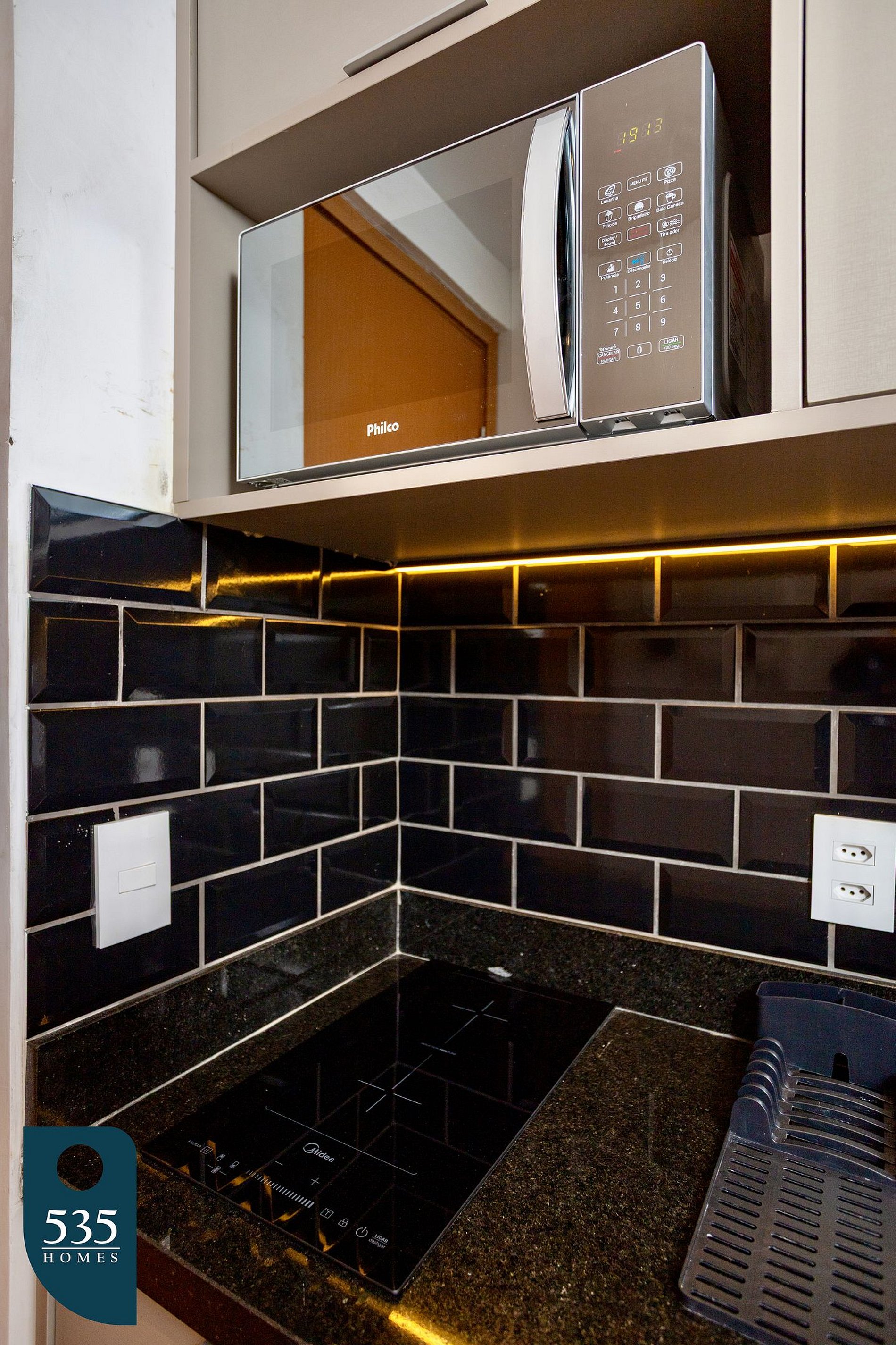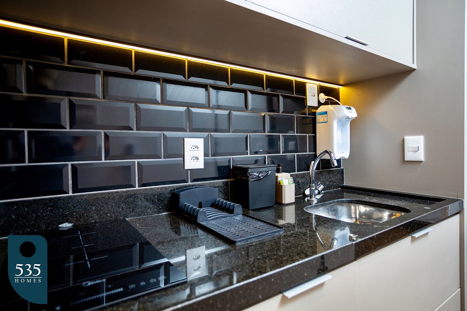 Na cozinha, você encontra um espaço completo e bem equipado, ideal para quem gosta de cozinhar ou preparar refeições rápidas no dia a dia. O ambiente conta com cooktop de indução de duas bocas, micro-ondas, geladeira, purificador de água, máquina de café, airfryer, chaleira elétrica, liquidificador e sanduicheira. Além disso, dispõe de diversos utensílios, incluindo abridor de vinho, cortador de pizza, ralador e peneiras, garantindo toda a praticidade durante a estadia.