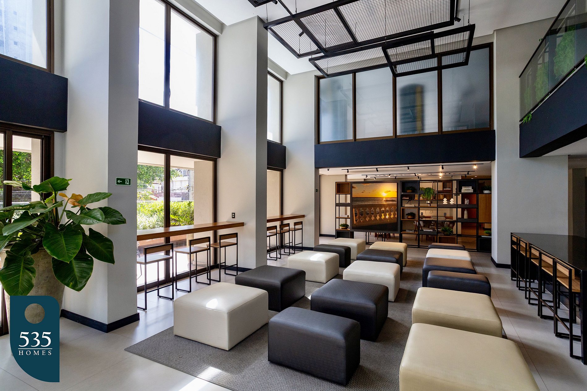 O térreo oferece espaço de coworking de livre acesso, enquanto o bicicletário e o mercado de conveniência ainda estão em fase de implantação.