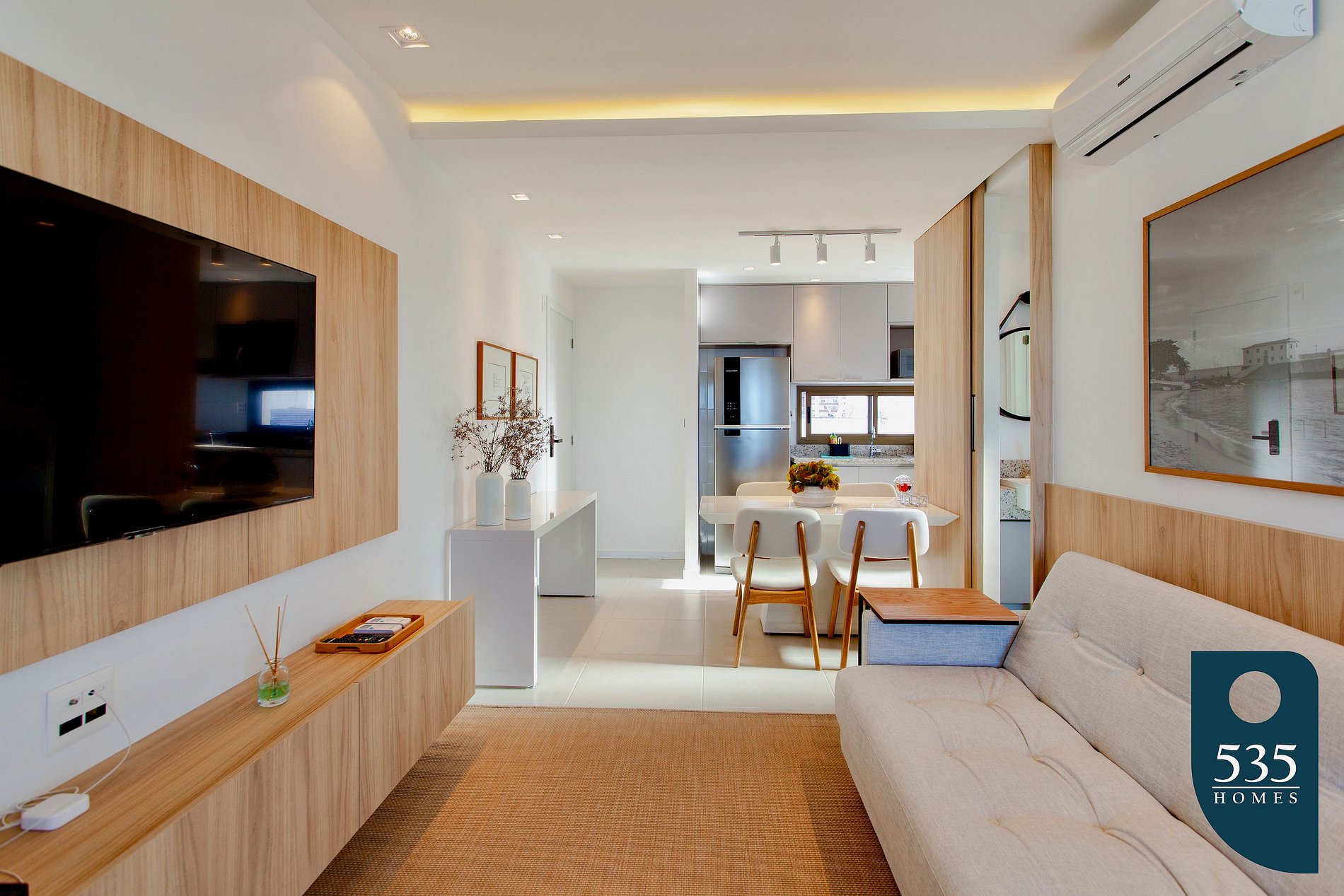 O apartamento é repleto de janelas, o que o torna arejado e iluminado.