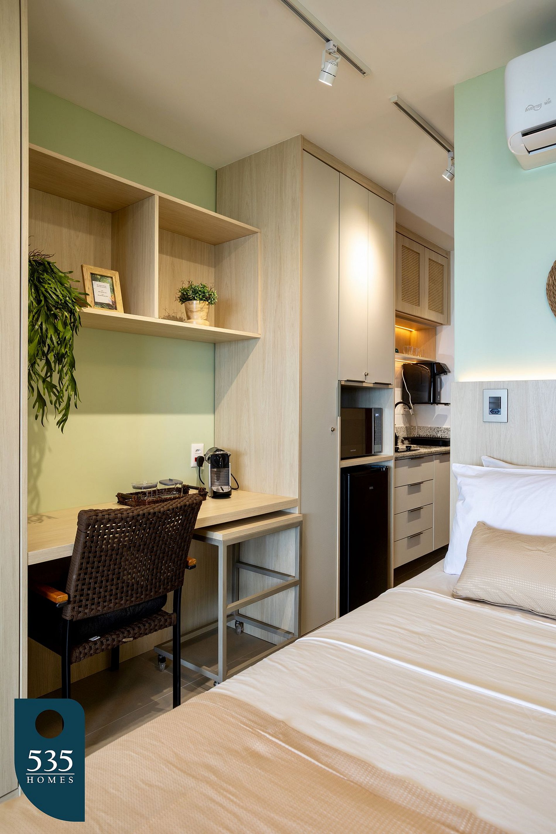 O apartamento é completo e cuidadosamente equipado para garantir conforto e praticidade durante a estadia. A cozinha dispõe de bebedouro elétrico, micro-ondas, frigobar, cooktop vitrocerâmico de duas bocas, liquidificador, sanduicheira, cafeteira italiana, máquina de café e utensílios de cozinha diversos que permitirão preparar refeições por conta própria. O banheiro conta com chuveiro elétrico, ducha higiênica, varal de parede, secador de cabelo e espelho. O quarto oferece ar-condicionado, cabides e espelho de corpo inteiro. A sala possui cortinas blackout, Smart TV de 44 polegadas e ventilador de teto. A varanda conta com fechamento em Reiki, proporcionando conforto e privacidade. A lavanderia está equipada com varal de chão, tábua e ferro de passar roupa. Há uma nova construção em andamento no endereço vizinho, e a vista do apartamento pode ter mudado durante a sua estadia. O prédio possui um café, o Seven Wonders Café, que funciona todos os dias para facilitar que refeições rápidas sejam feitas com conforto e comodidade.