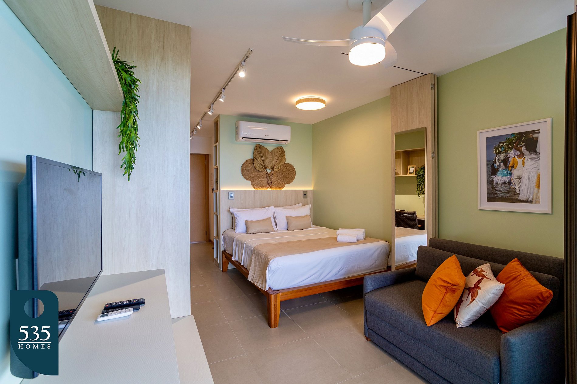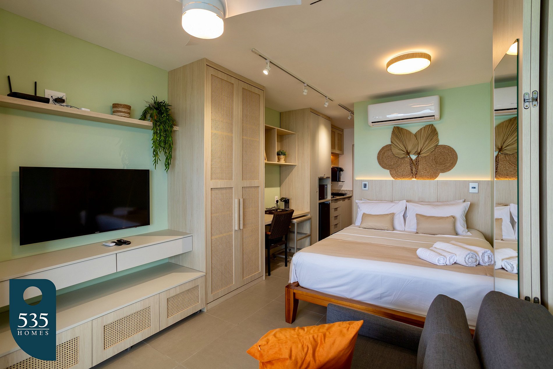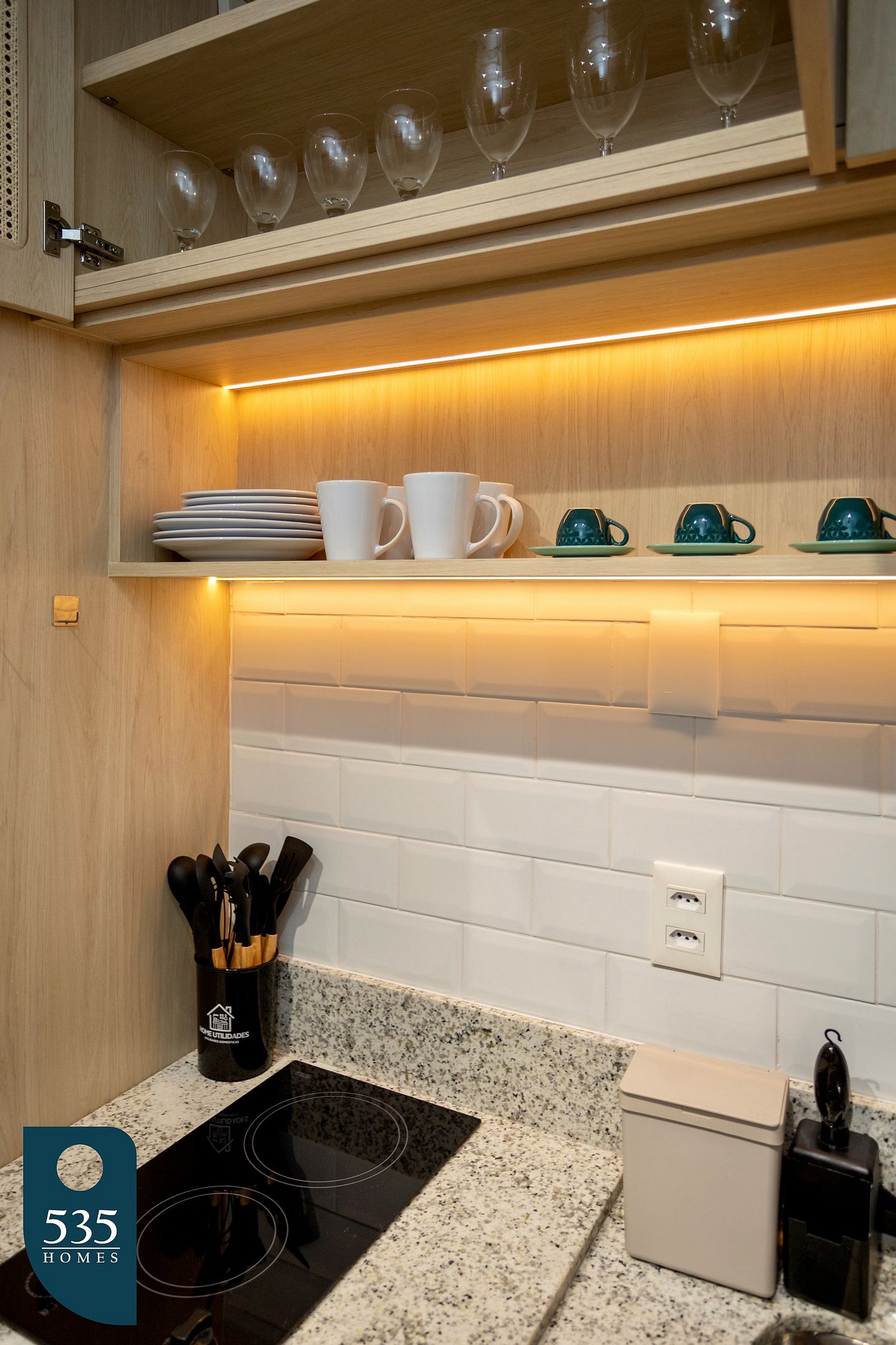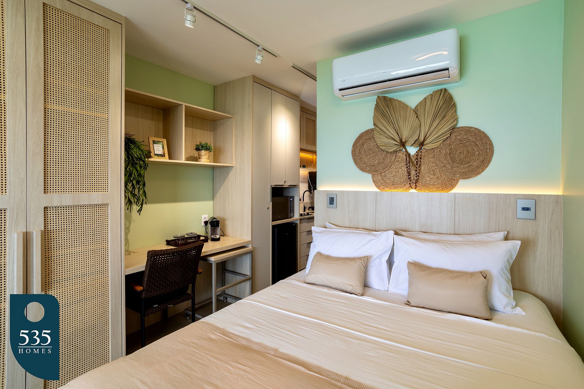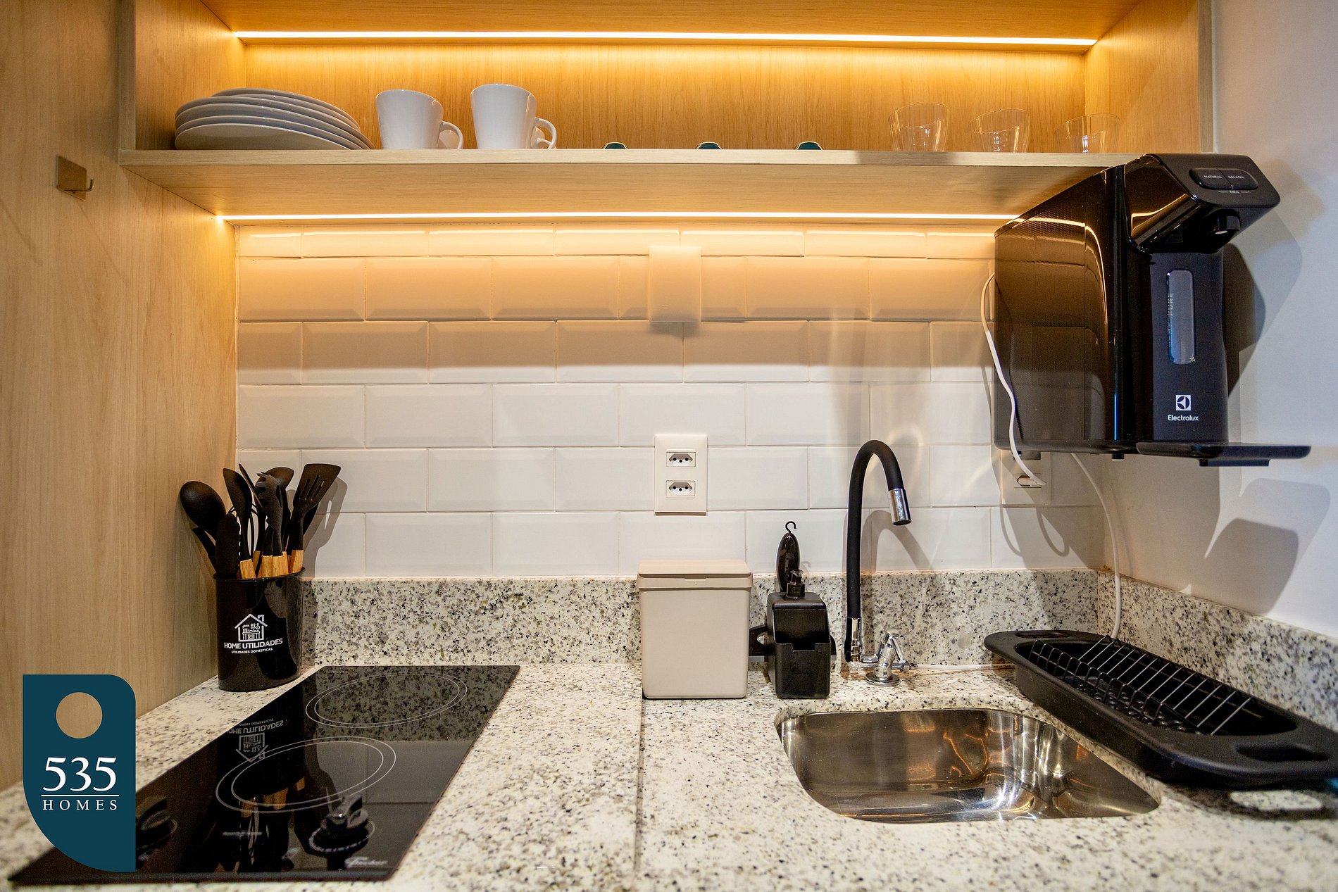 O apartamento é completo e cuidadosamente equipado para garantir conforto e praticidade durante a estadia. A cozinha dispõe de bebedouro elétrico, micro-ondas, frigobar, cooktop vitrocerâmico de duas bocas, liquidificador, sanduicheira, cafeteira italiana, máquina de café e utensílios de cozinha diversos que permitirão preparar refeições por conta própria. O banheiro conta com chuveiro elétrico, ducha higiênica, varal de parede, secador de cabelo e espelho. O quarto oferece ar-condicionado, cabides e espelho de corpo inteiro. A sala possui cortinas blackout, Smart TV de 44 polegadas e ventilador de teto. A varanda conta com fechamento em Reiki, proporcionando conforto e privacidade. A lavanderia está equipada com varal de chão, tábua e ferro de passar roupa. Há uma nova construção em andamento no endereço vizinho, e a vista do apartamento pode ter mudado durante a sua estadia. O prédio possui um café, o Seven Wonders Café, que funciona todos os dias para facilitar que refeições rápidas sejam feitas com conforto e comodidade.