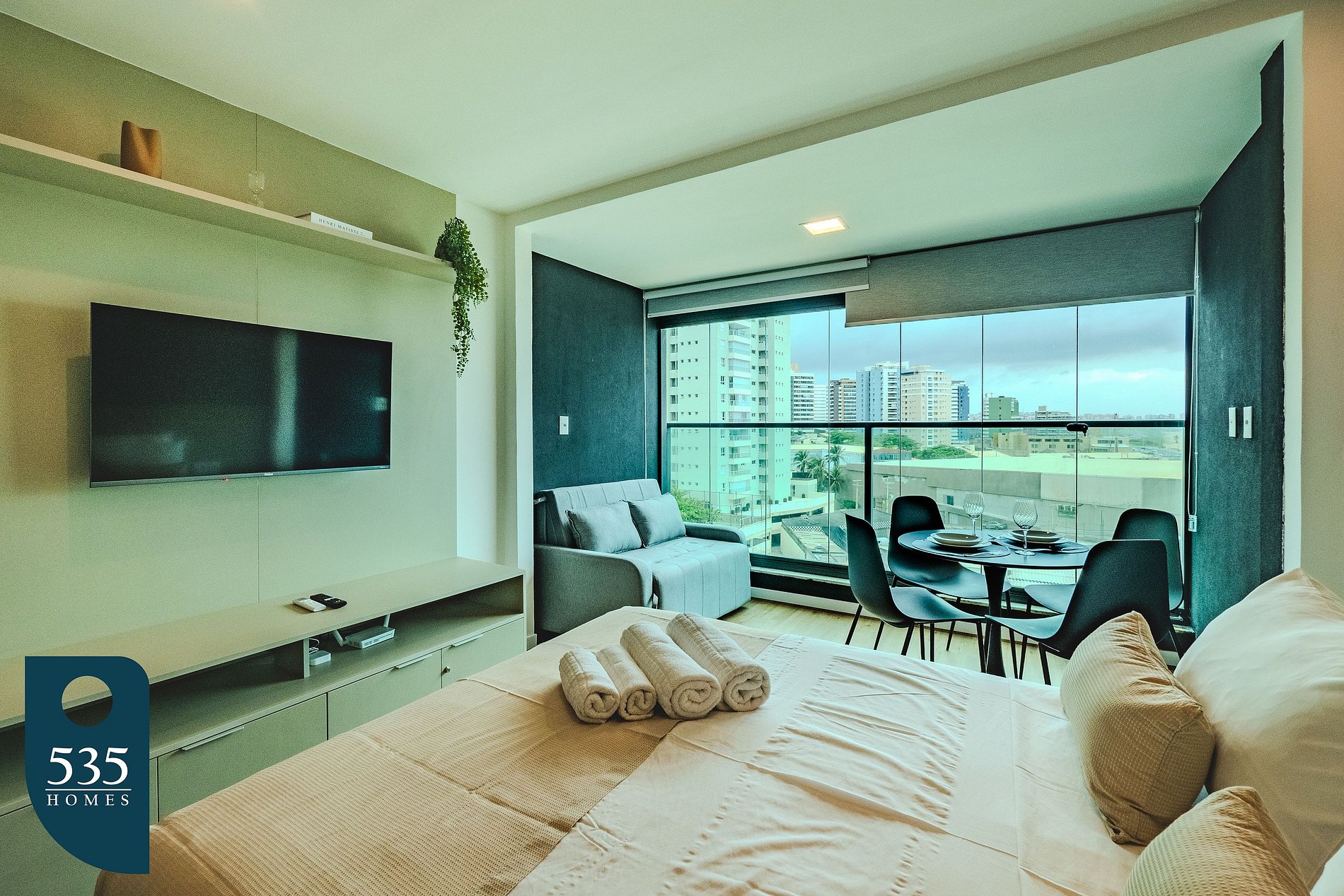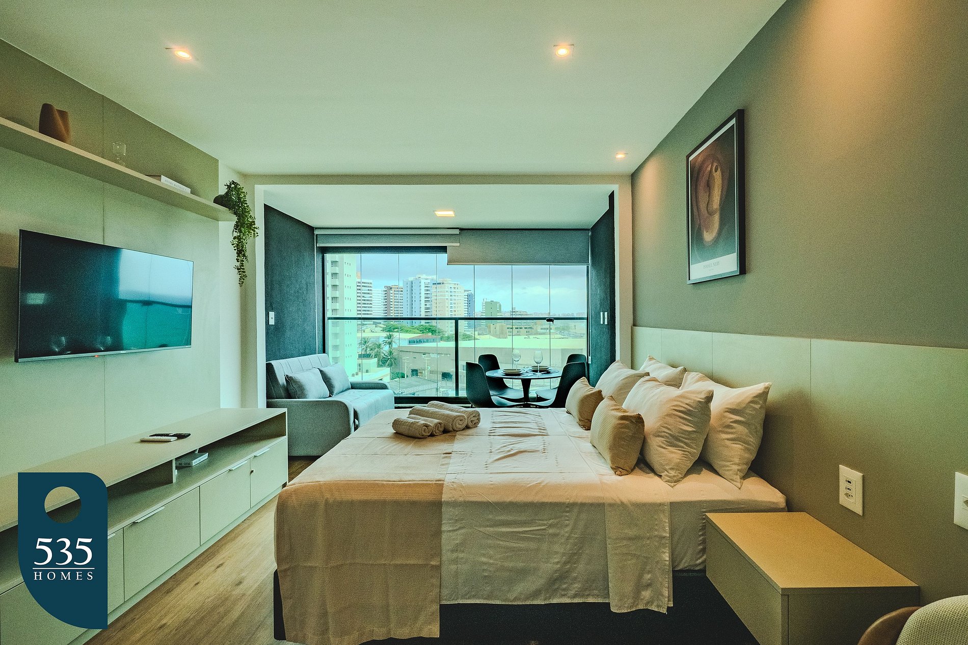 No quarto com closet, há ar-condicionado, Smart TV de 43”, penteadeira, espelho, ferro e mesa de passar roupa, oferecendo conforto e comodidade. A varanda possui fechamento em Reiki, mesa com cadeiras, sofá-cama e persiana rolô, criando um ambiente agradável para relaxar.