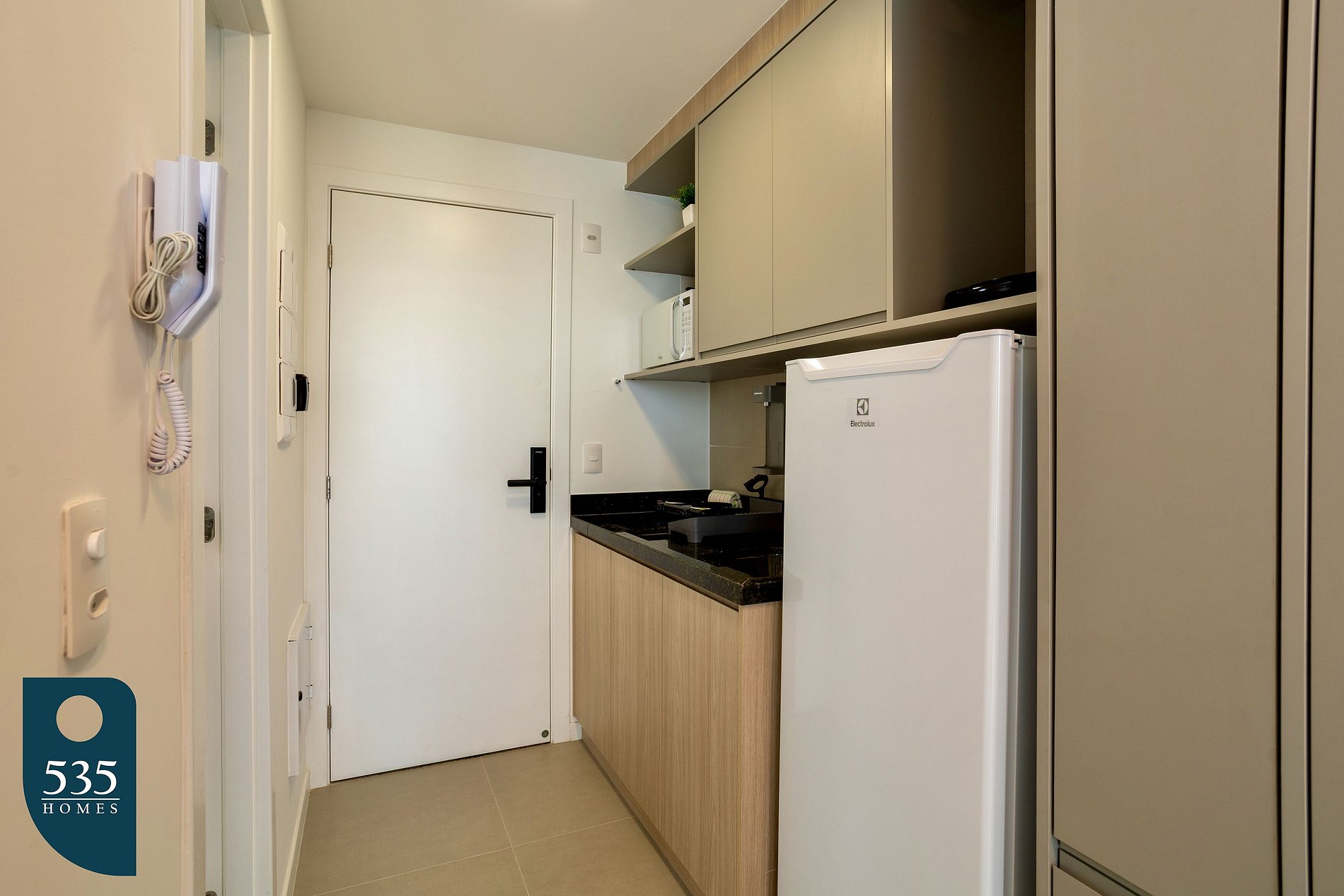A cozinha dispõe de geladeira, micro-ondas, liquidificador, sanduicheira, purificador de água, cafeteira elétrica, cafeteira italiana, cooktop elétrico com duas bocas e jogo de panelas com tampa, proporcionando praticidade no preparo das refeições.