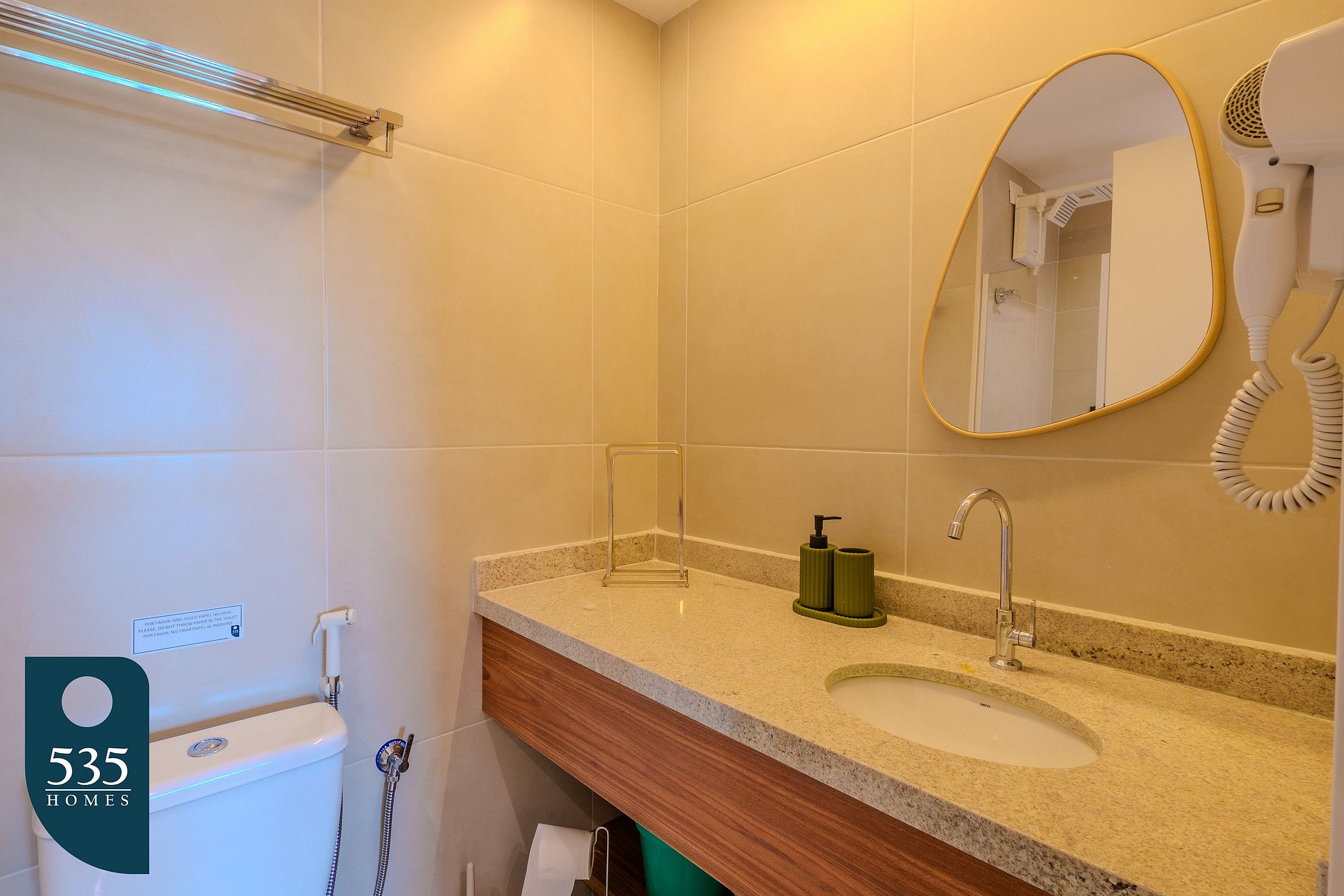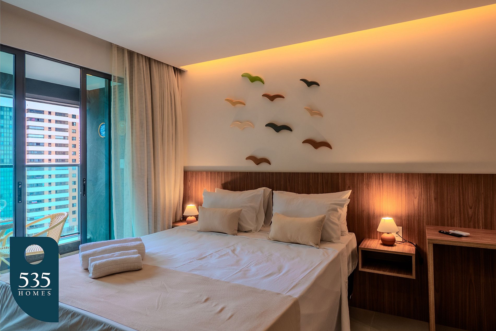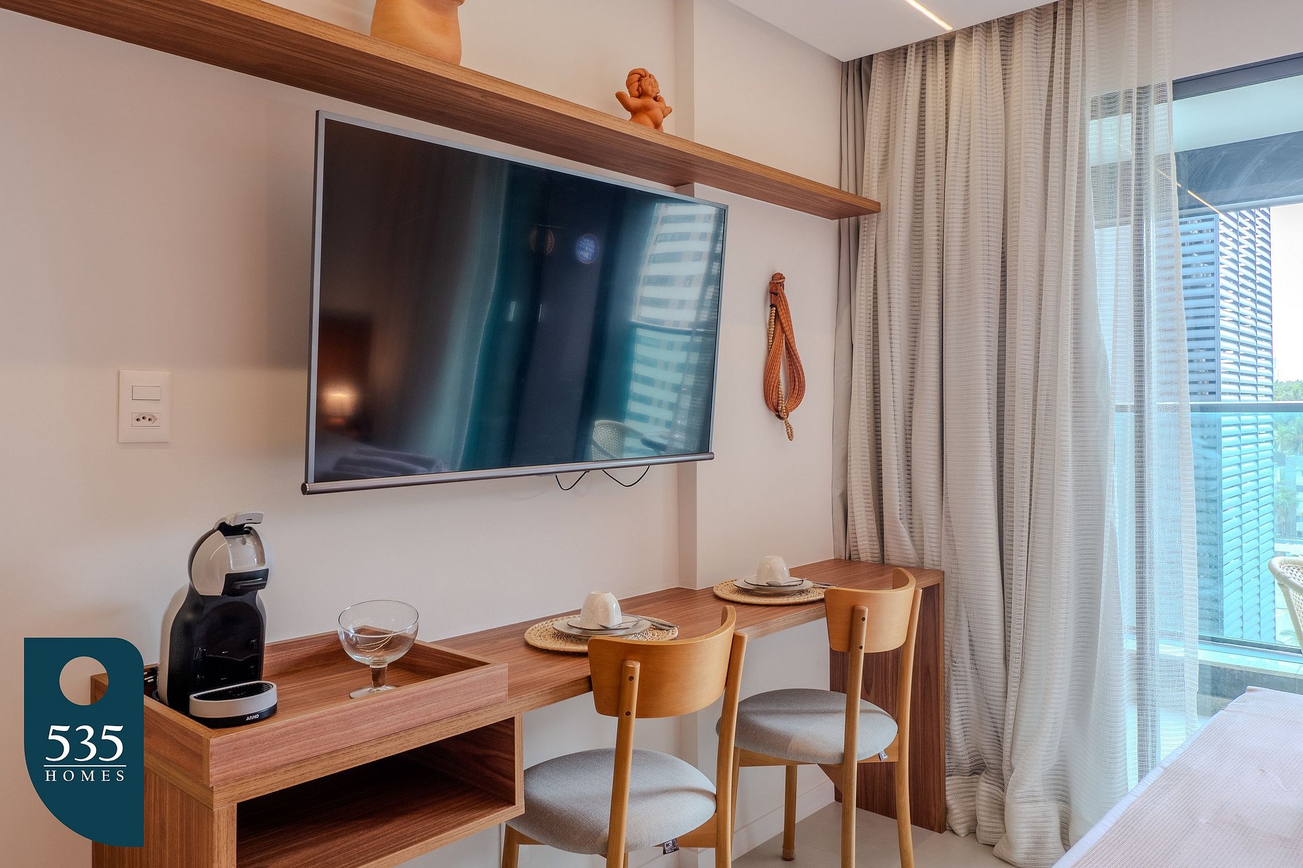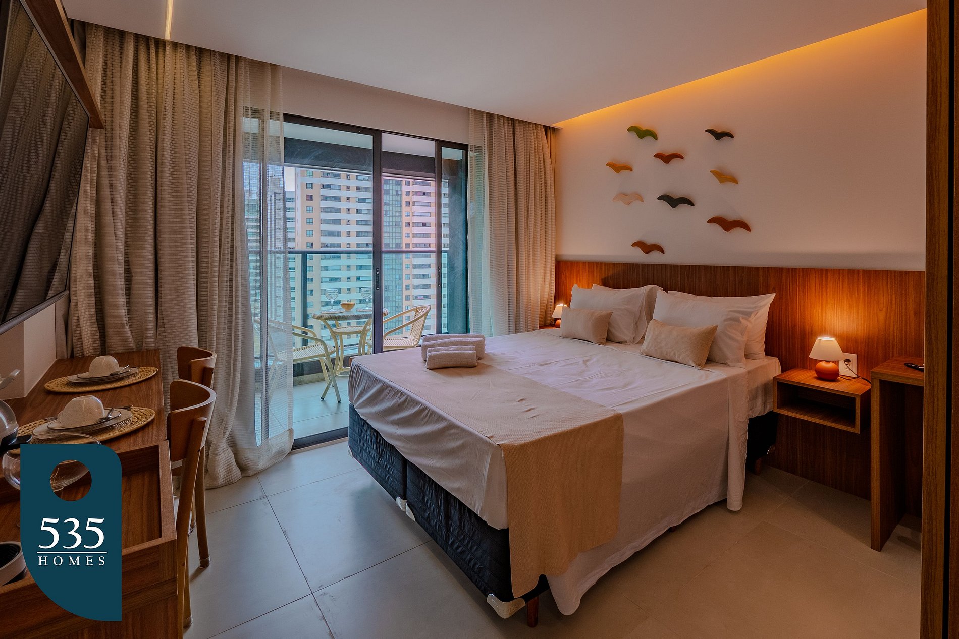 No quarto com closet, o ambiente conta com Smart TV de 50 polegadas, ar-condicionado, estação de trabalho com cadeira regulável, espelho de corpo, mesa de passar roupa compacta e ferro elétrico, proporcionando comodidade tanto para descanso quanto para atividades do dia a dia. O banheiro oferece chuveiro elétrico e secador de cabelo garantindo conforto e praticidade. A varanda complementa o espaço, oferecendo um ambiente agradável para relaxar..