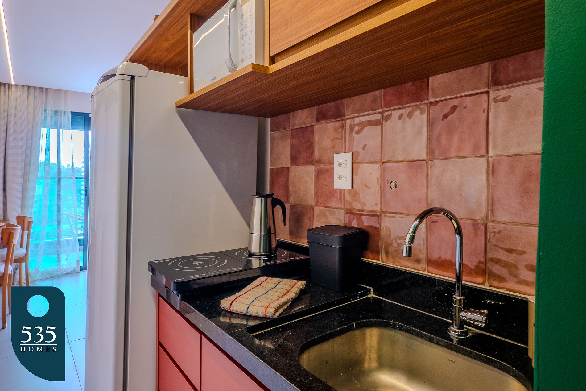 O apartamento por temporada é totalmente equipado para oferecer praticidade e conforto durante a estadia. A cozinha dispõe de geladeira, micro-ondas, sanduicheira, máquina de café, cafeteira italiana, cooktop de indução com duas bocas, taças e jogo de panelas com tampa, garantindo funcionalidade no preparo das refeições.