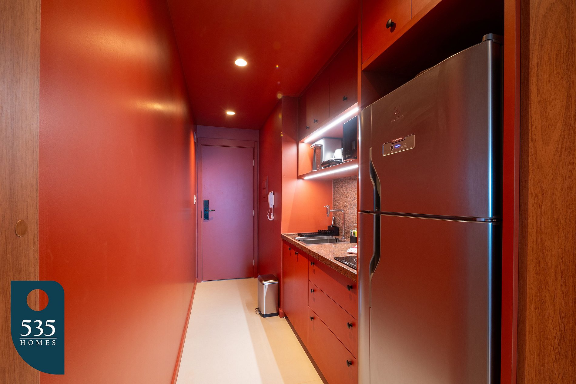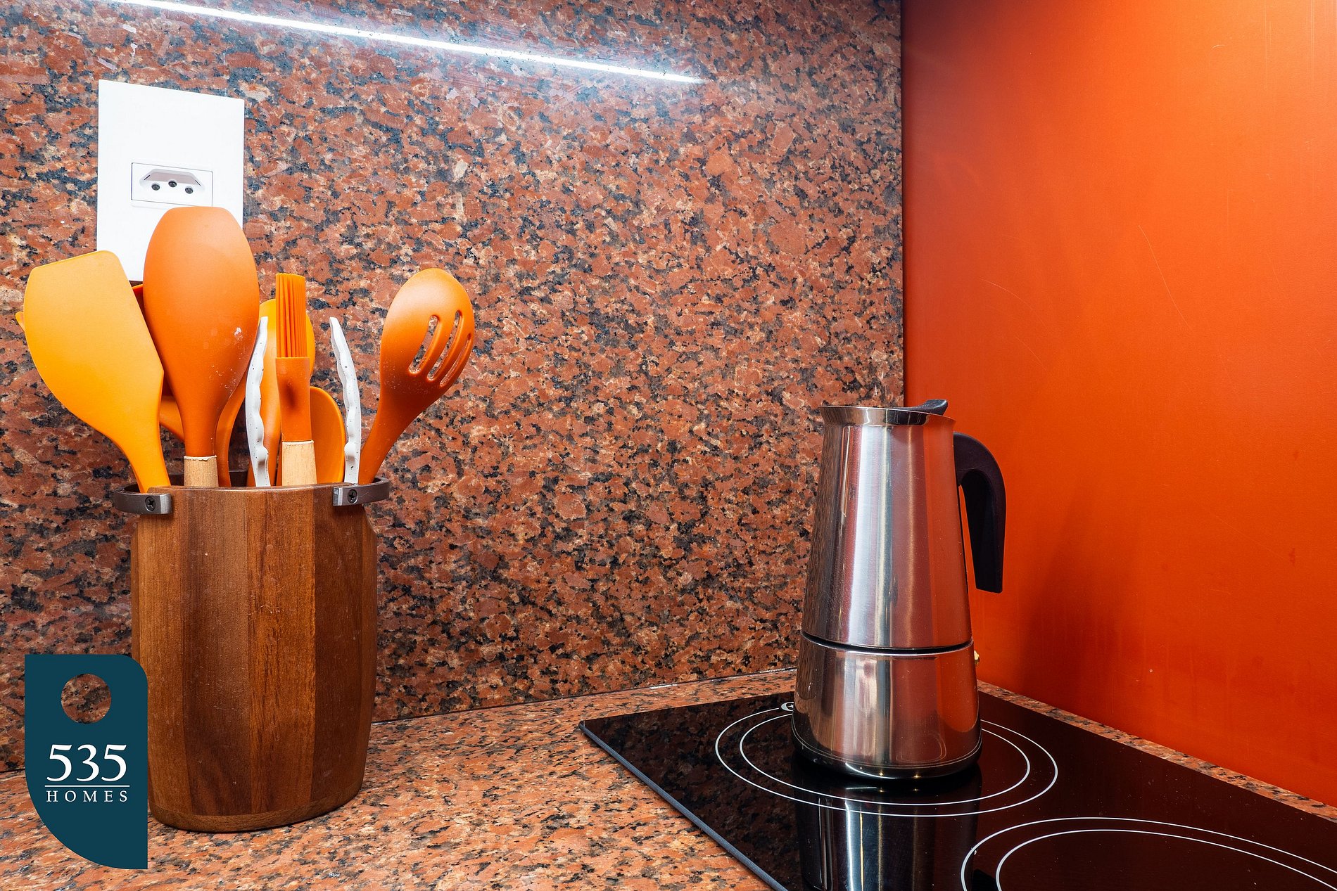 Este apartamento por temporada oferece praticidade e conforto com uma estrutura completa. A cozinha é equipada com geladeira, micro-ondas, sanduicheira, torradeira, airfryer, bebedouro, cafeteira elétrica, cafeteira italiana, máquina de café, liquidificador, chaleira elétrica, cooktop de indução com duas bocas, copos e jogo de panelas. Também conta com ferro elétrico e mesa de passar roupa, garantindo funcionalidade no dia a dia.