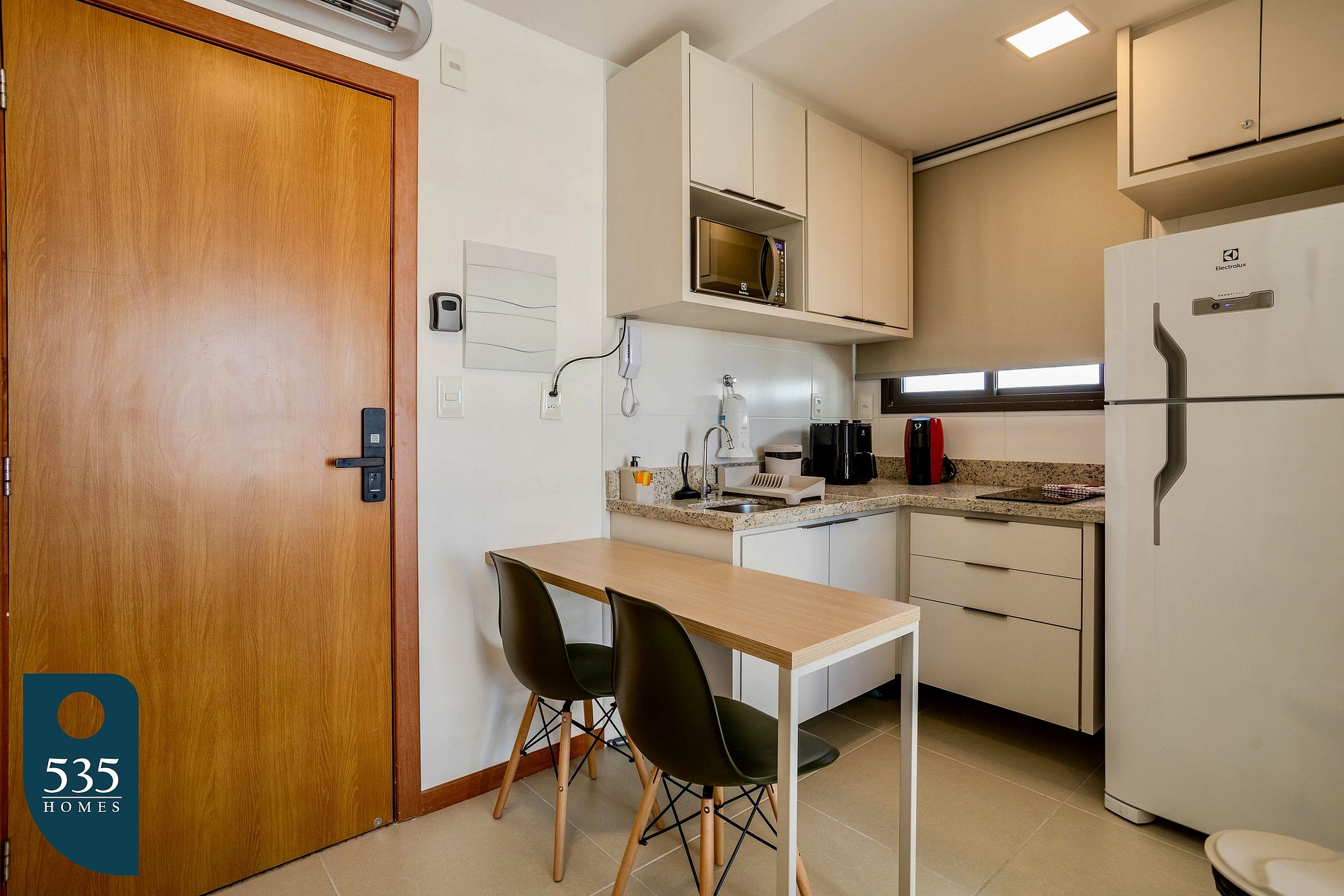 A cozinha é equipada com geladeira, micro-ondas, cooktop vitrocerâmico com duas bocas, purificador de água, máquina de café, sanduicheira, airfryer, liquidificador, cafeteira italiana e jogo de panelas com tampa, oferecendo praticidade para o preparo das refeições. No quarto, o apartamento conta com ar-condicionado, cortina com blackout, Smart TV de 32 polegadas, ferro elétrico com mesa de passar roupa compacta e uma estação para trabalho, garantindo conforto e funcionalidade durante a estadia. O banheiro dispõe de chuveiro elétrico e secador de cabelo, atendendo às necessidades do dia a dia. A varanda possui mesa e cadeiras para refeições, proporcionando um espaço agradável para relaxar ao ar livre.