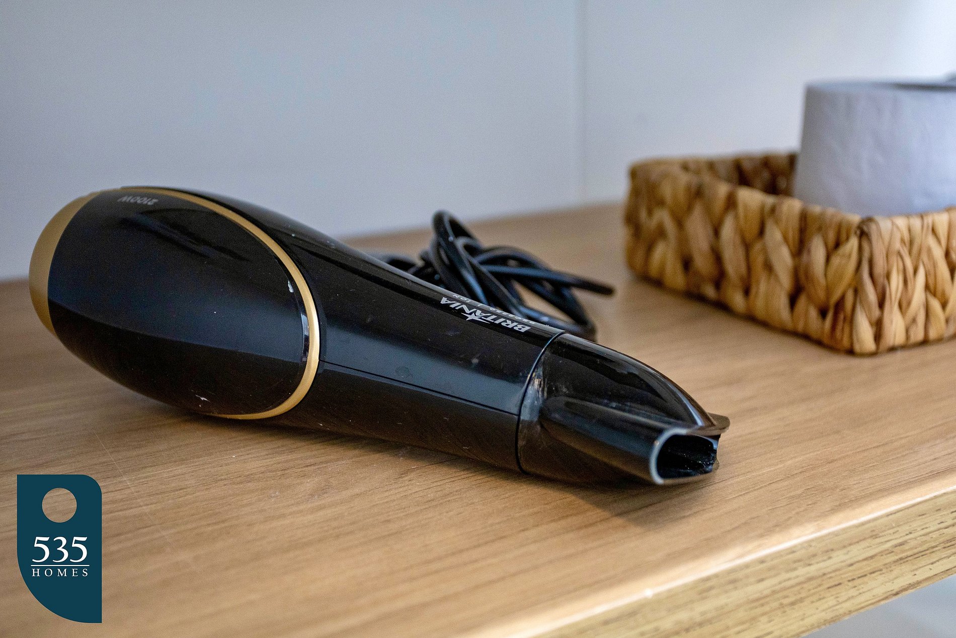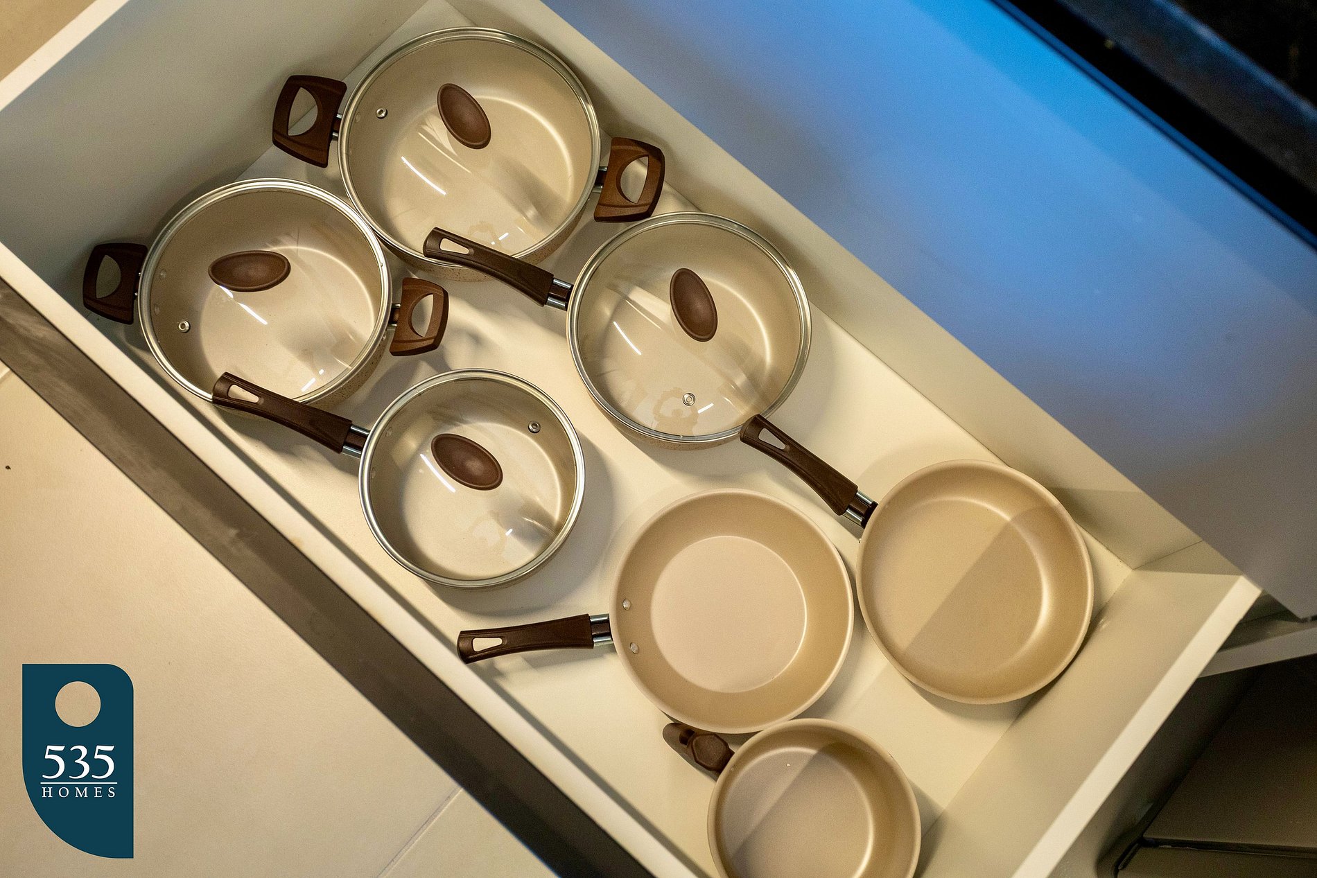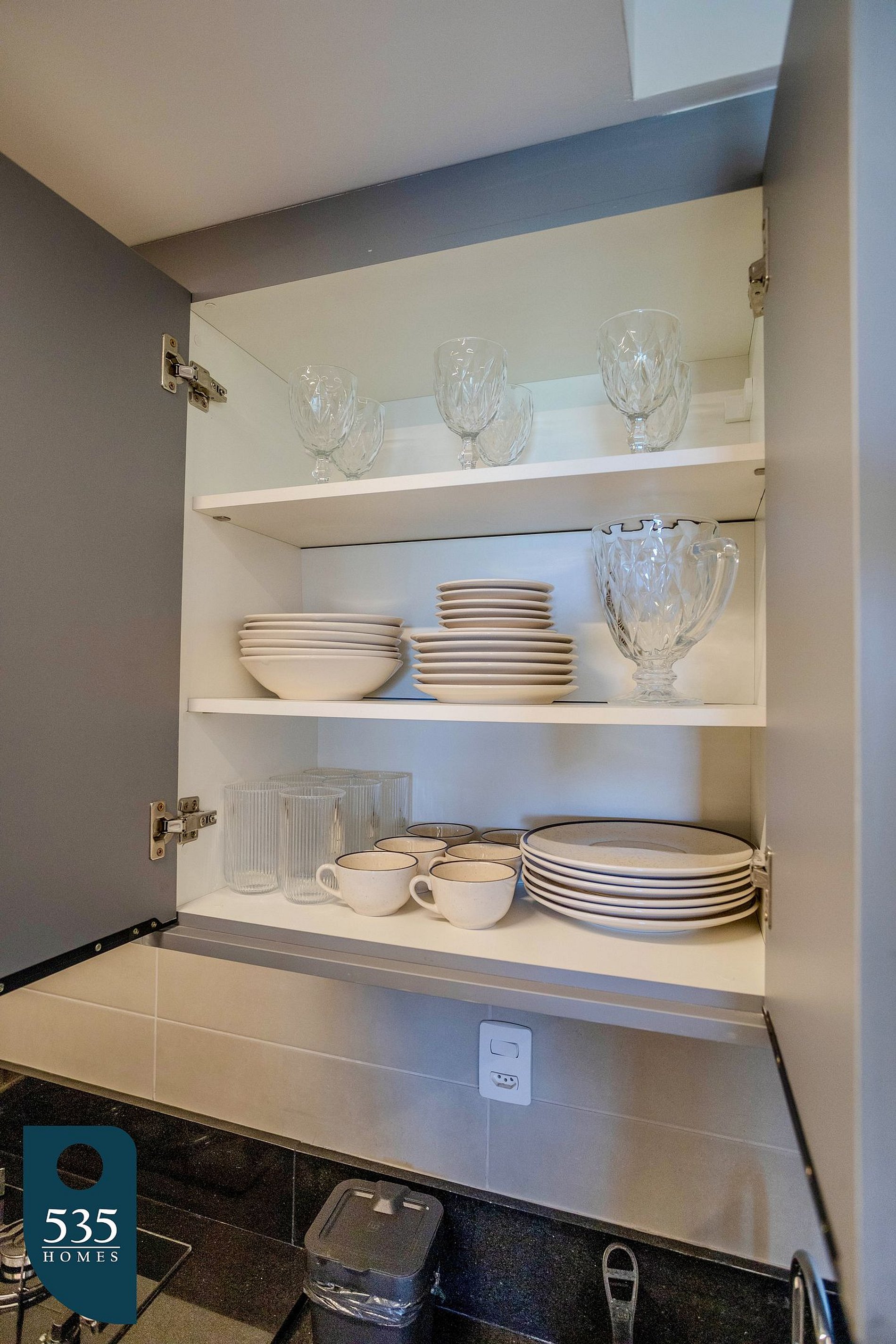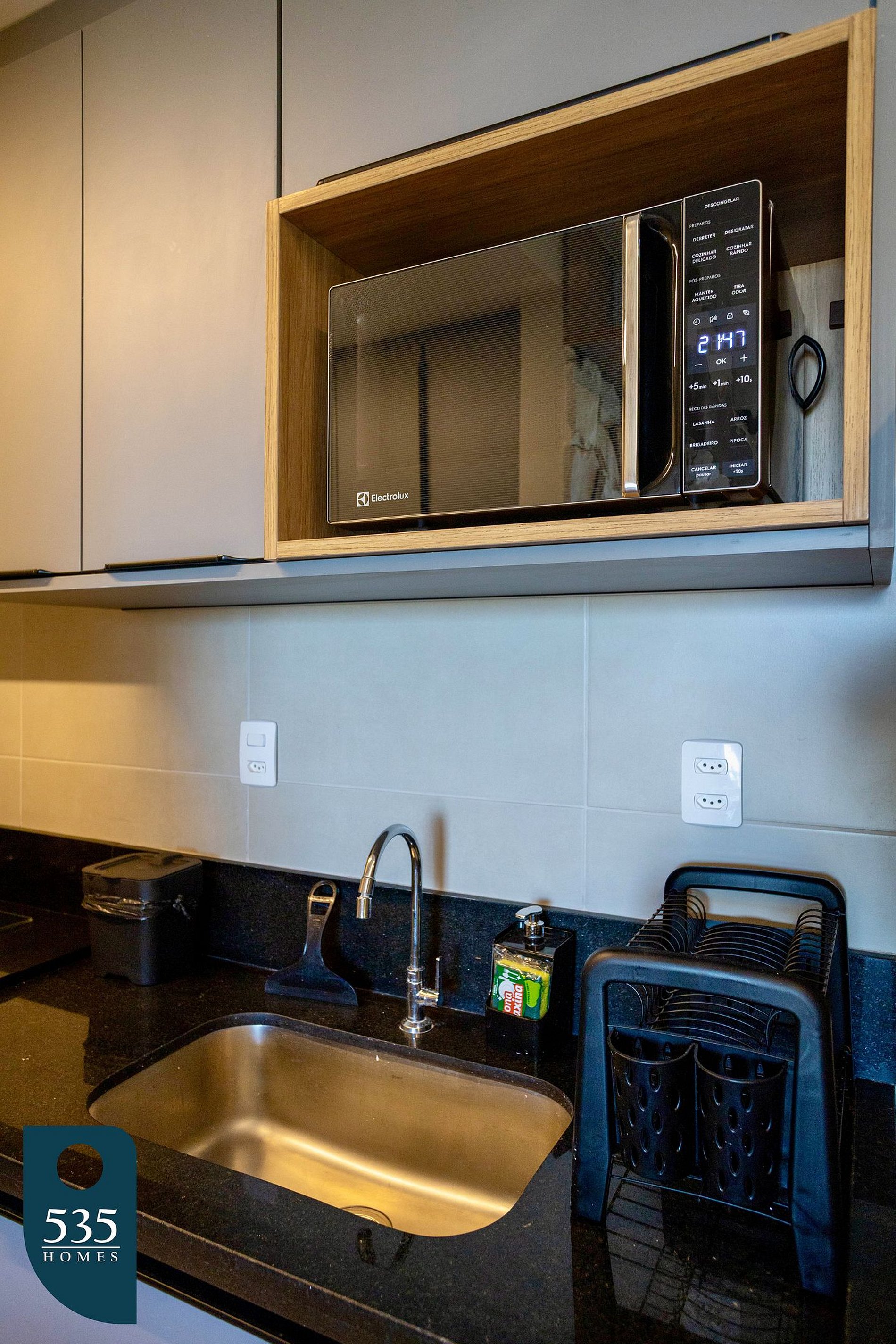 A cozinha é completa, equipada com geladeira, micro-ondas, forno, cooktop elétrico com quatro bocas, liquidificador, airfryer, sanduicheira, máquina de café, cafeteira elétrica, bebedouro, jogo de panelas com tampa, ferro elétrico com mesa de passar roupa e máquina de lavar e secar roupa, garantindo total funcionalidade no dia a dia.