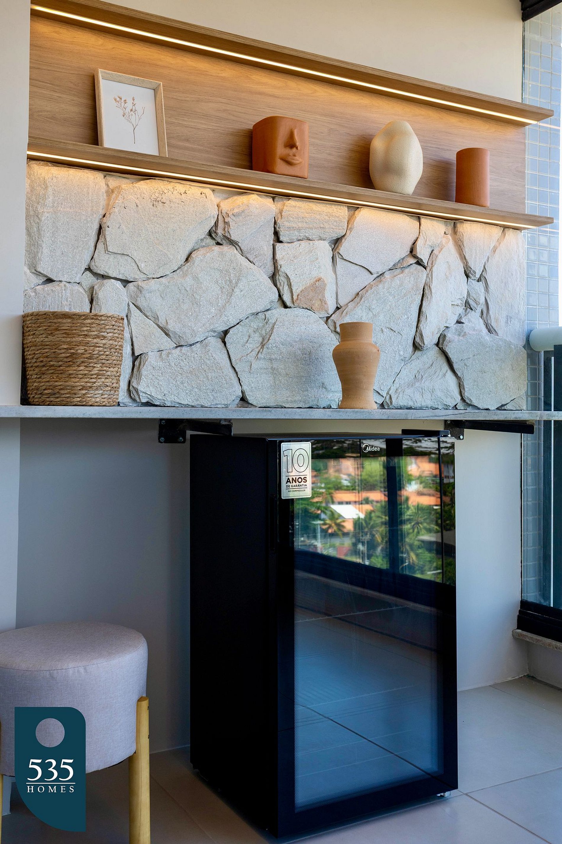 A varanda conta com mesa para refeição, fechamento com cortina de vidro e cervejeira, ideal para momentos de descanso.