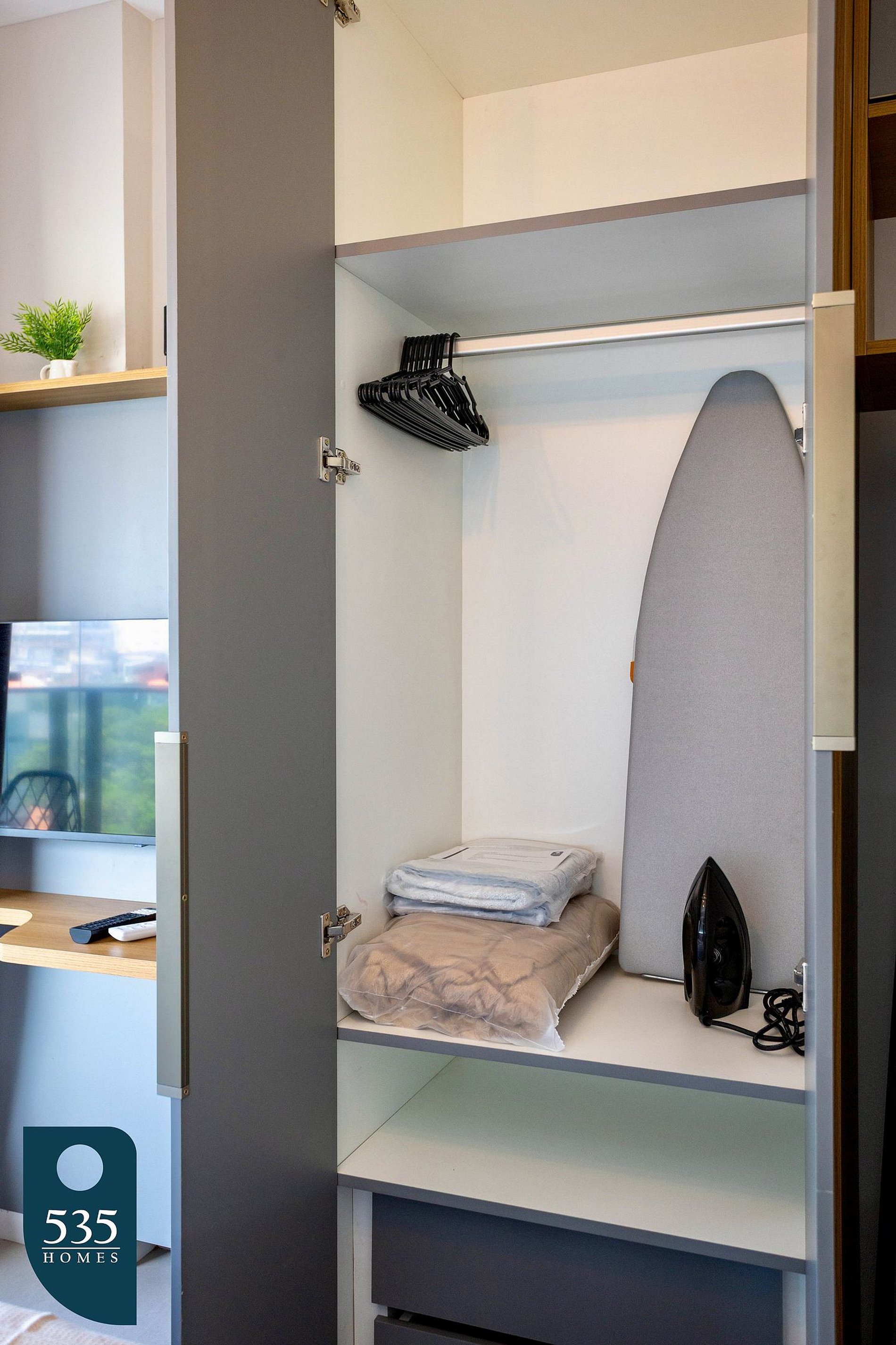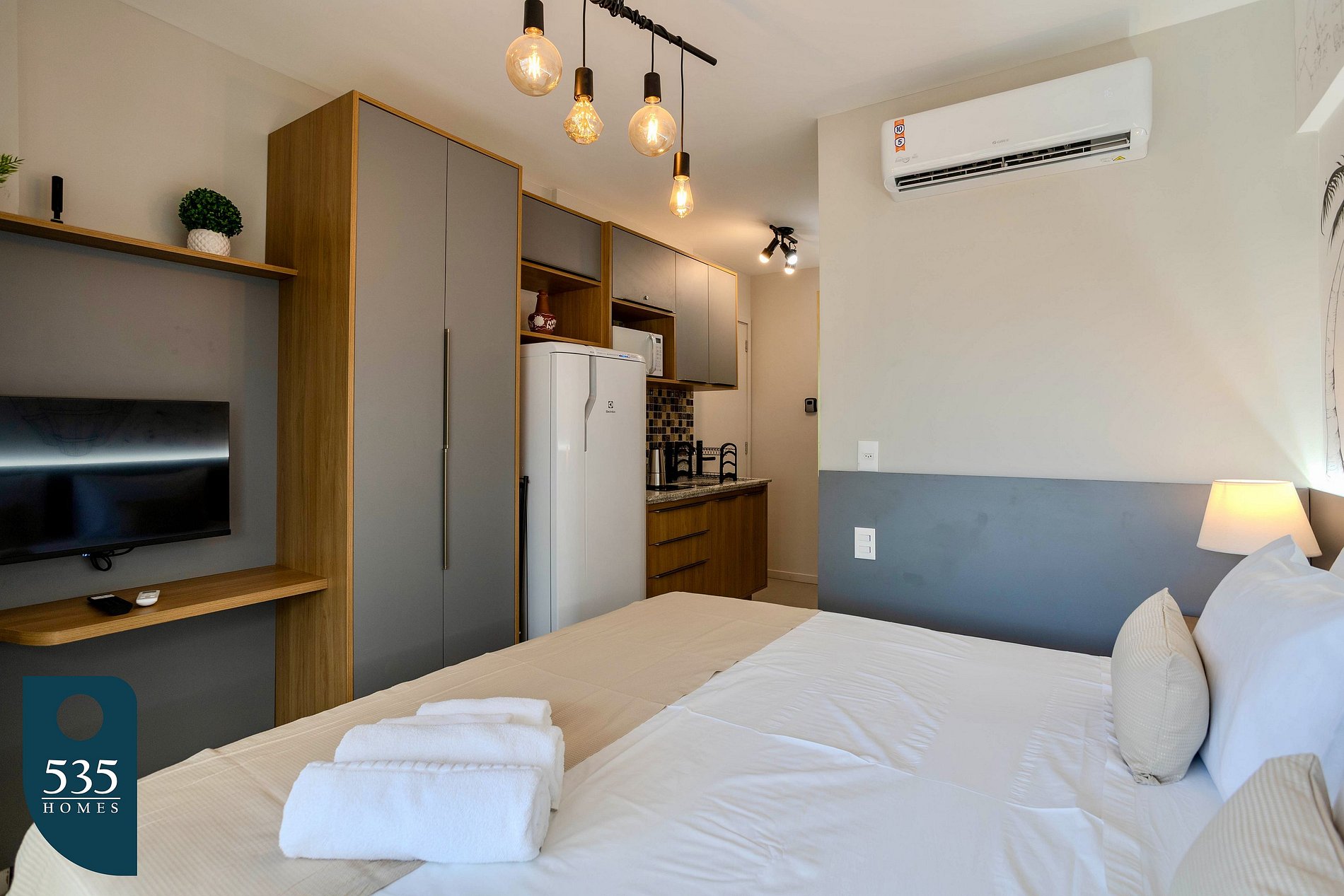 No quarto, há ar-condicionado, cortina blackout, Smart TV de 32 polegadas, ferro elétrico com mesa de passar roupa compacta e luminária de mesa, oferecendo conforto e funcionalidade.