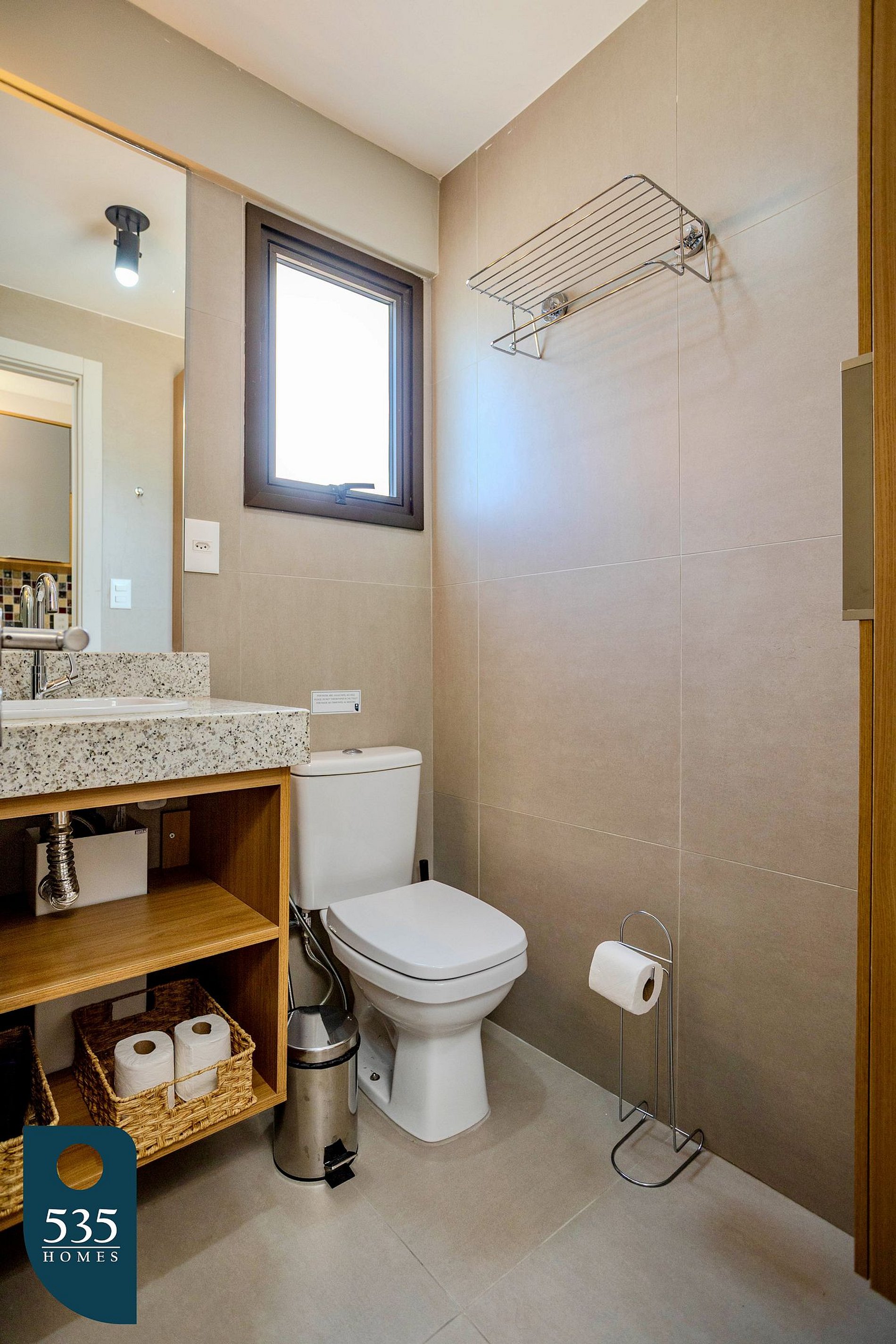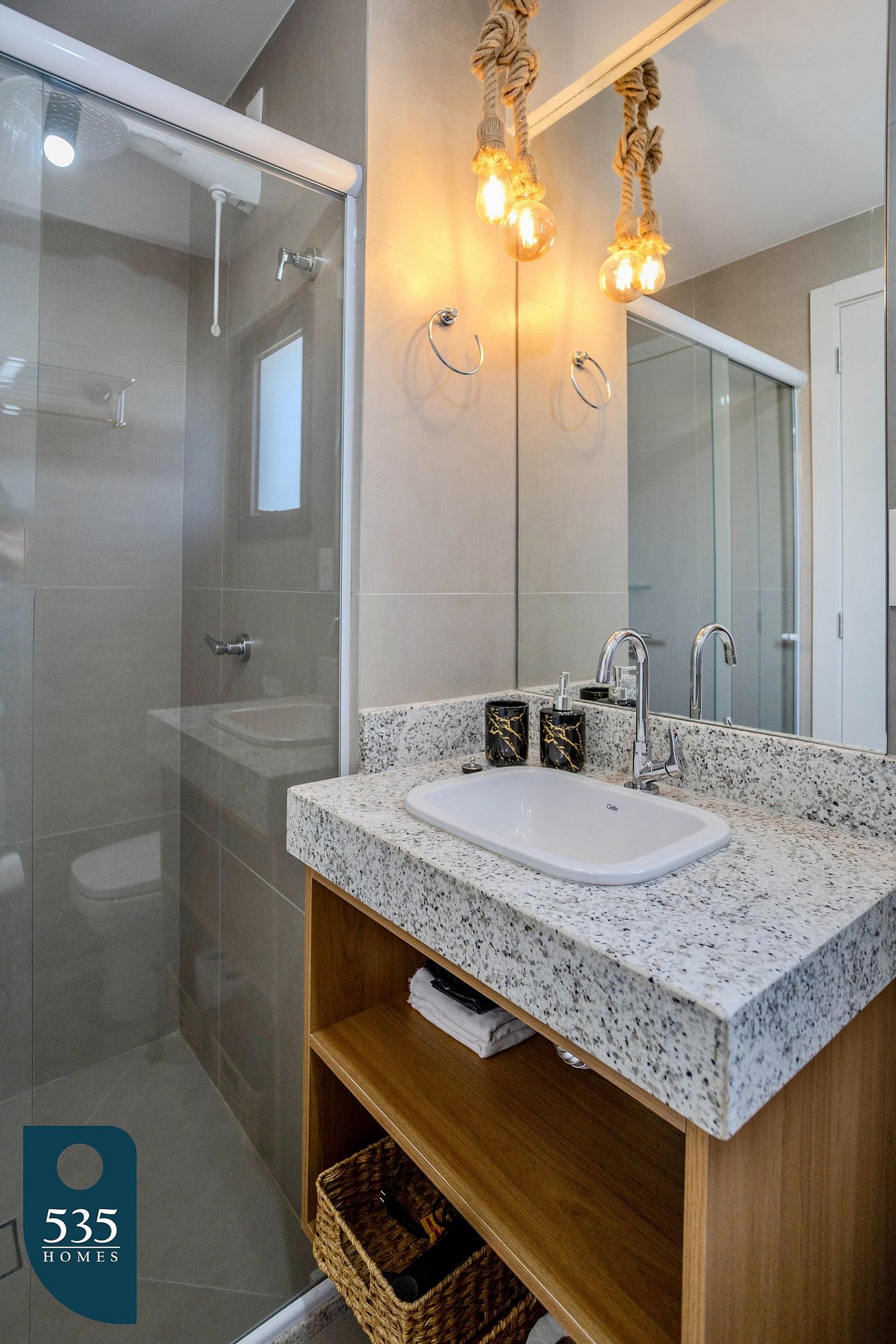 O banheiro dispõe de secador de cabelo, chuveiro elétrico e janela, proporcionando boa ventilação.